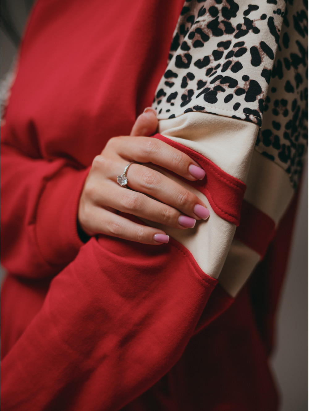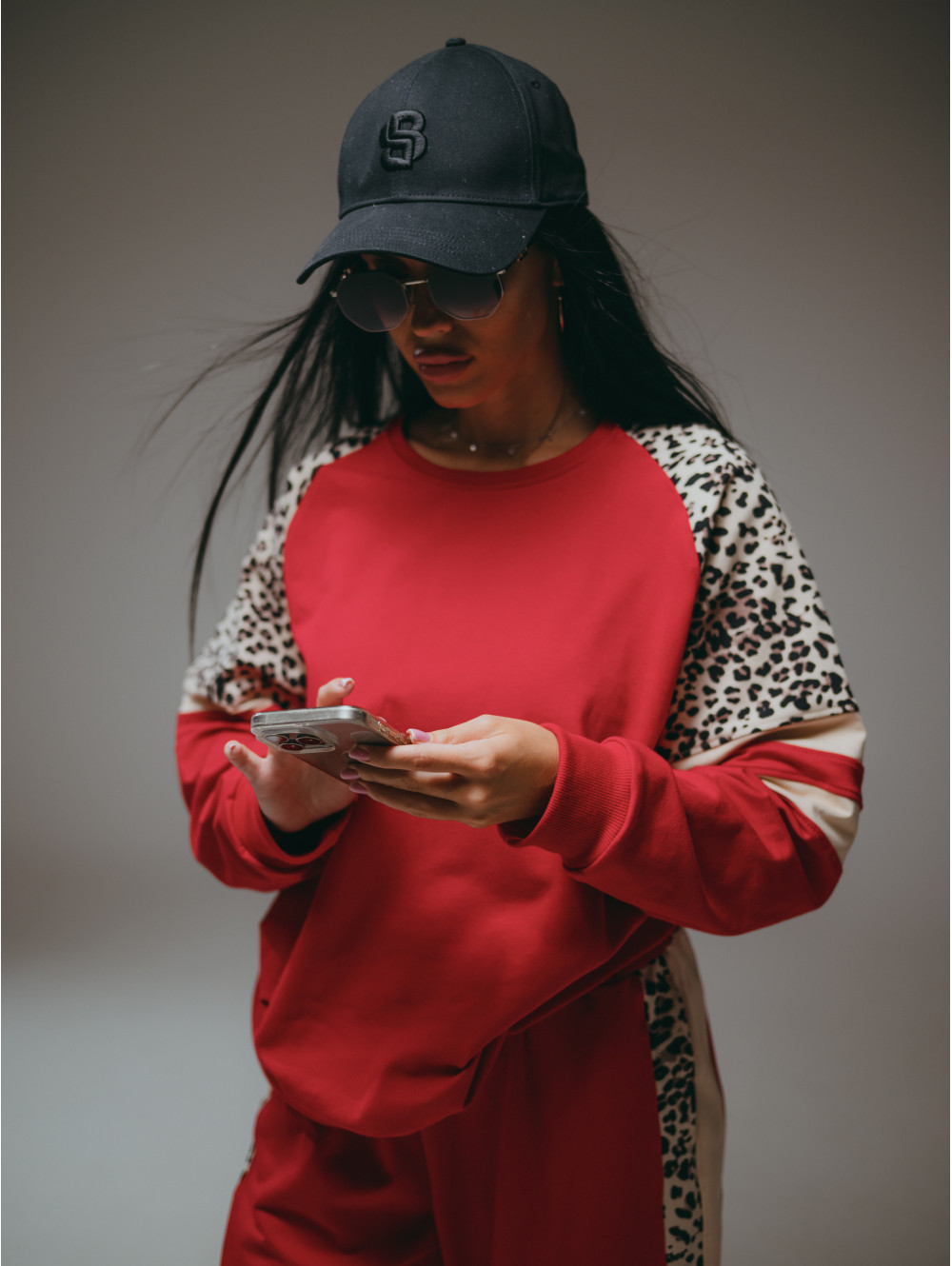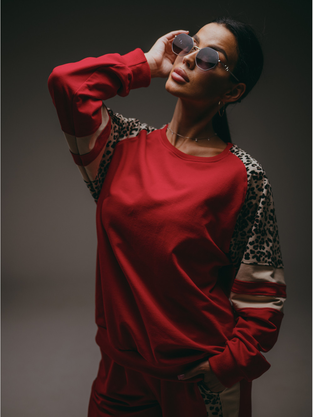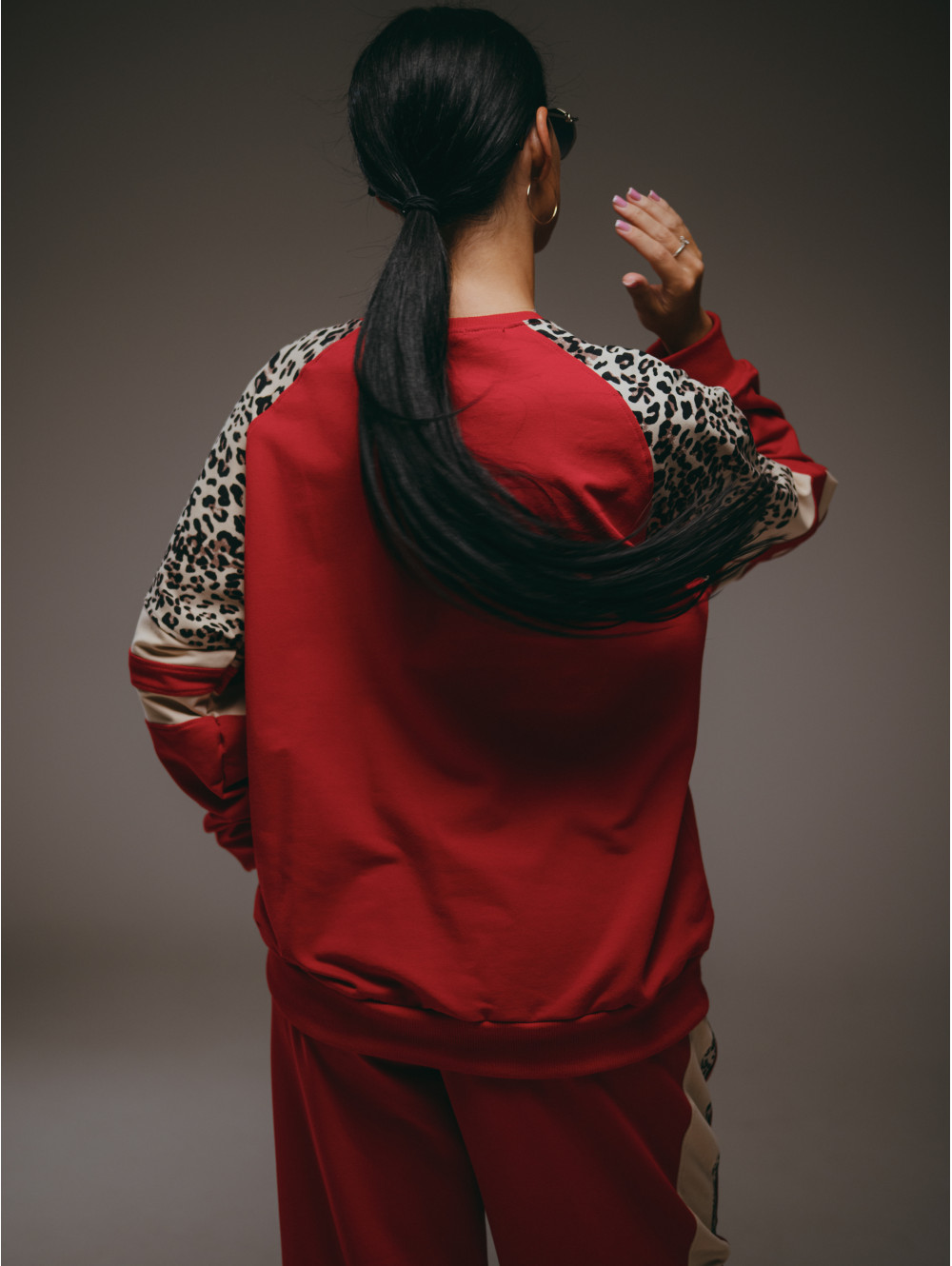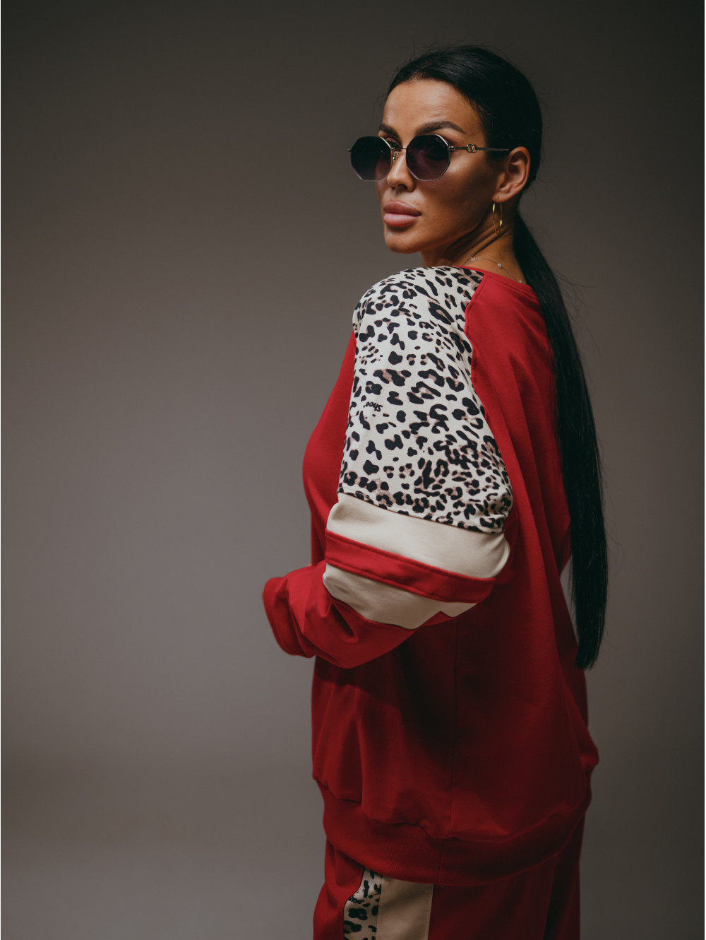 Костюм Хлоя состоит из свитшота и брюк. Свитшот прямого силуэта с рукавом реглан со вставками. Брюки на поясе с двумя боковыми прорезными карманами.