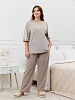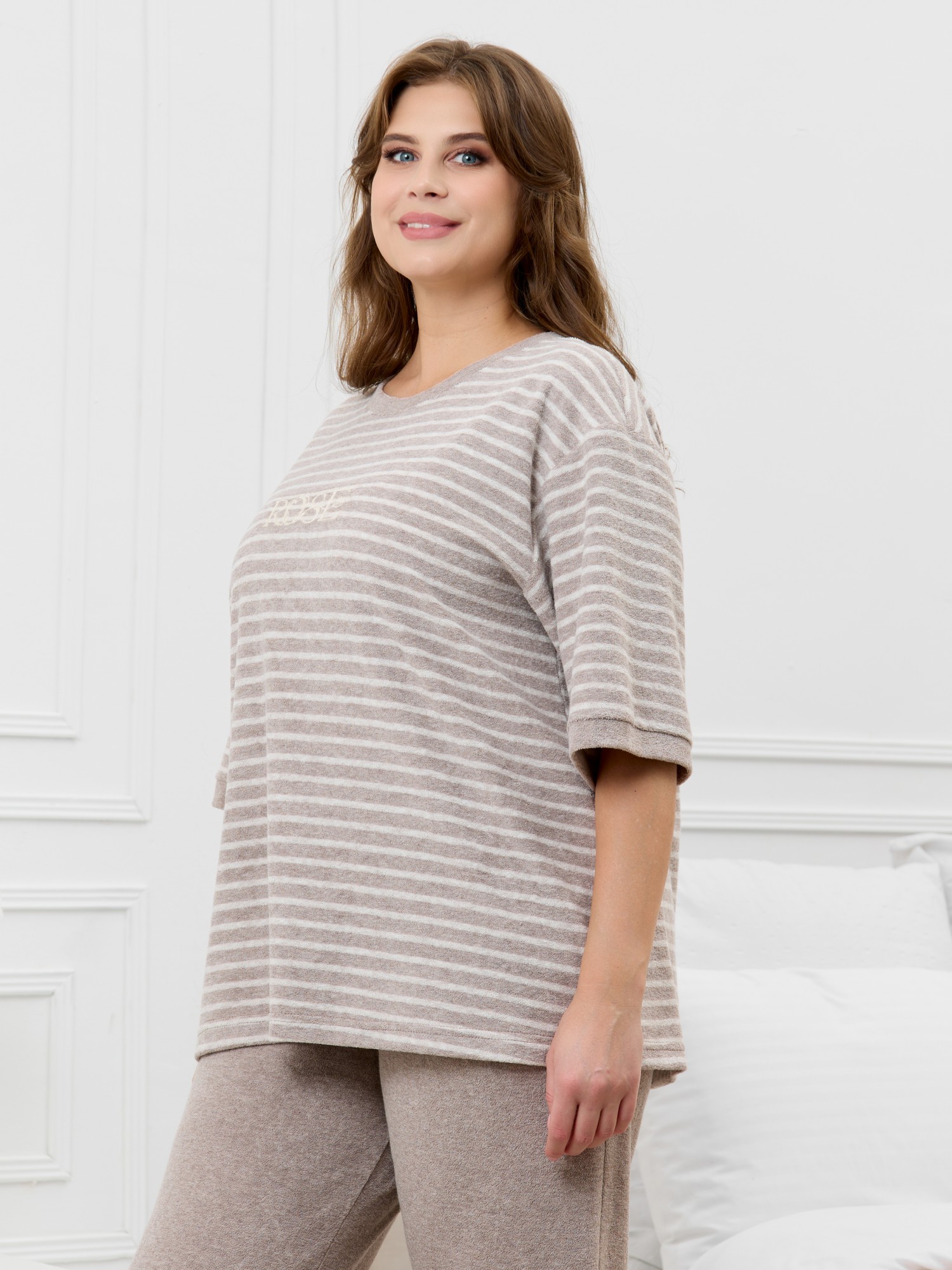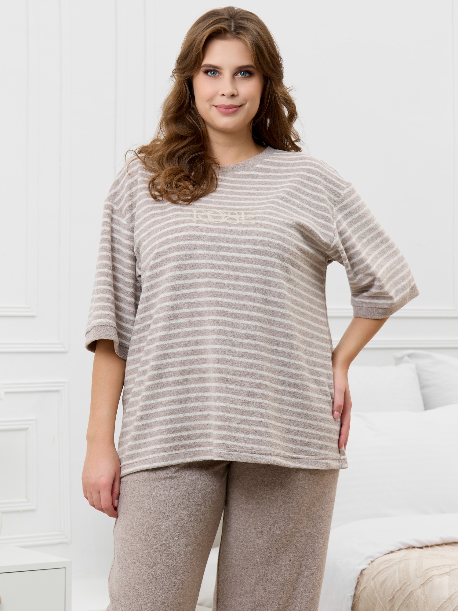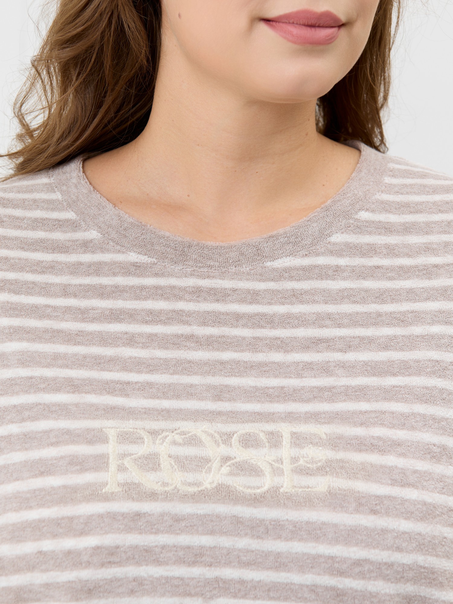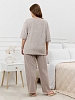 Костюм женский из трикотажного полотна «махра» в комбинации двух видов в единой цветовой гамме, состоящий из футболки и брюк. Футболка – из полотна в « полоску», с втачными короткими рукавами, горловиной овальной формы, обработанной втачной планкой и вышивкой по центру переда. Планка горловины и манжеты на рукавах выполнены из контрастного полотна «махра меланж».Брюки – из полотна «махра меланж» классического покроя, с карманами в боковых швах, на притачном поясе с эластичной тесьмой внутри.