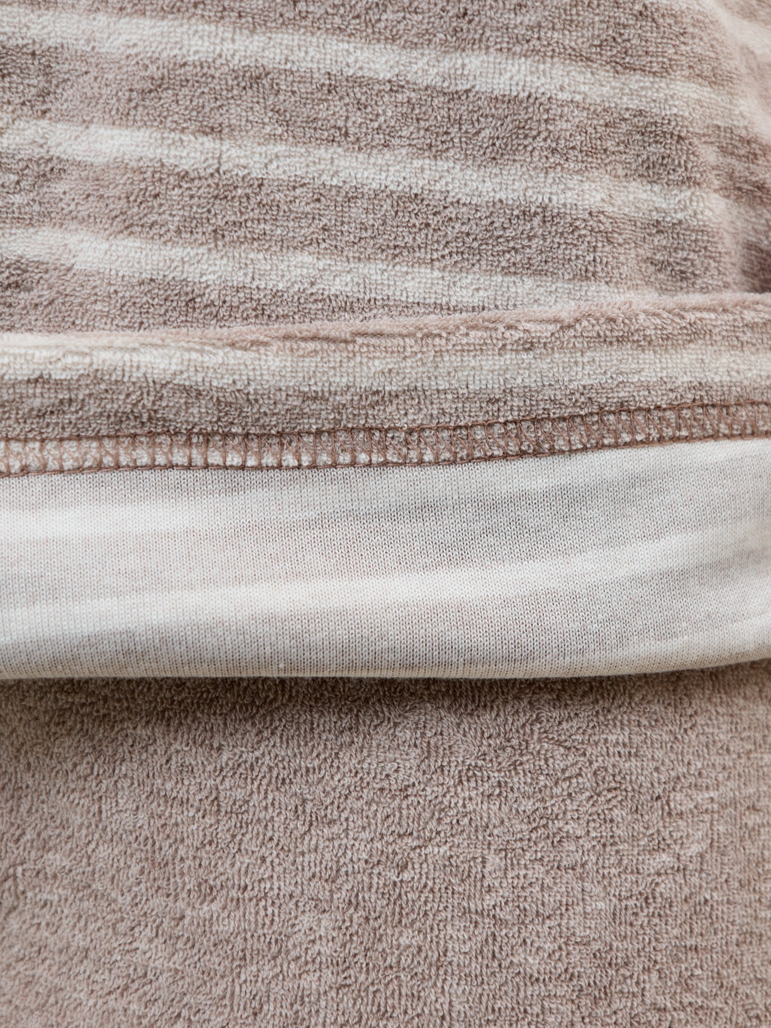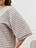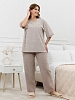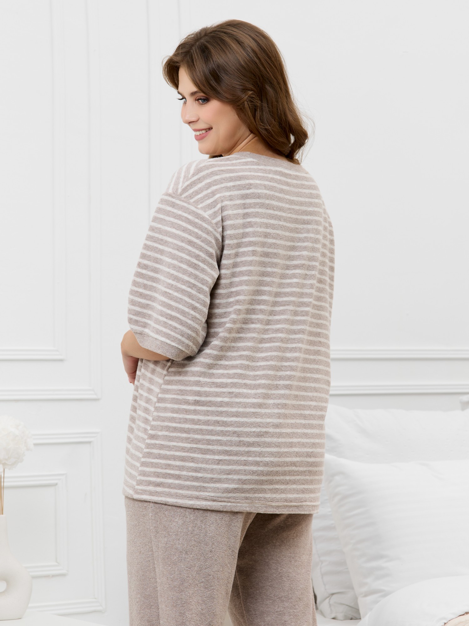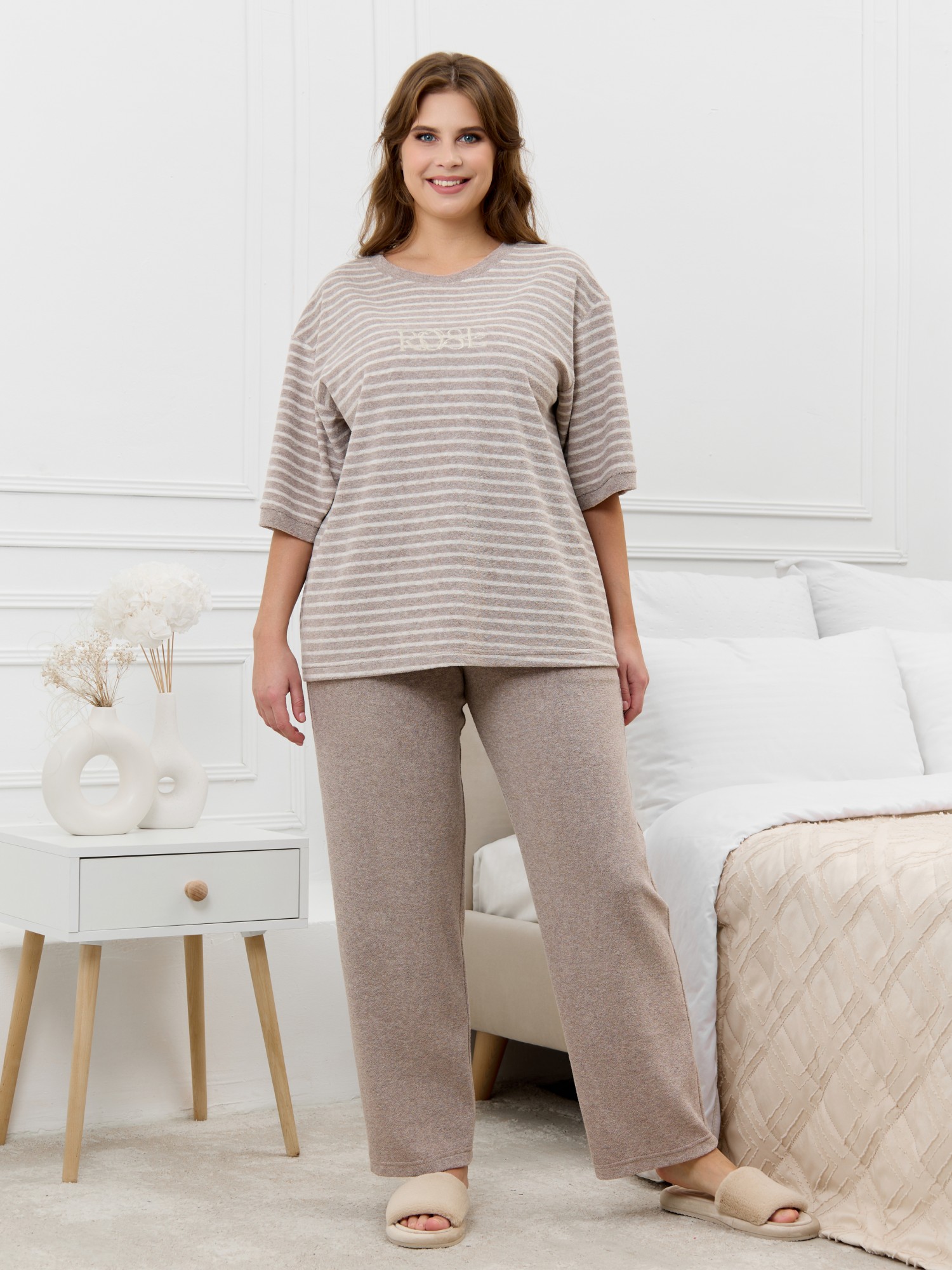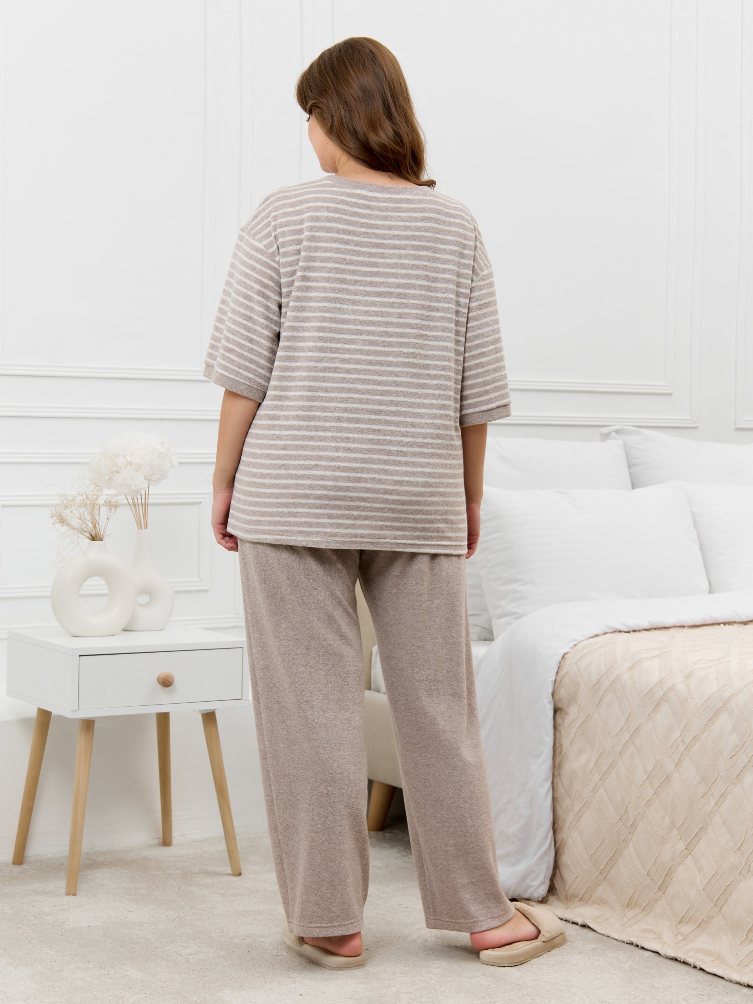 Костюм женский из трикотажного полотна «махра» в комбинации двух видов в единой цветовой гамме, состоящий из футболки и брюк. Футболка – из полотна в « полоску», с втачными короткими рукавами, горловиной овальной формы, обработанной втачной планкой и вышивкой по центру переда. Планка горловины и манжеты на рукавах выполнены из контрастного полотна «махра меланж».Брюки – из полотна «махра меланж» классического покроя, с карманами в боковых швах, на притачном поясе с эластичной тесьмой внутри.