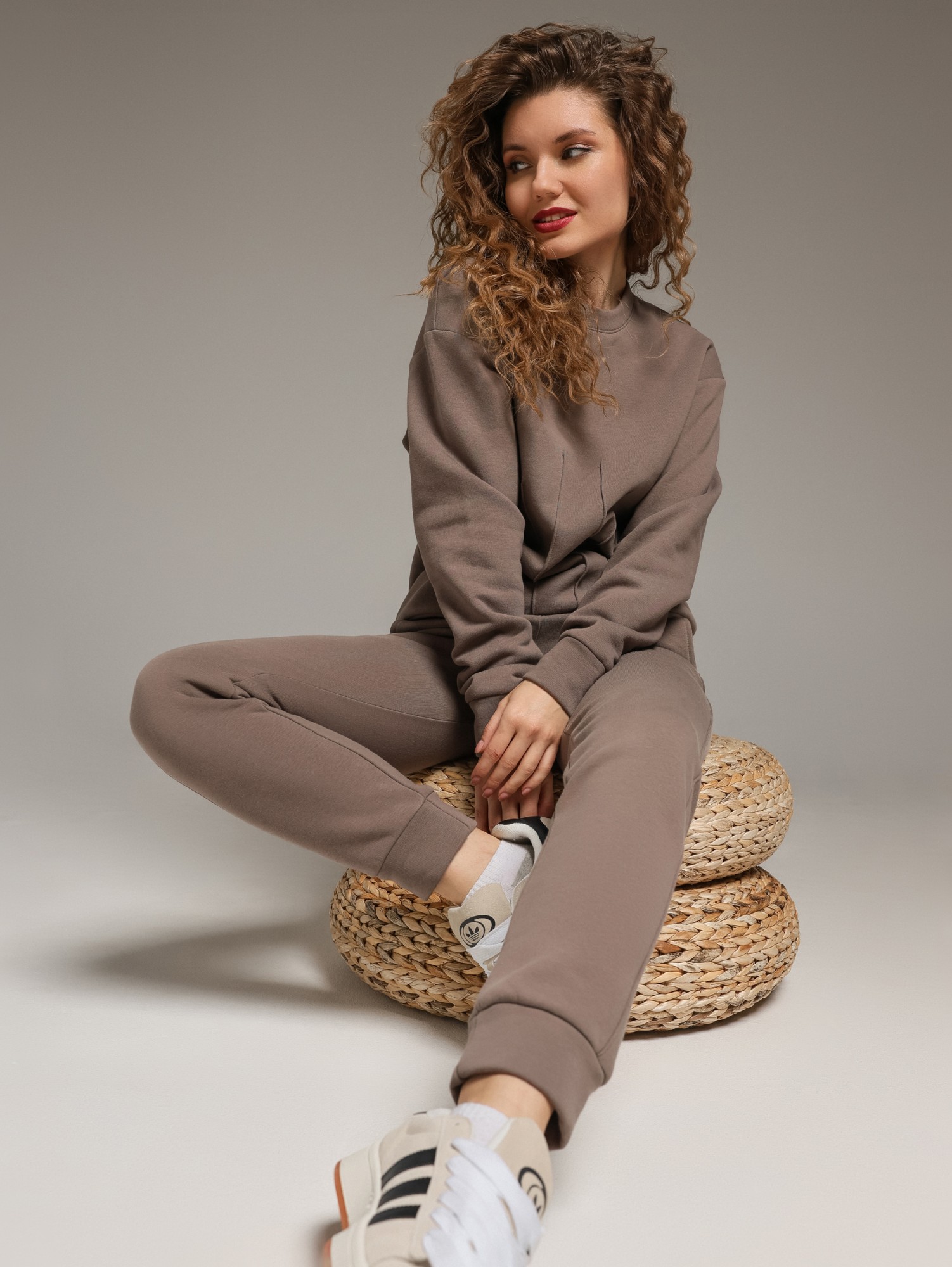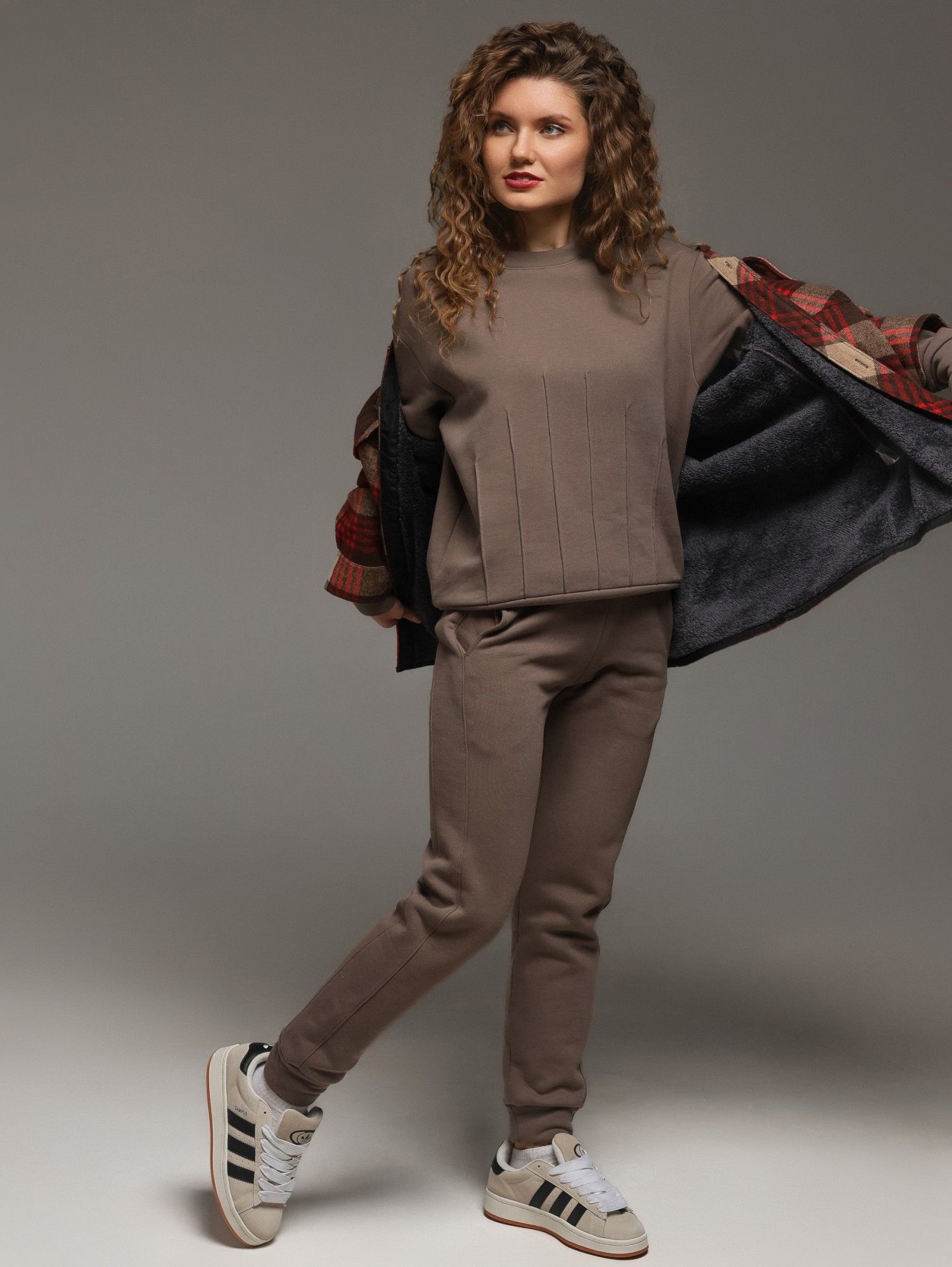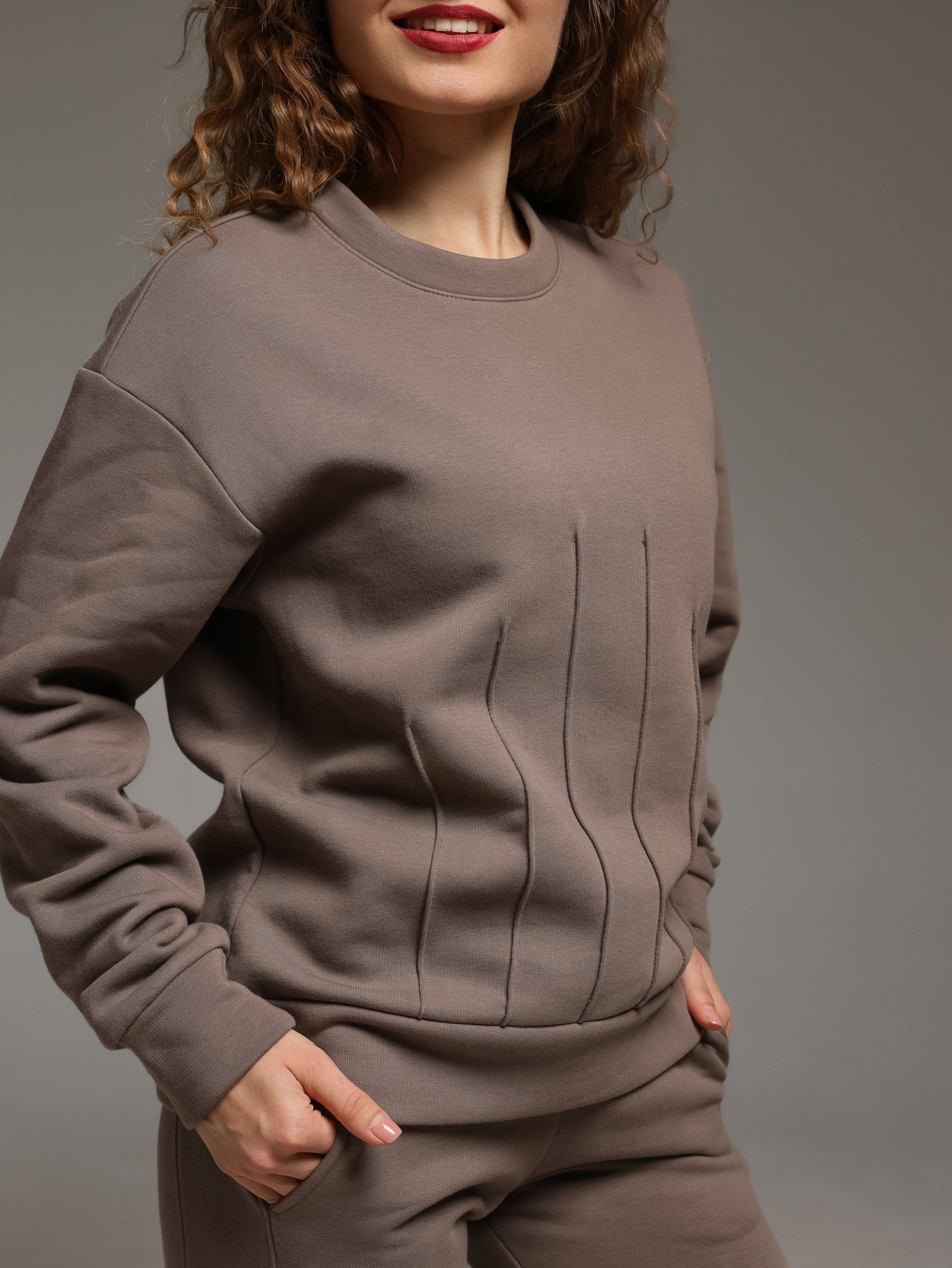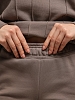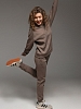 Костюм молодежный из гладкокрашеного трикотажного полотна «футер- трехнитка», состоящий из джемпера и брюк овальной формы, обработанной втачной планкой и притачным поясом по низу. Рукава – с притачными манжетами. Манжеты, планка горловины и пояс выполнены из полотна «кашкорсе» такого же цвета, как и основной материал. На полочке застрочены декоративные складочки-защипы, расположенные симметрично относительно линии центра. Брюки – длинные, на притачном поясе с эластичной тесьмой внутри и манжетами по низу. Передние половины – из двух частей каждая, со смещением соединительных швов в сторону боковых срезов. Соединительные швы передних половин обработаны с карманами. Пояс и манжеты выполнены из трикотажного полотна «кашкорсе».