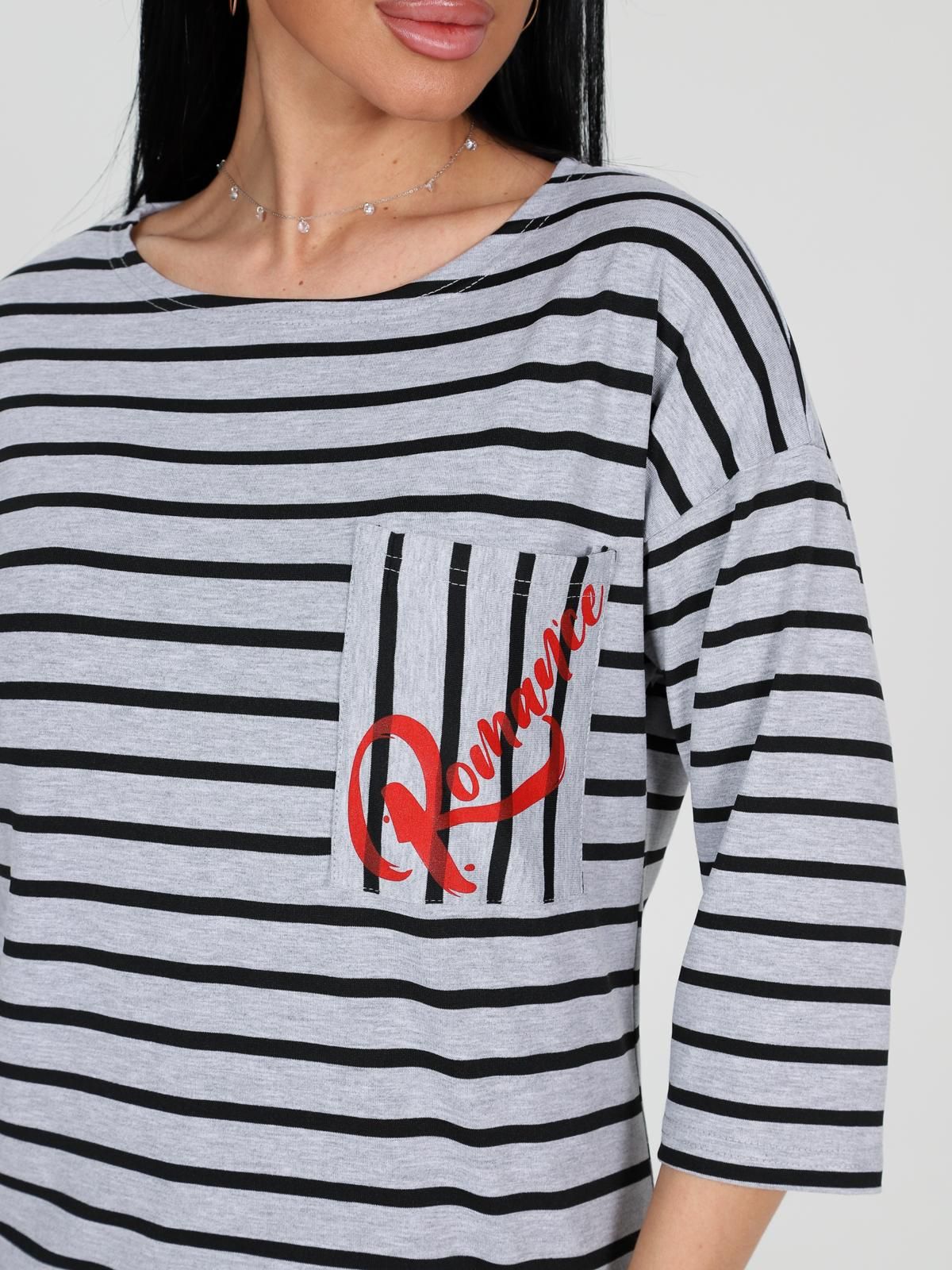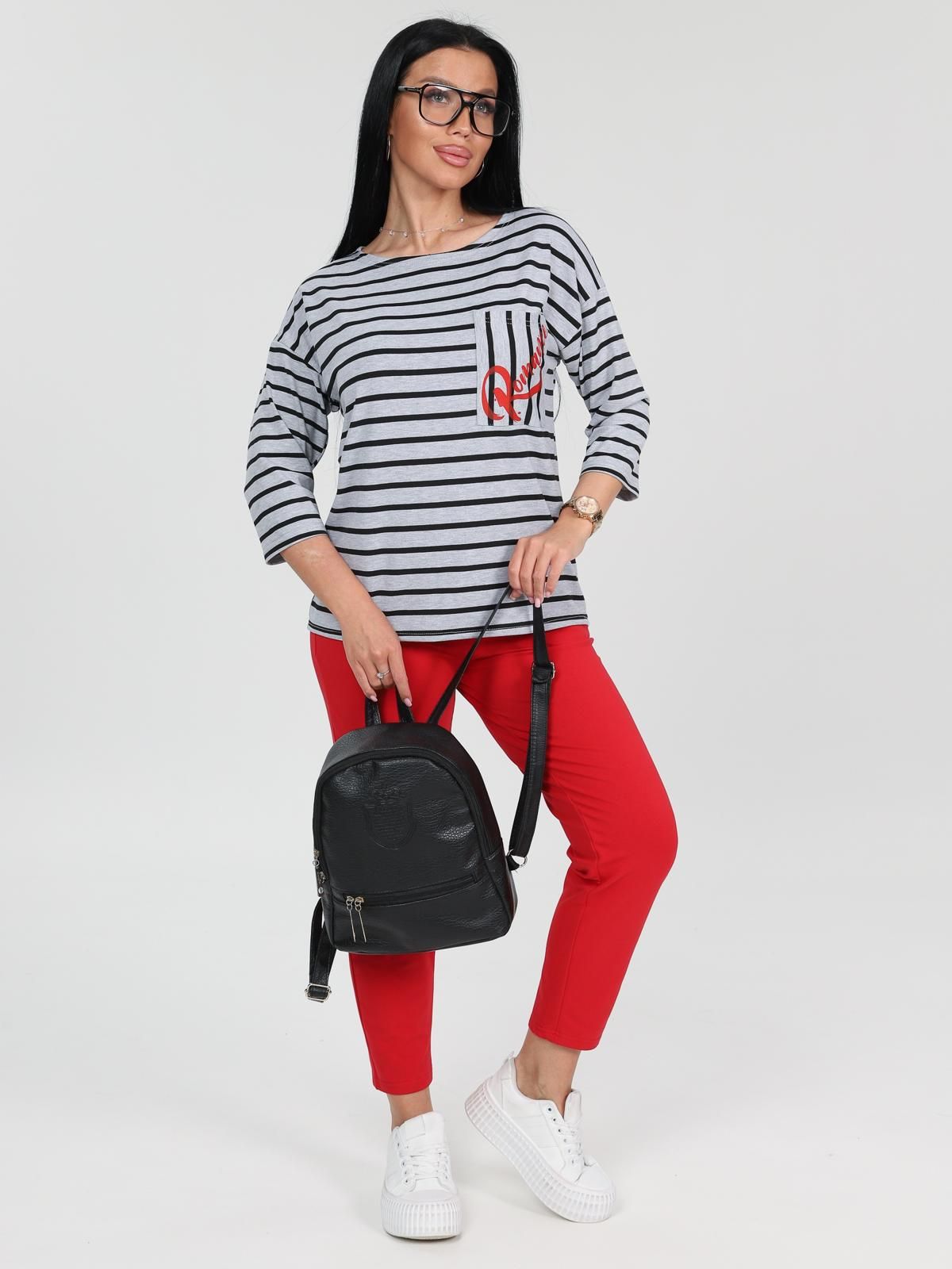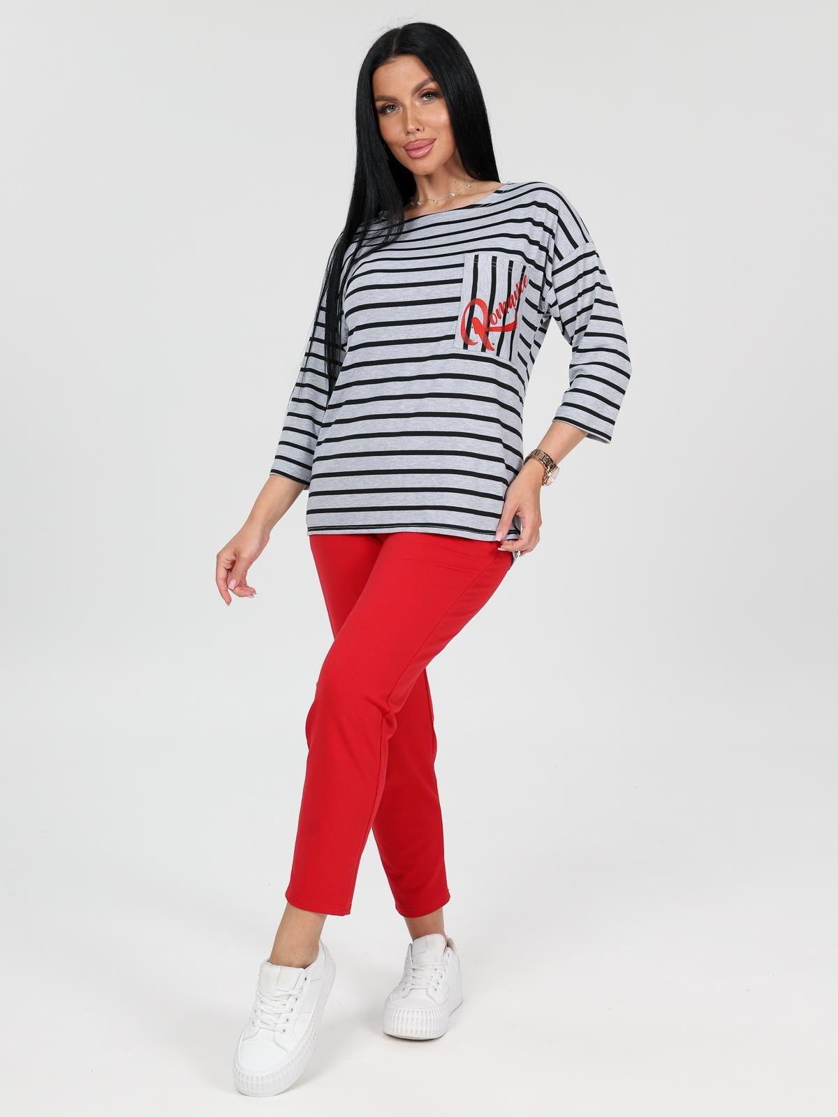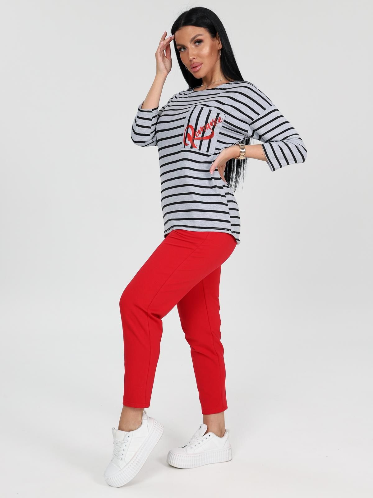 Женский костюм состоит из футболки и брюк. Брюки длиной 7/8 с карманами в боковых швах. Футболка удлинённая прямого силуэта со скруглённой линией низа спинки. Рукав длиной 3/4. На полочке кармашек с принтом в цвет брюк.