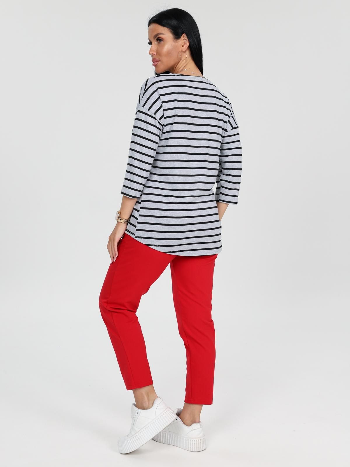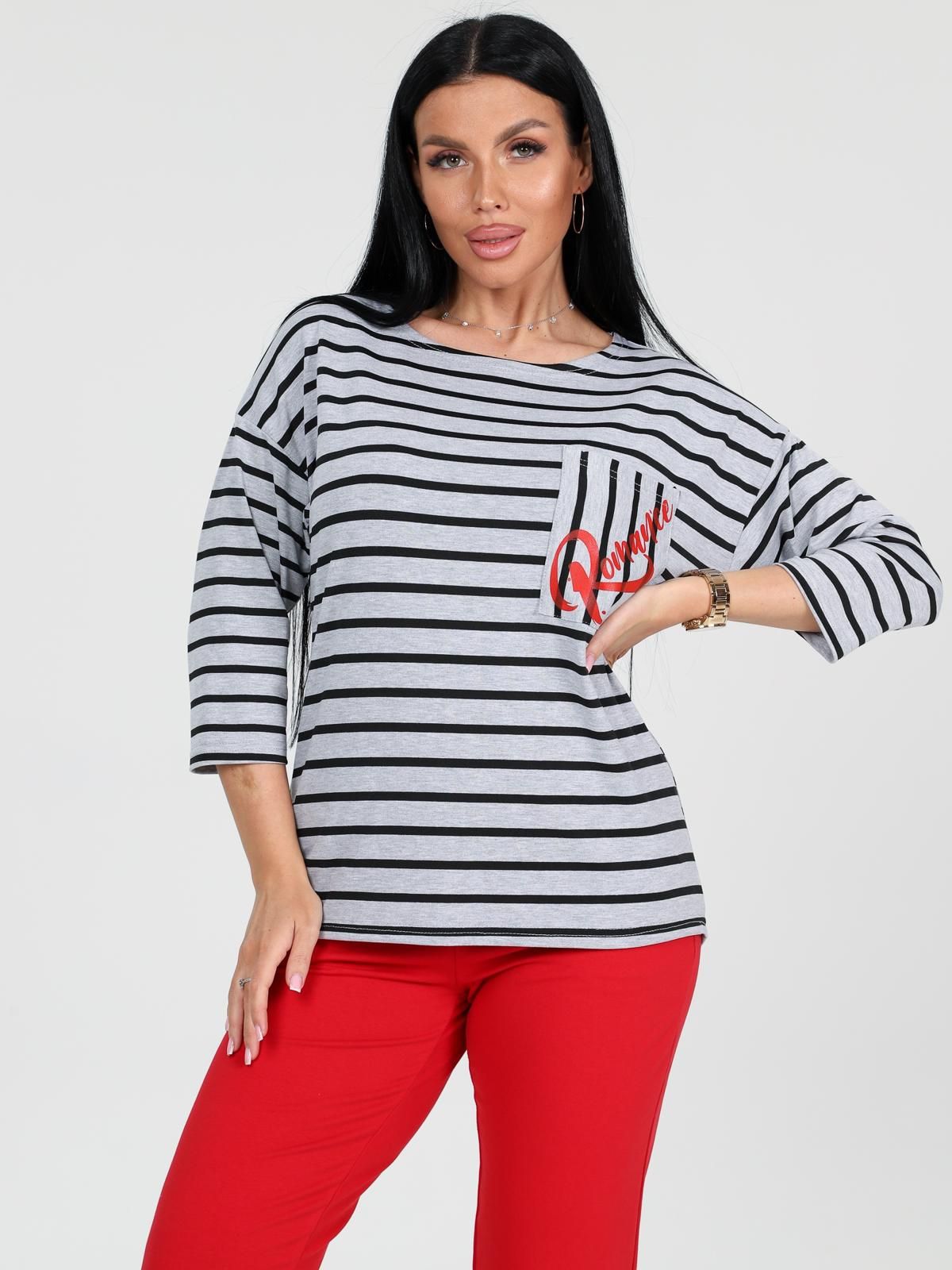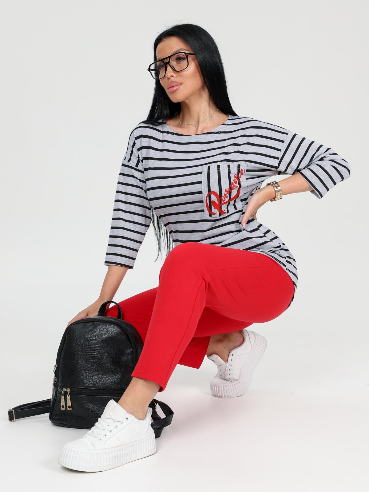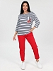 Женский костюм состоит из футболки и брюк. Брюки длиной 7/8 с карманами в боковых швах. Футболка удлинённая прямого силуэта со скруглённой линией низа спинки. Рукав длиной 3/4. На полочке кармашек с принтом в цвет брюк.