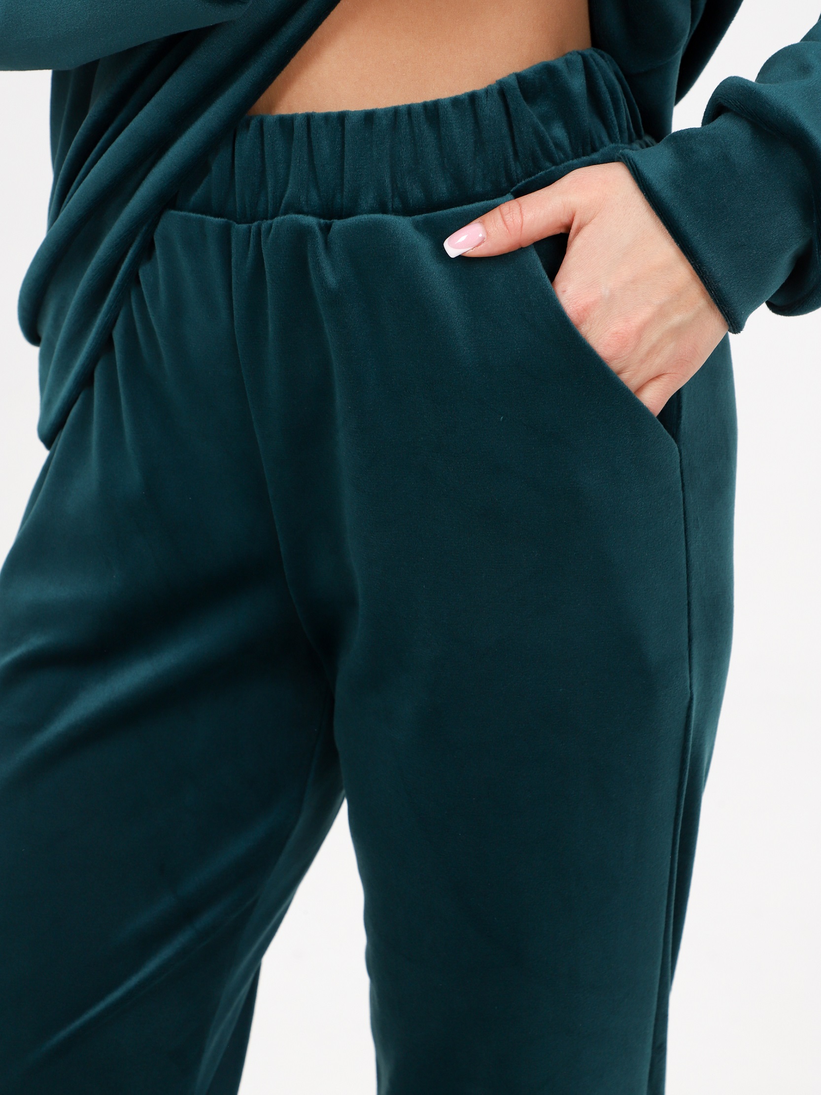 Велюровый костюм - это великолепное сочетание уюта, тепла и стиля, которое идеально подходит для дома. Костюм состоит из худи свободного кроя с длинным рукавом на манжете и брюк прямого кроя с карманами и манжетами внизу.