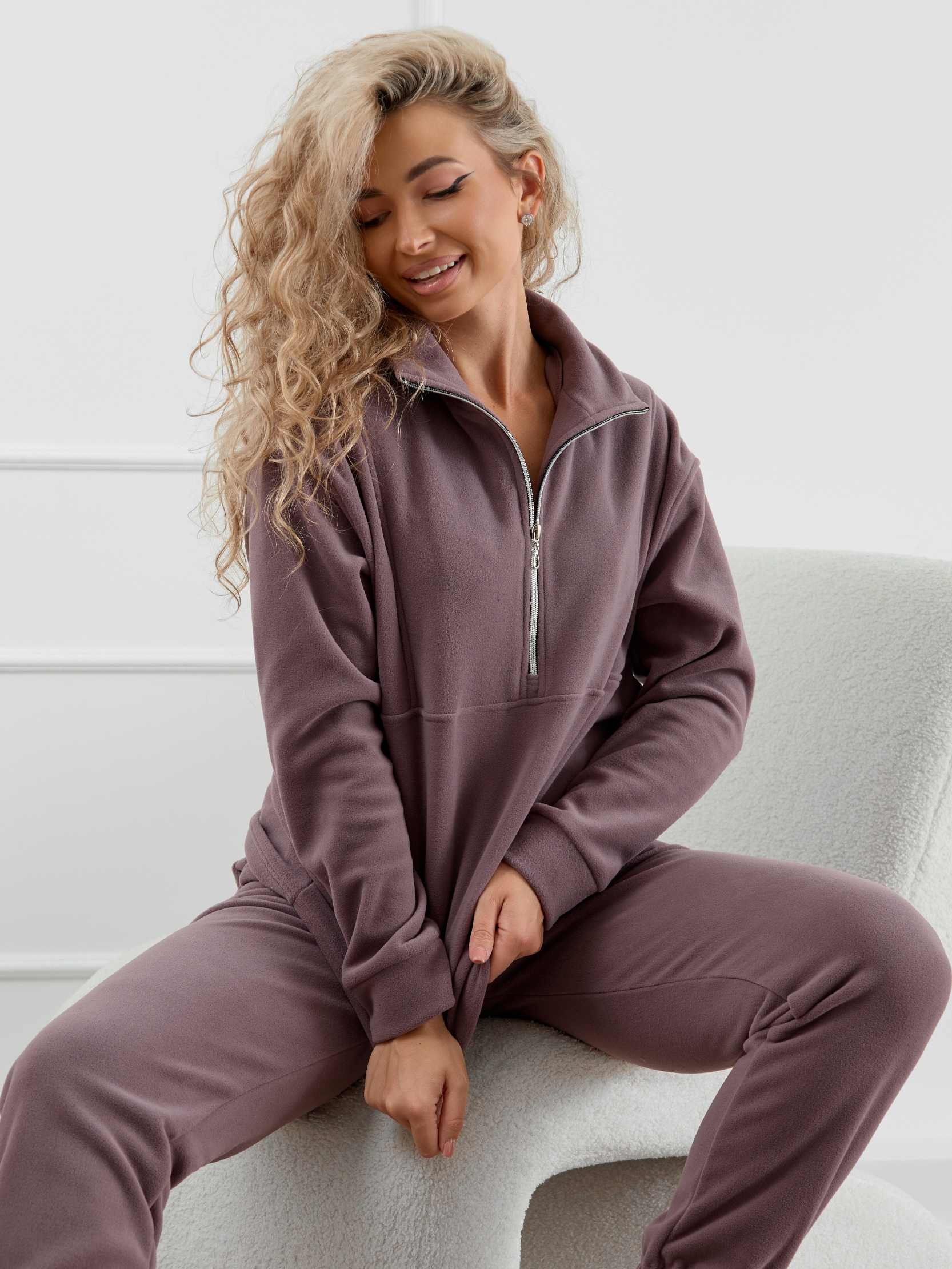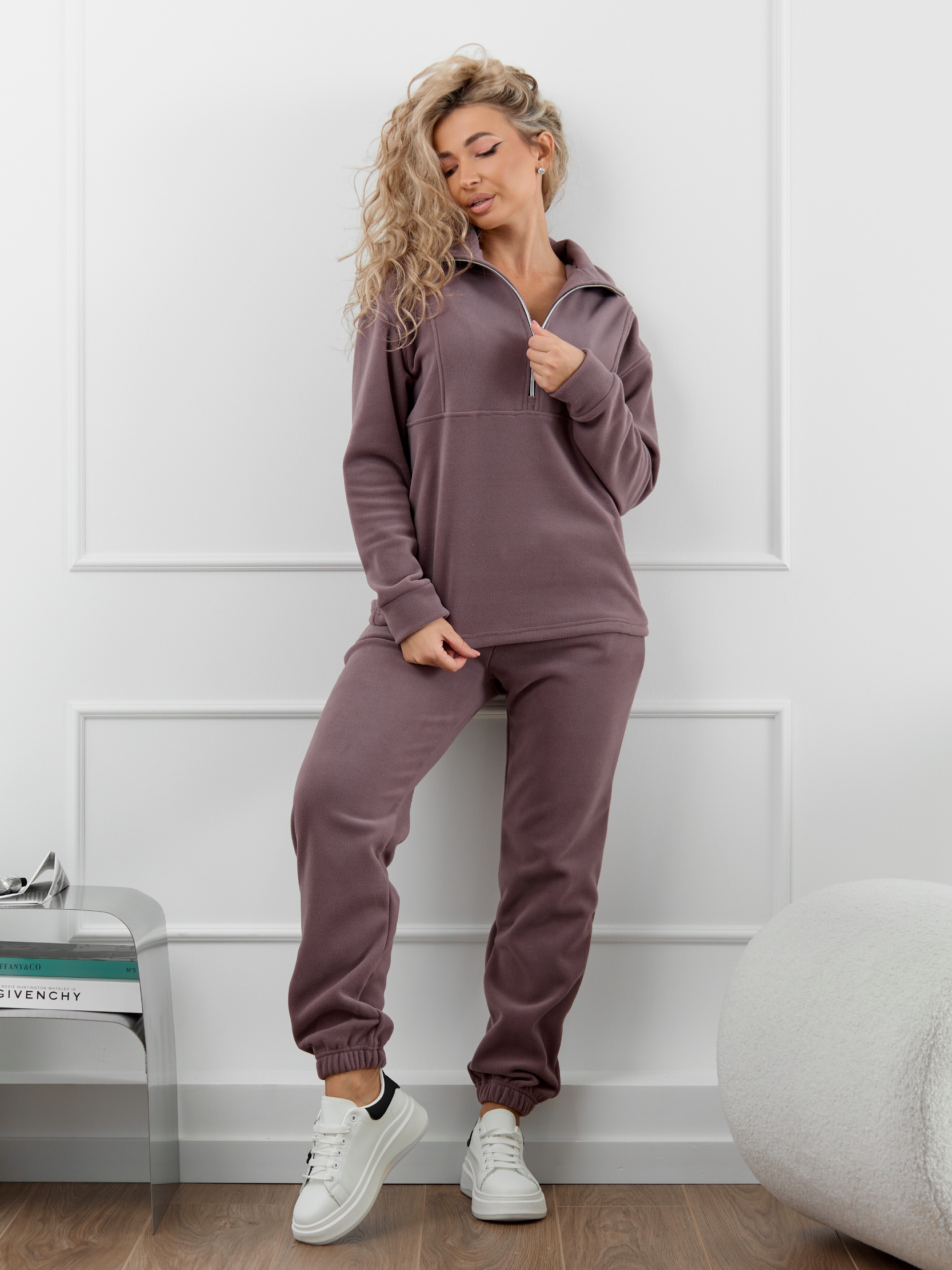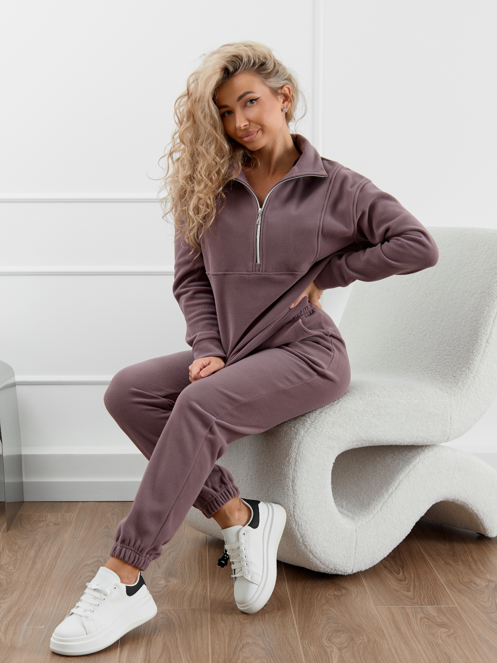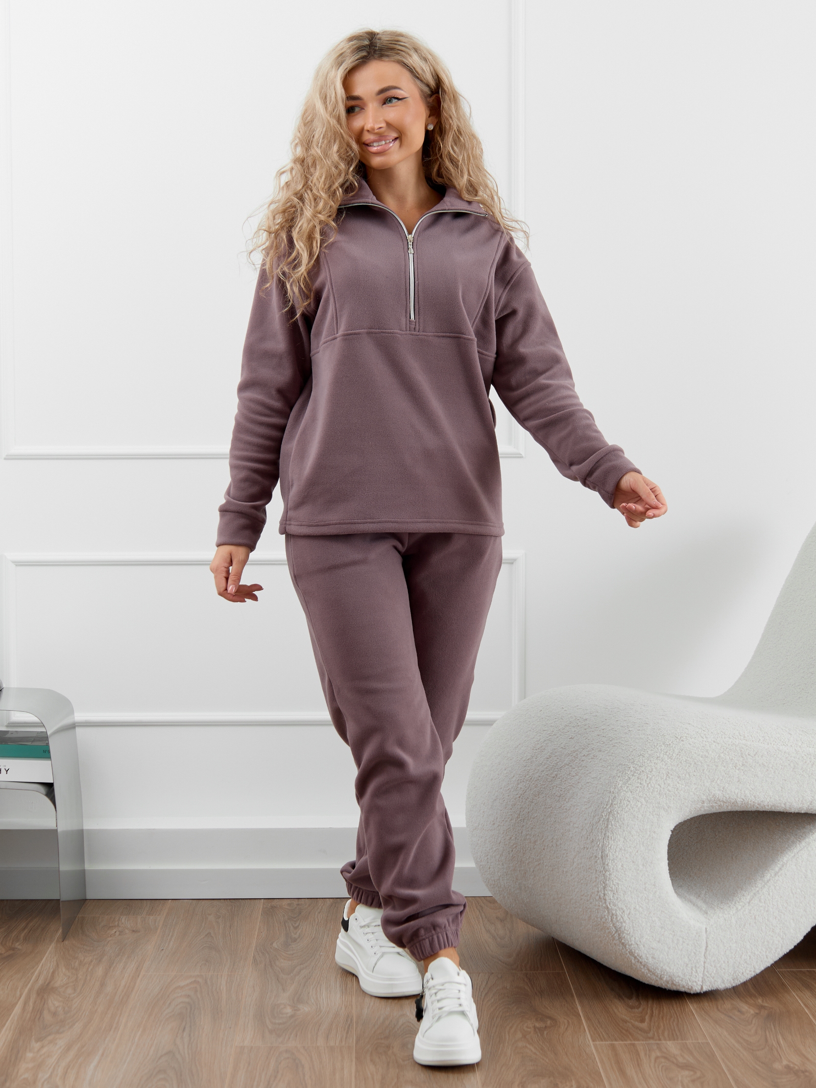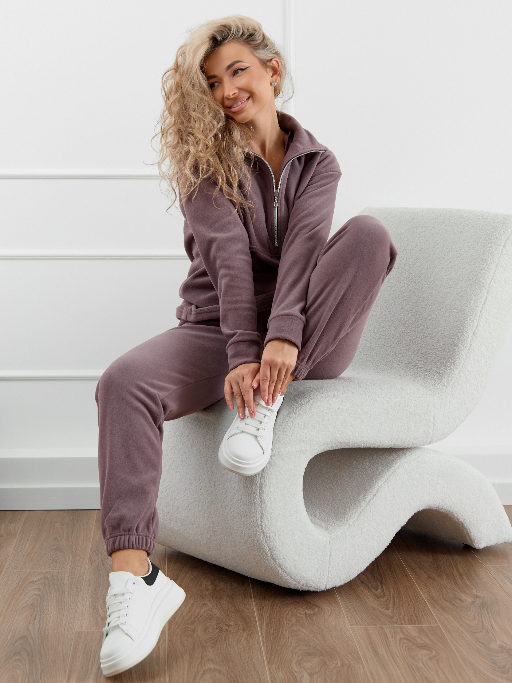 Женский флисовый костюм состоит из толстовки с воротником-стойкой на молнии и брюк джоггеров. Костюм сидит свободно и не сковывает движения, что делает его идеальным вариантом для активного образа жизни.