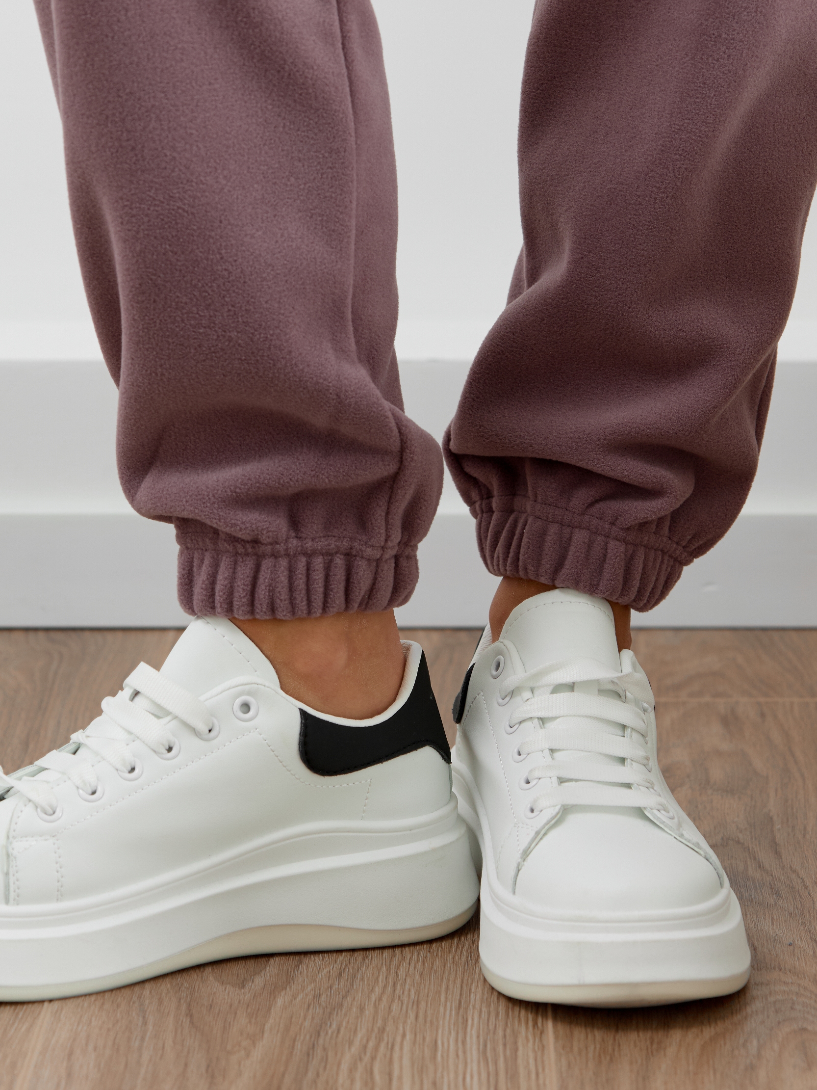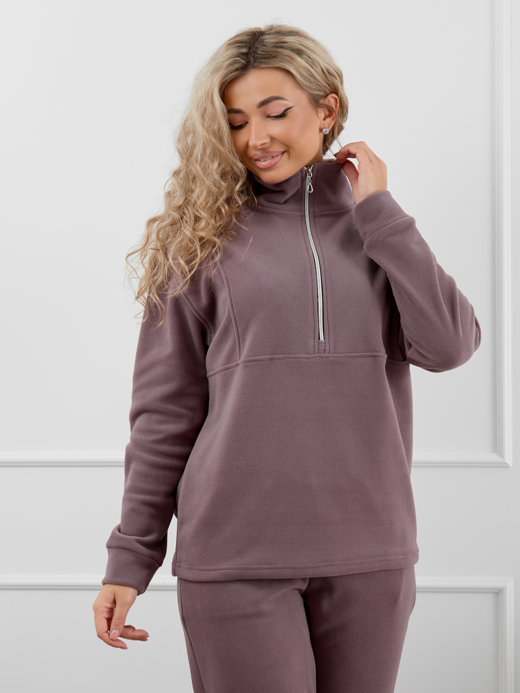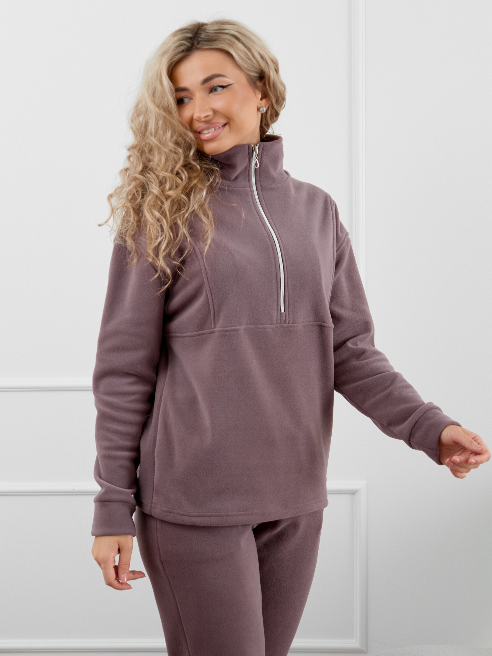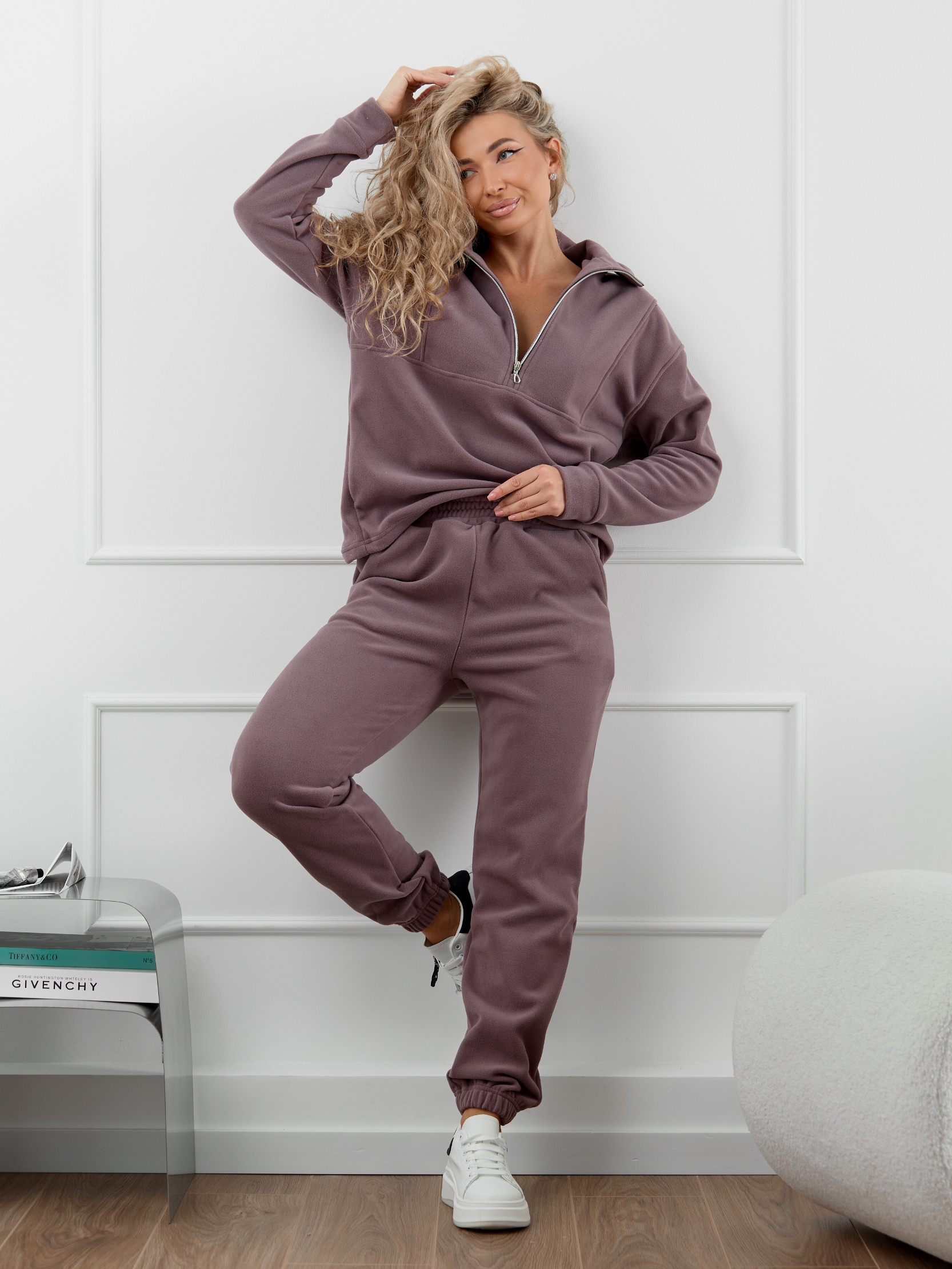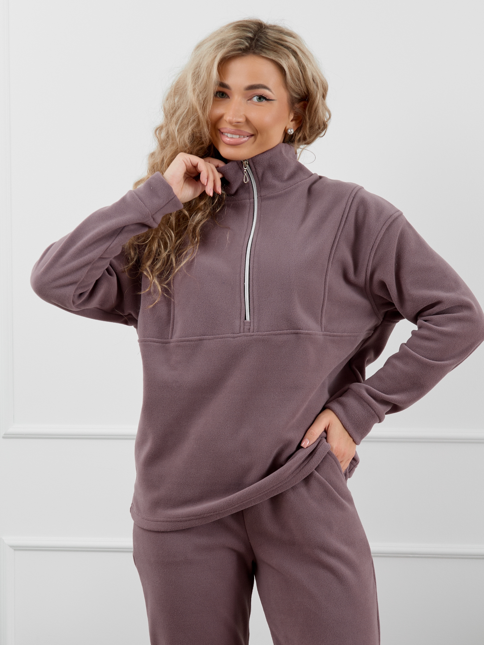 Женский флисовый костюм состоит из толстовки с воротником-стойкой на молнии и брюк джоггеров. Костюм сидит свободно и не сковывает движения, что делает его идеальным вариантом для активного образа жизни.