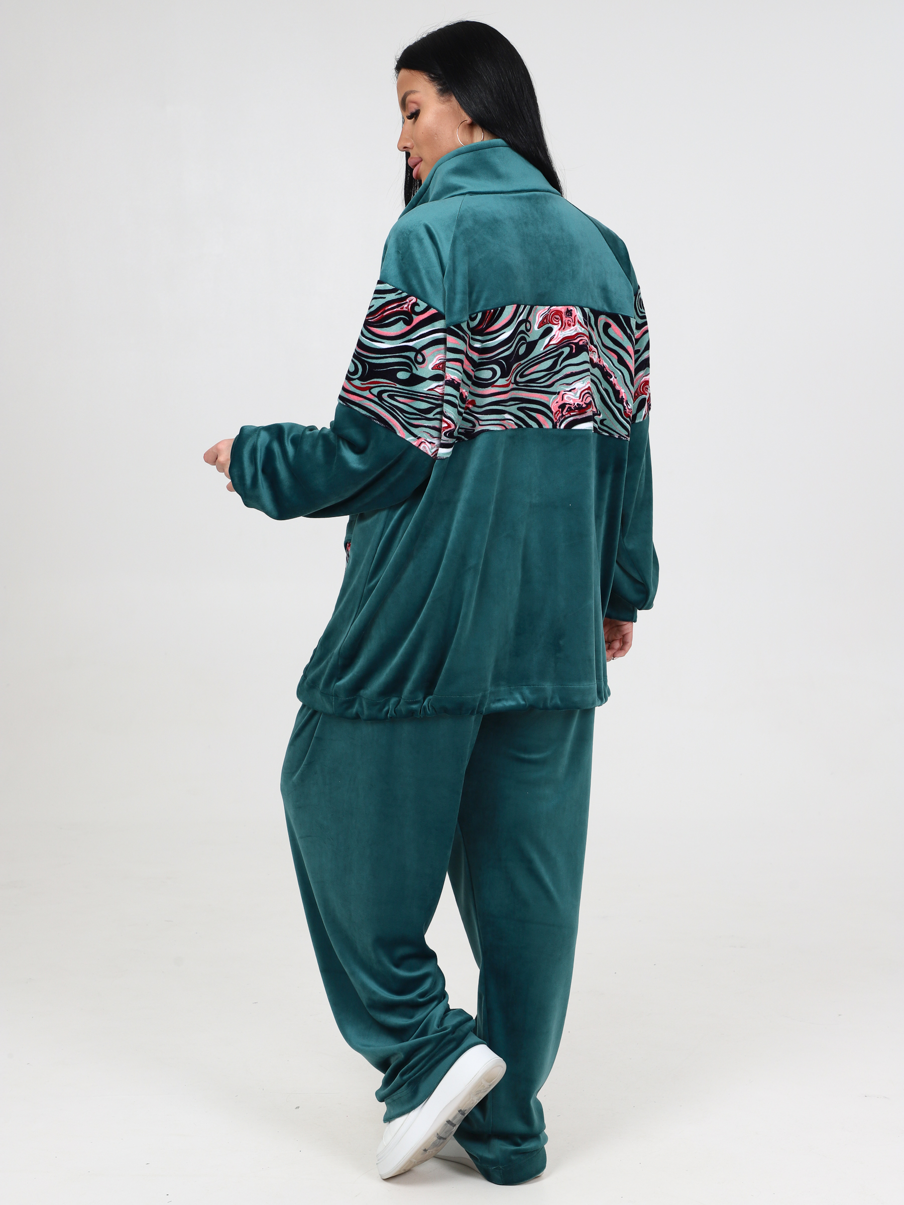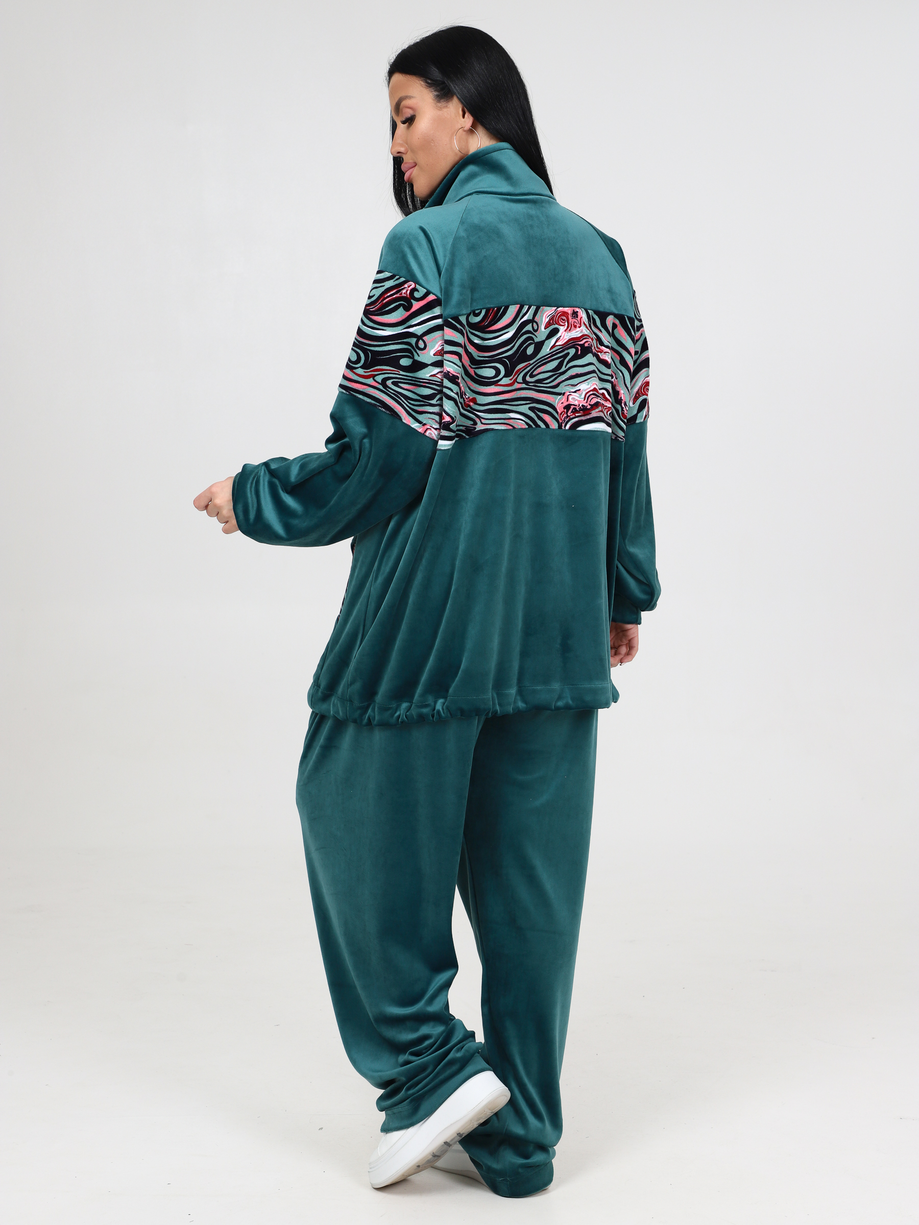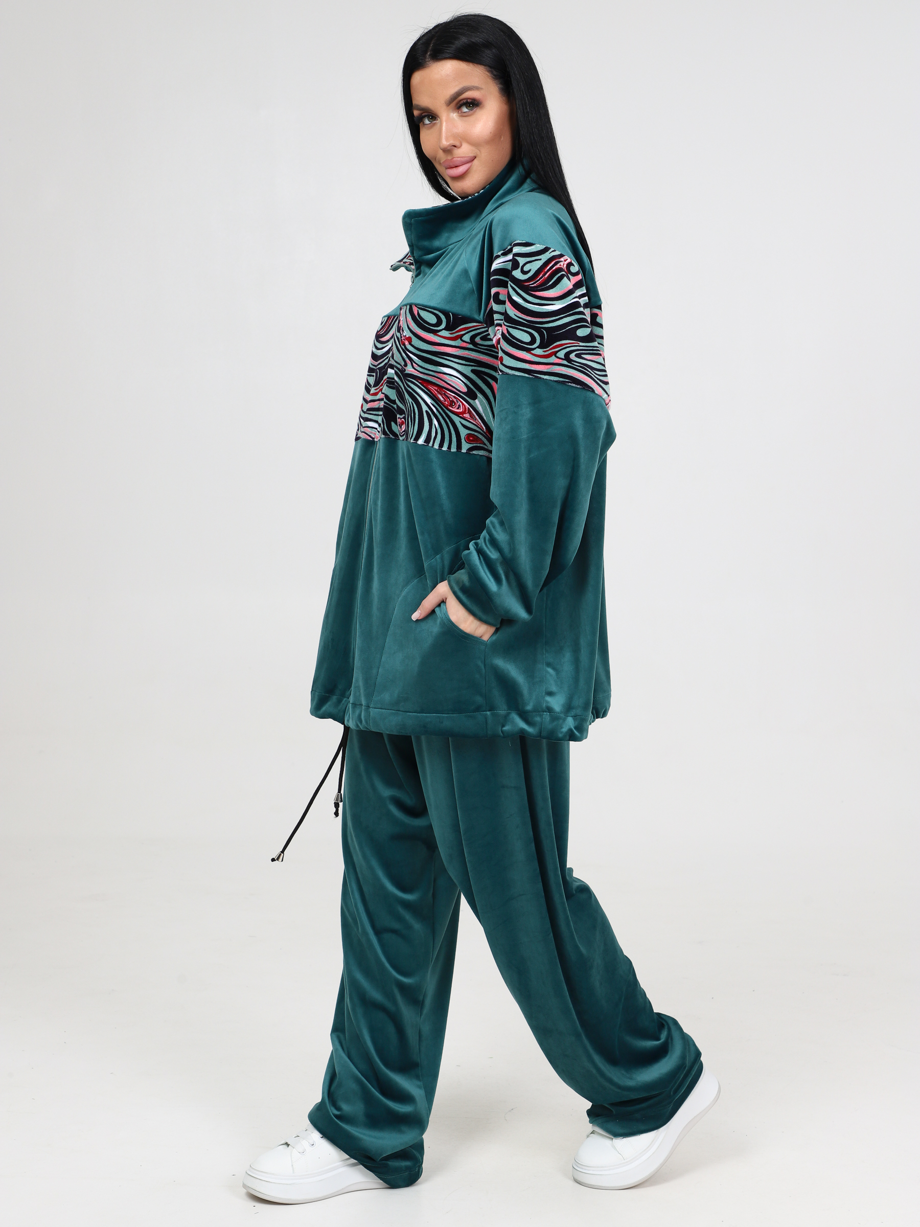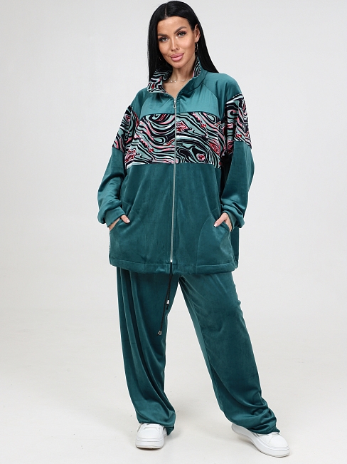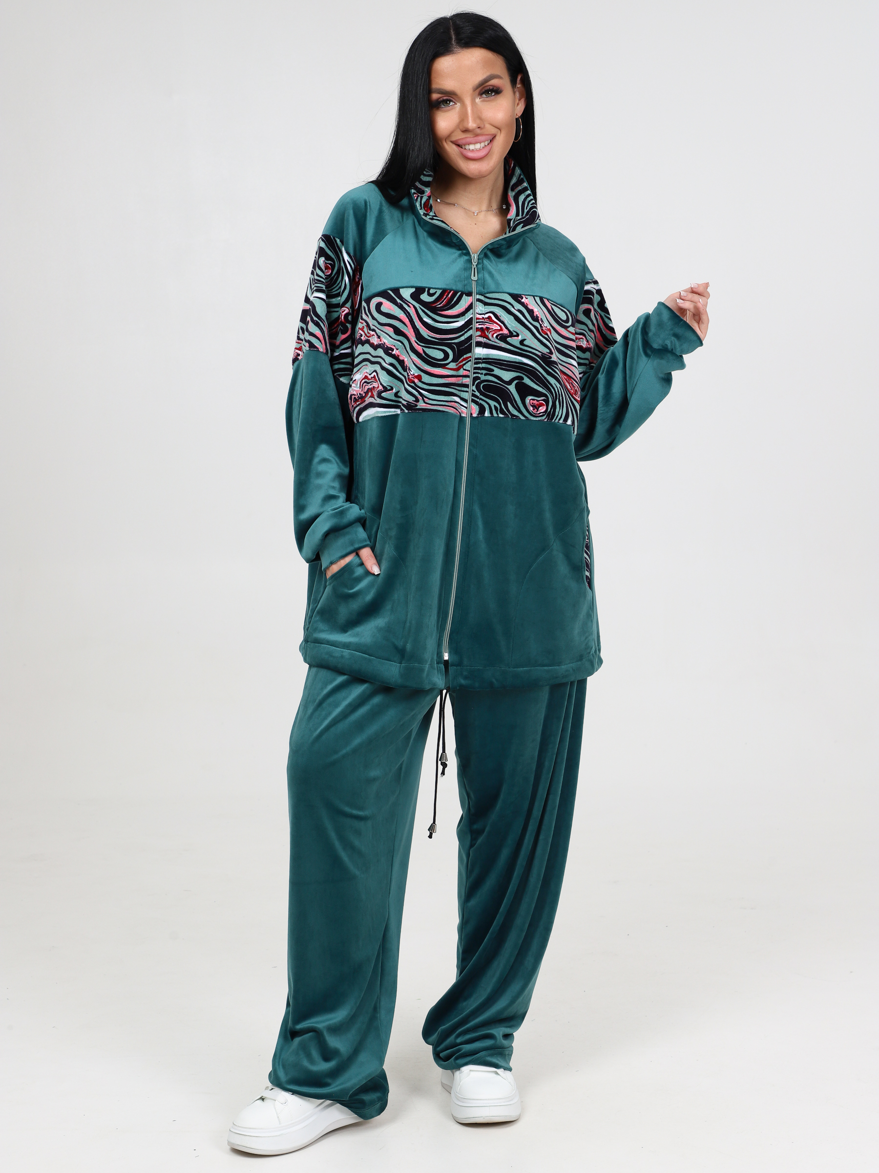 Стильный велюровый брючный костюм для женщин больших размеров. Прекрасно садится по фигуре, приятен и практичен в носке, дарит комфортные ощущения. Костюм состоит: из прямых брюк с высокой посадкой (пояс на мягкой резинке, не доставляющей дискомфорт) и толстовки прямого силуэта с рукавами реглан. Толстовка на молнии с воротником-стойкой, с удобными внутренними карманами и кулиской по низу.