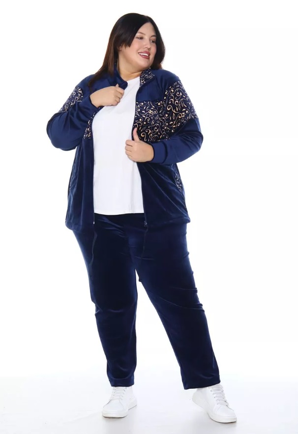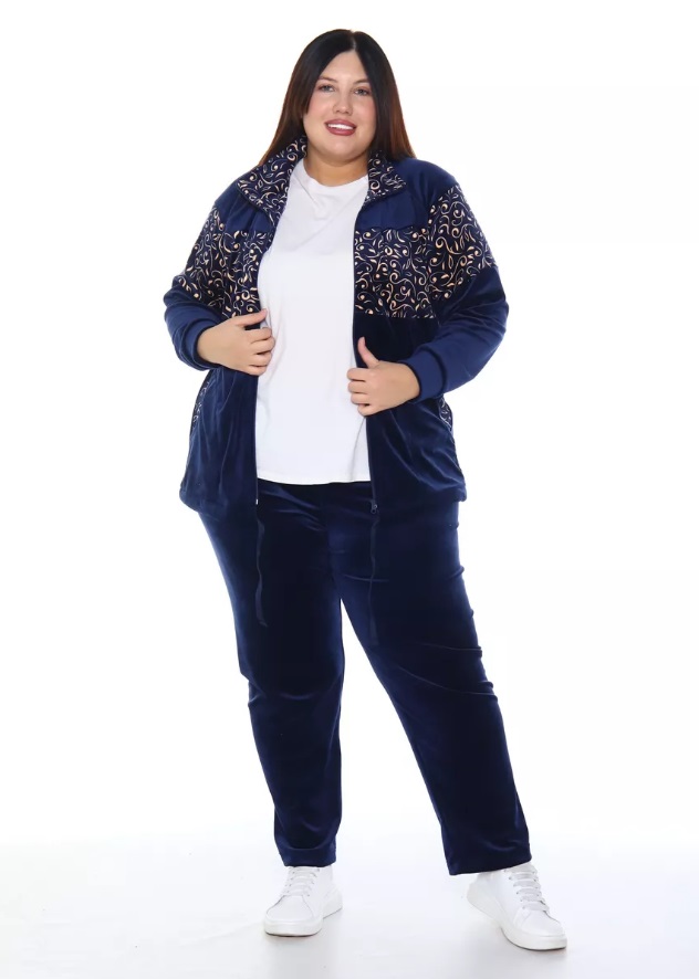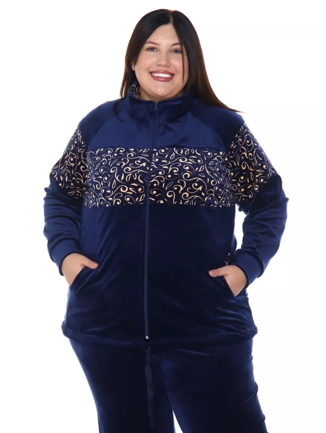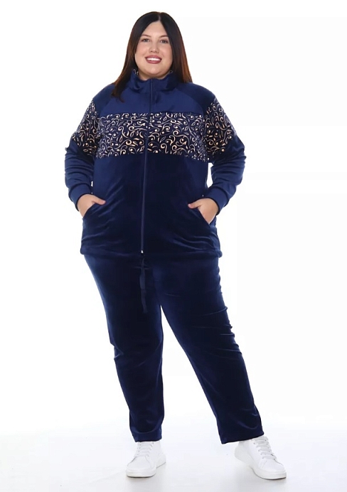 Стильный велюровый брючный костюм для женщин больших размеров. Прекрасно садится по фигуре, приятен и практичен в носке, дарит комфортные ощущения. Костюм состоит: из прямых брюк с высокой посадкой (пояс на мягкой резинке, не доставляющей дискомфорт) и толстовки прямого силуэта с рукавами реглан. Толстовка на молнии с воротником-стойкой, с удобными внутренними карманами и кулиской по низу.