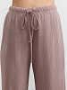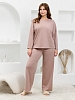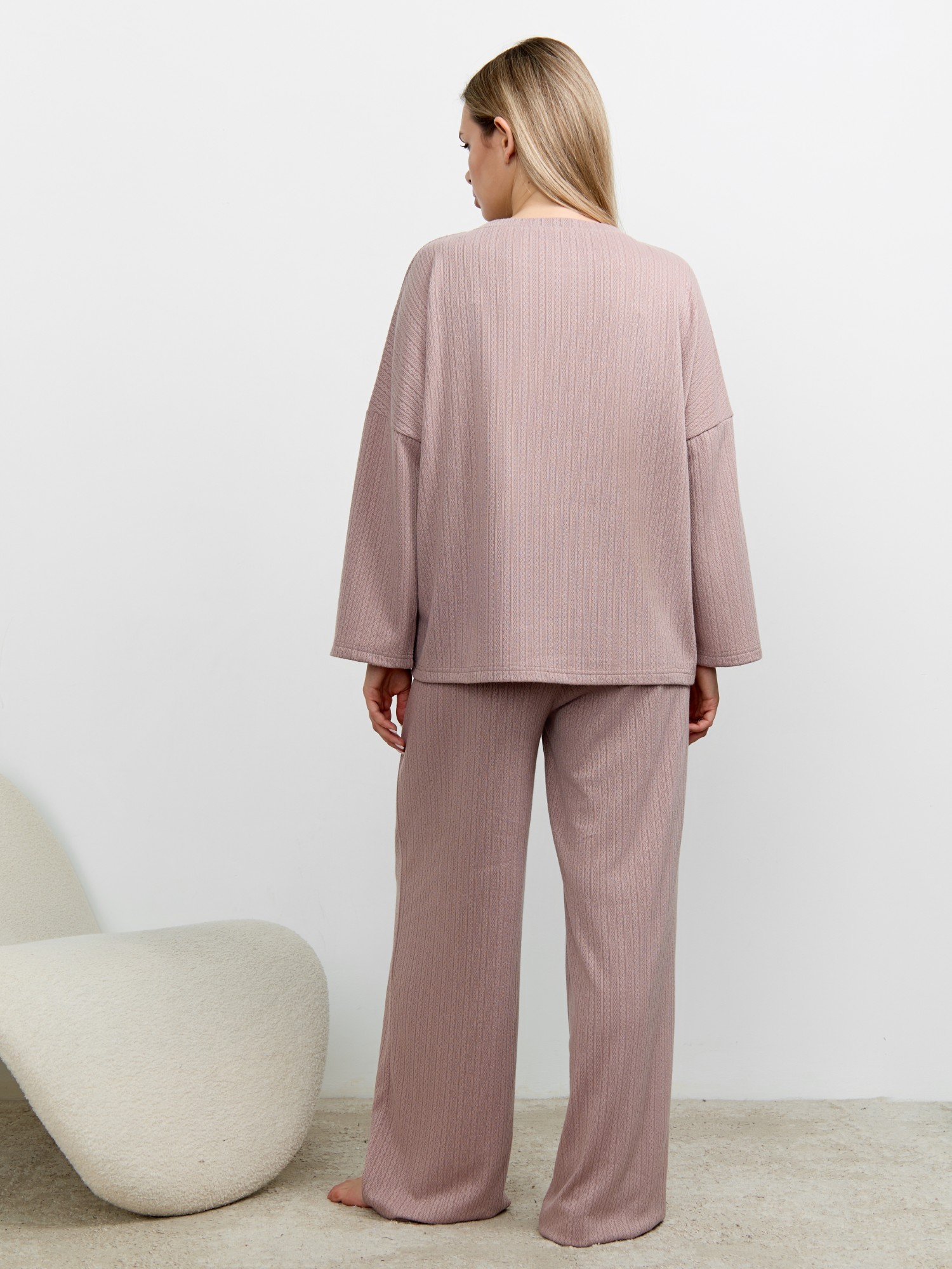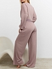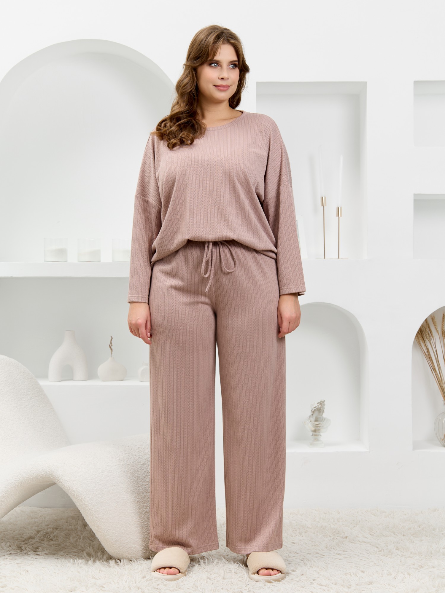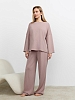 Костюм молодежный из гладкокрашеного фактурного трикотажного полотна, состоящий из футболки и брюк. Футболка – прямого силуэта, свободная, с цельнокроеными длинными рукавами , горловиной овальной формы, обработанной втачной планкой.Брюки – свободного кроя, длинные, с эластичной тесьмой по талии и шнурком, продетым в две обметанные петли.