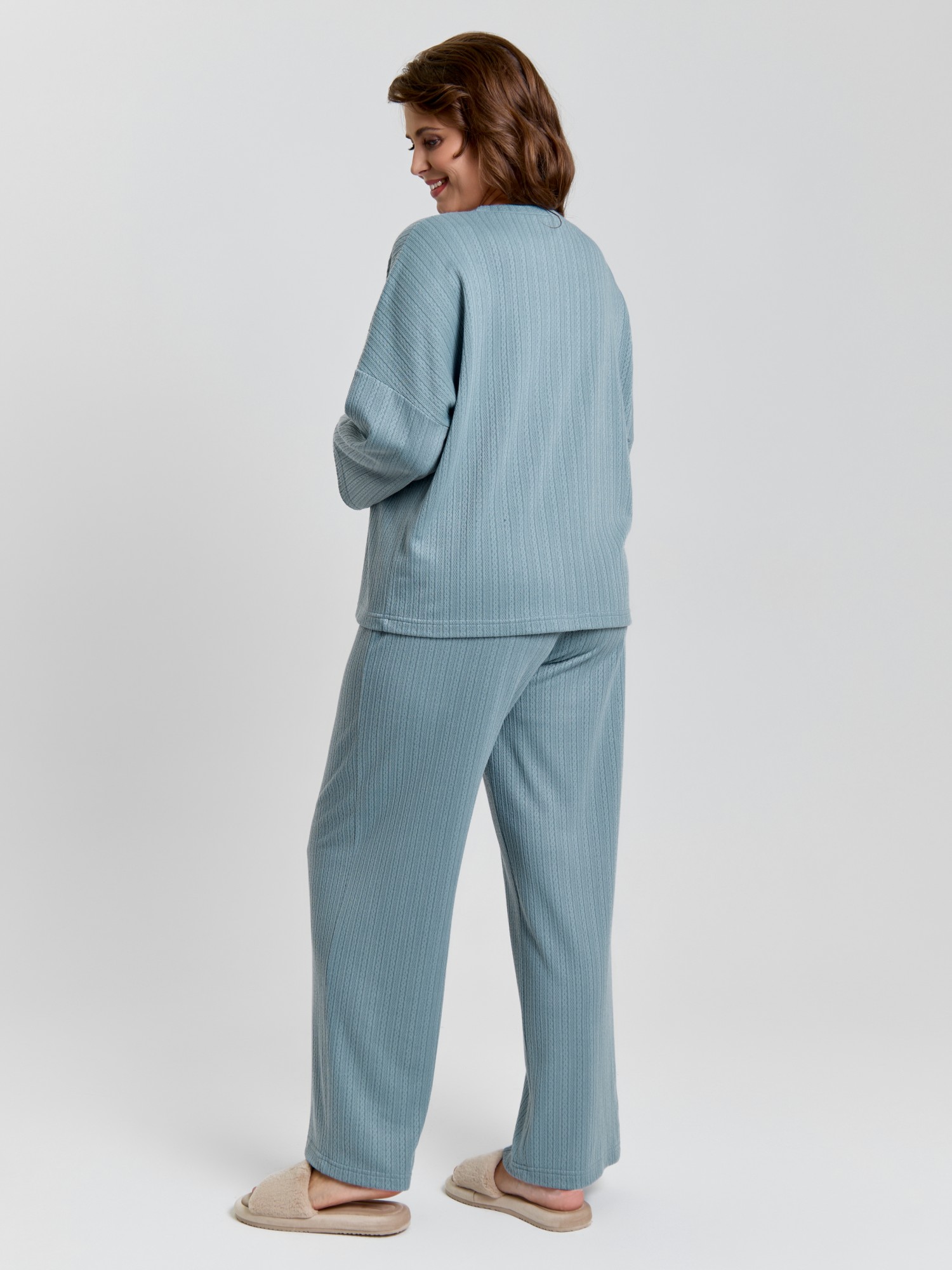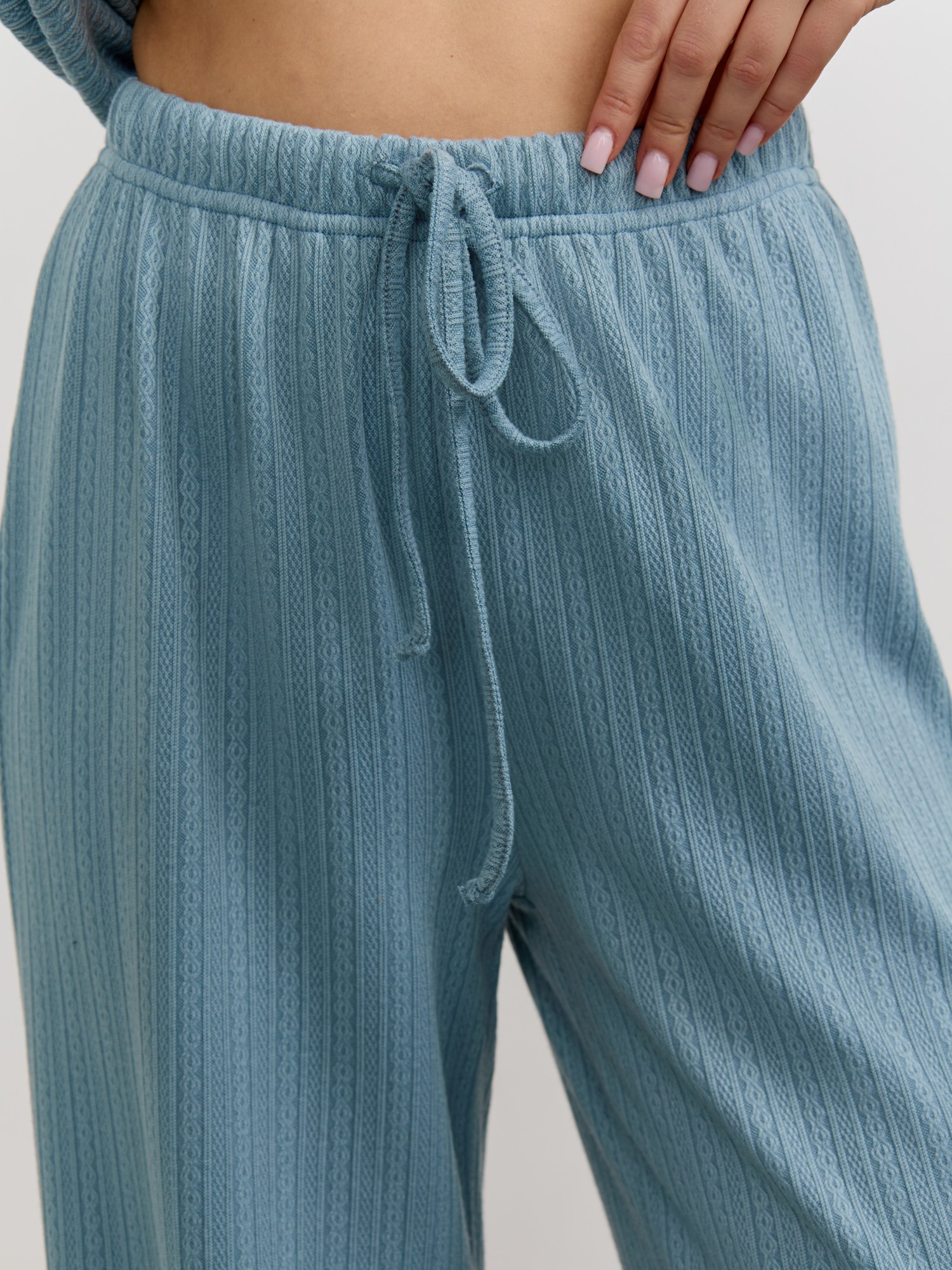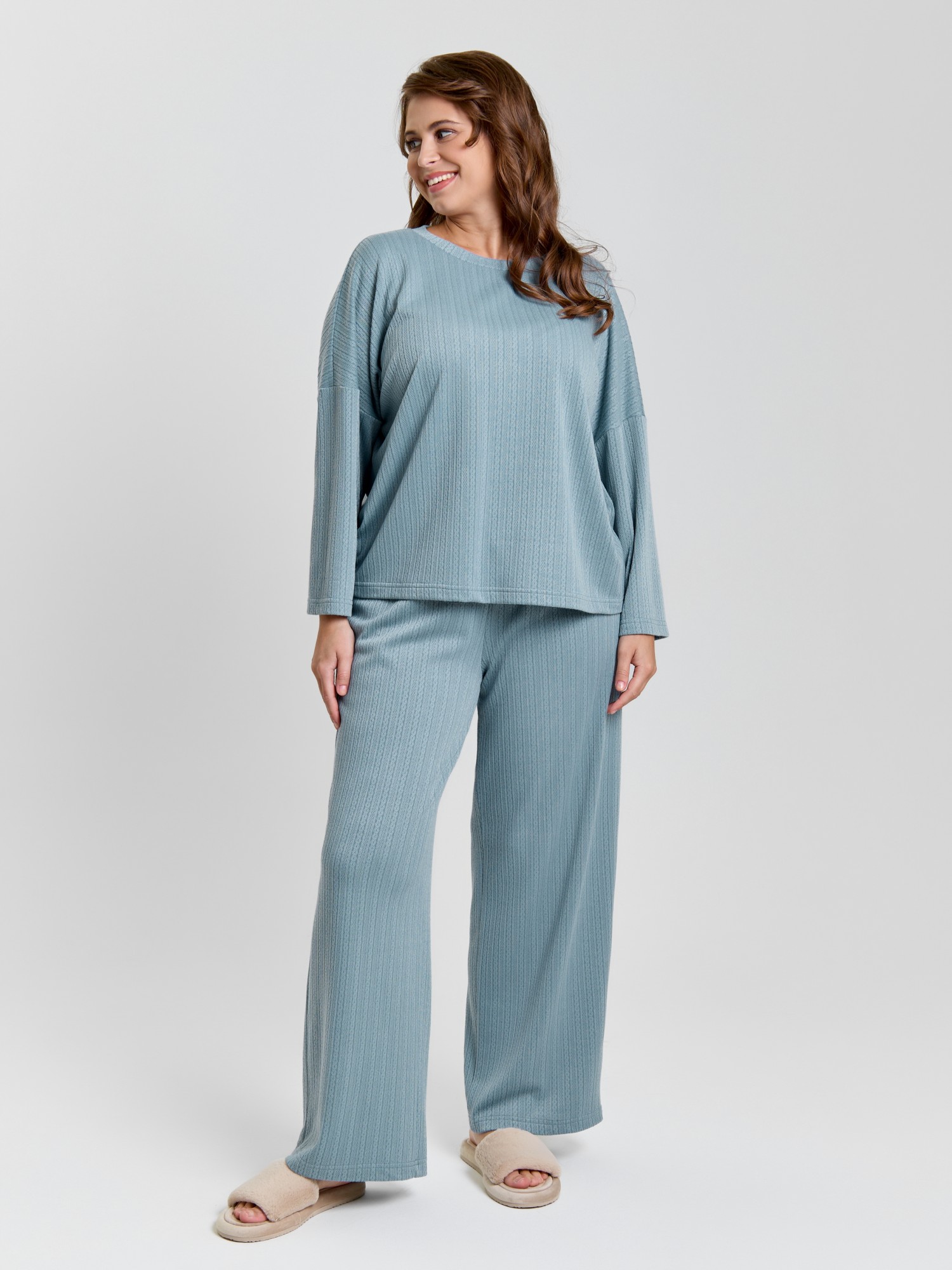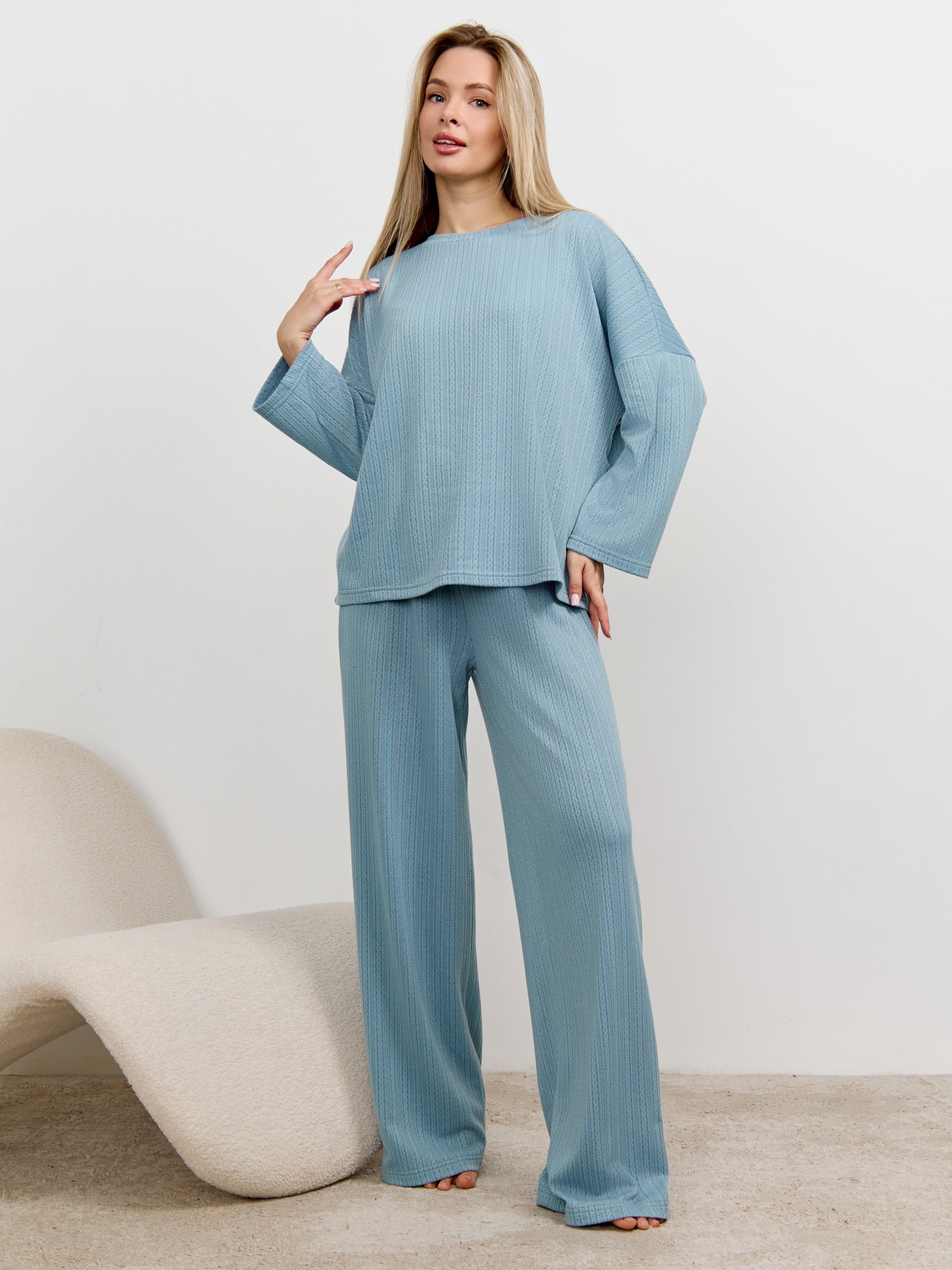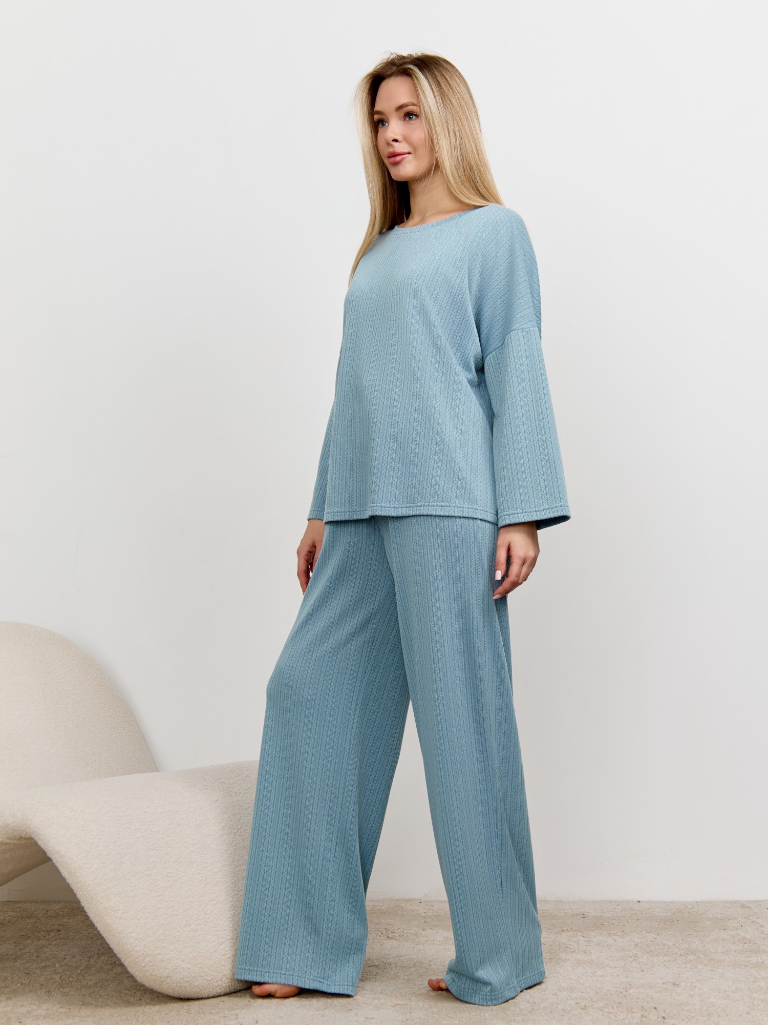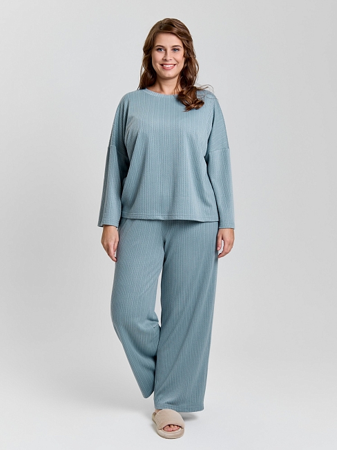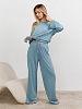 Костюм молодежный из гладкокрашеного фактурного трикотажного полотна, состоящий из футболки и брюк. Футболка – прямого силуэта, свободная, с цельнокроеными длинными рукавами , горловиной овальной формы, обработанной втачной планкой.Брюки – свободного кроя, длинные, с эластичной тесьмой по талии и шнурком, продетым в две обметанные петли.