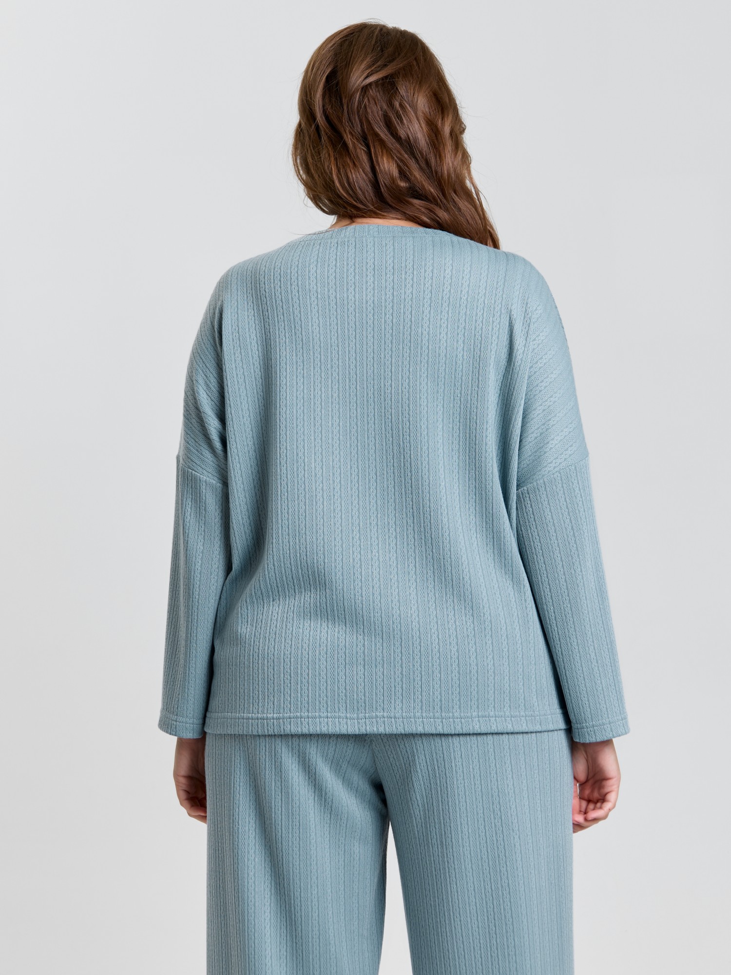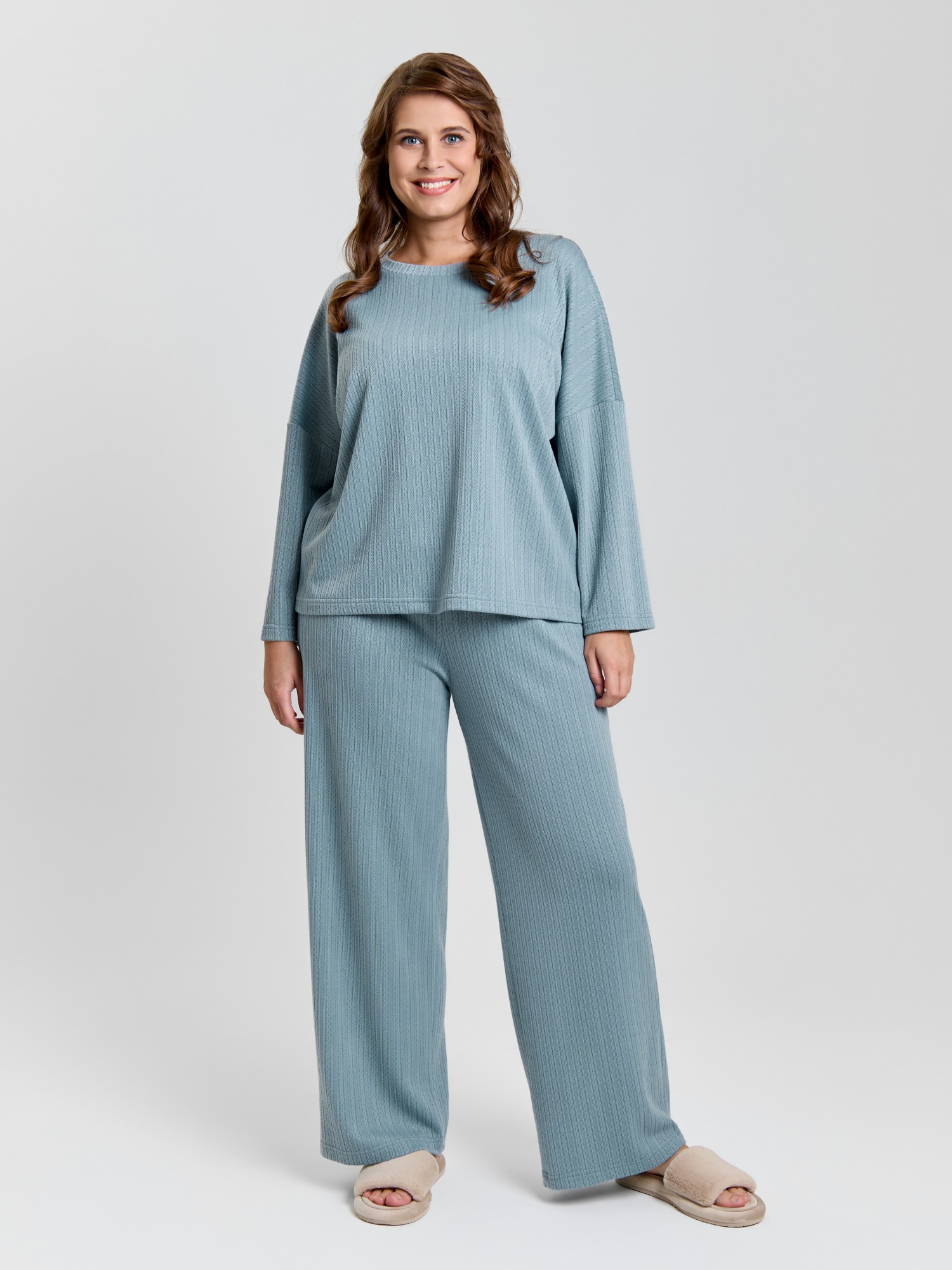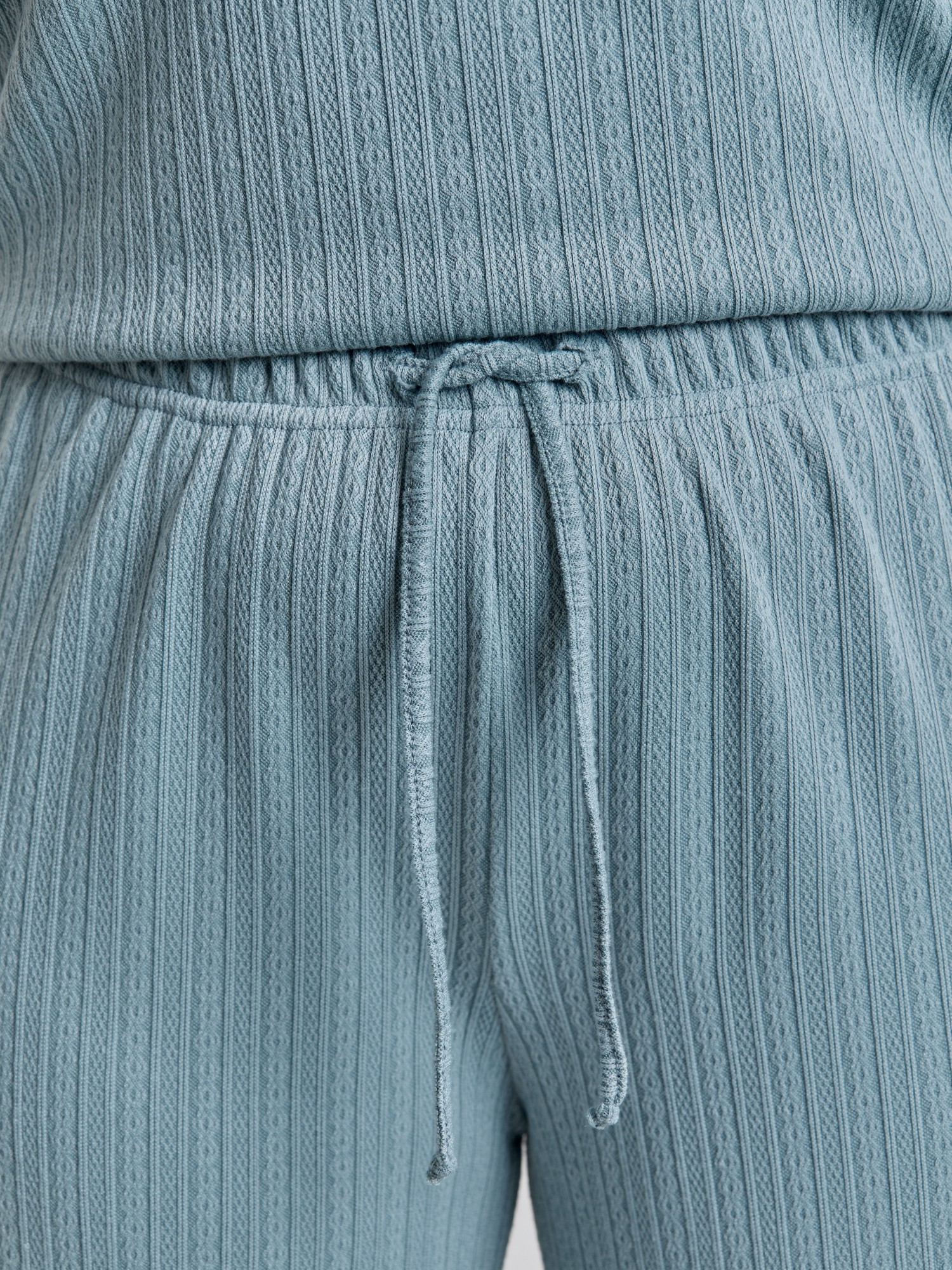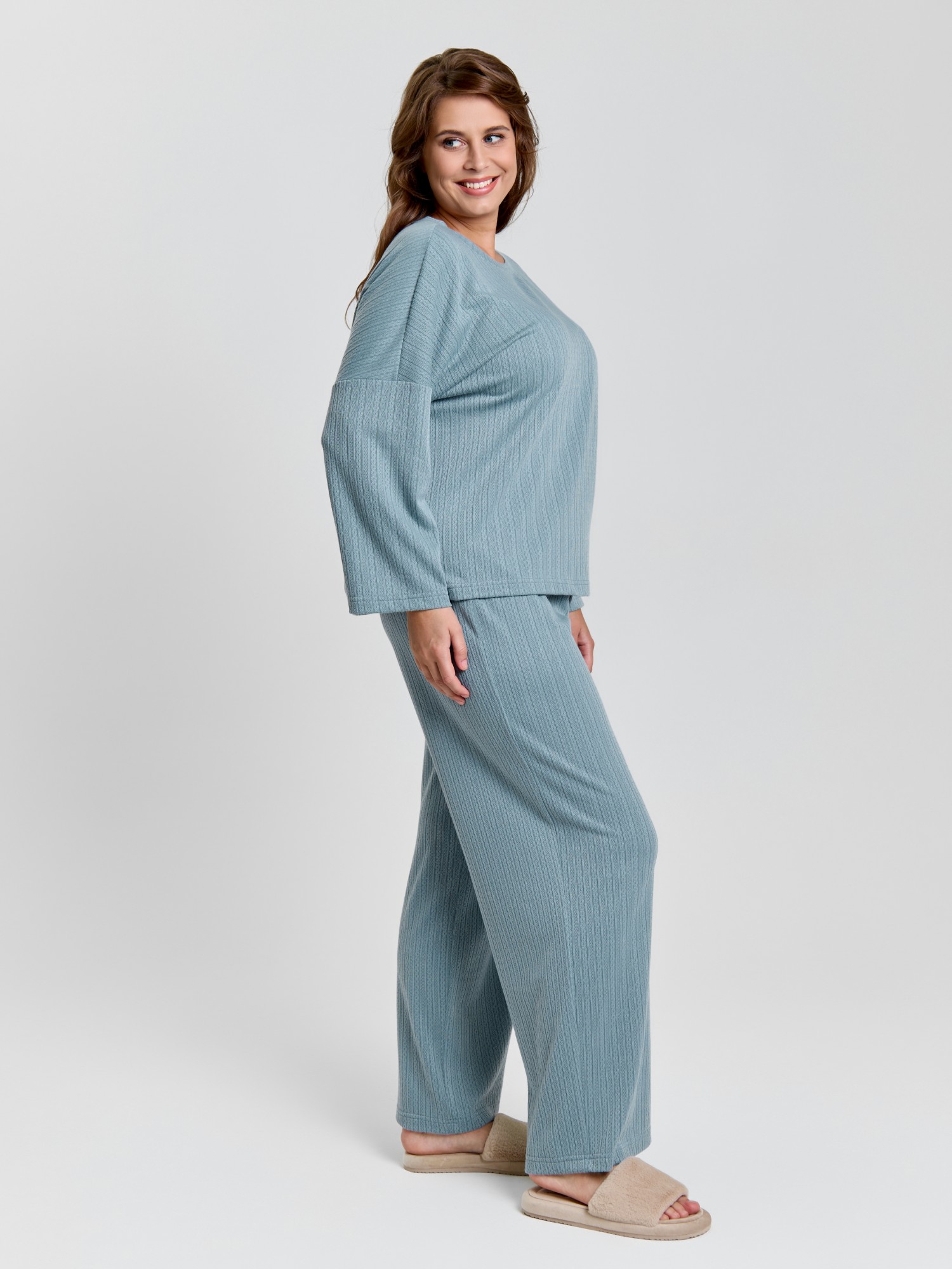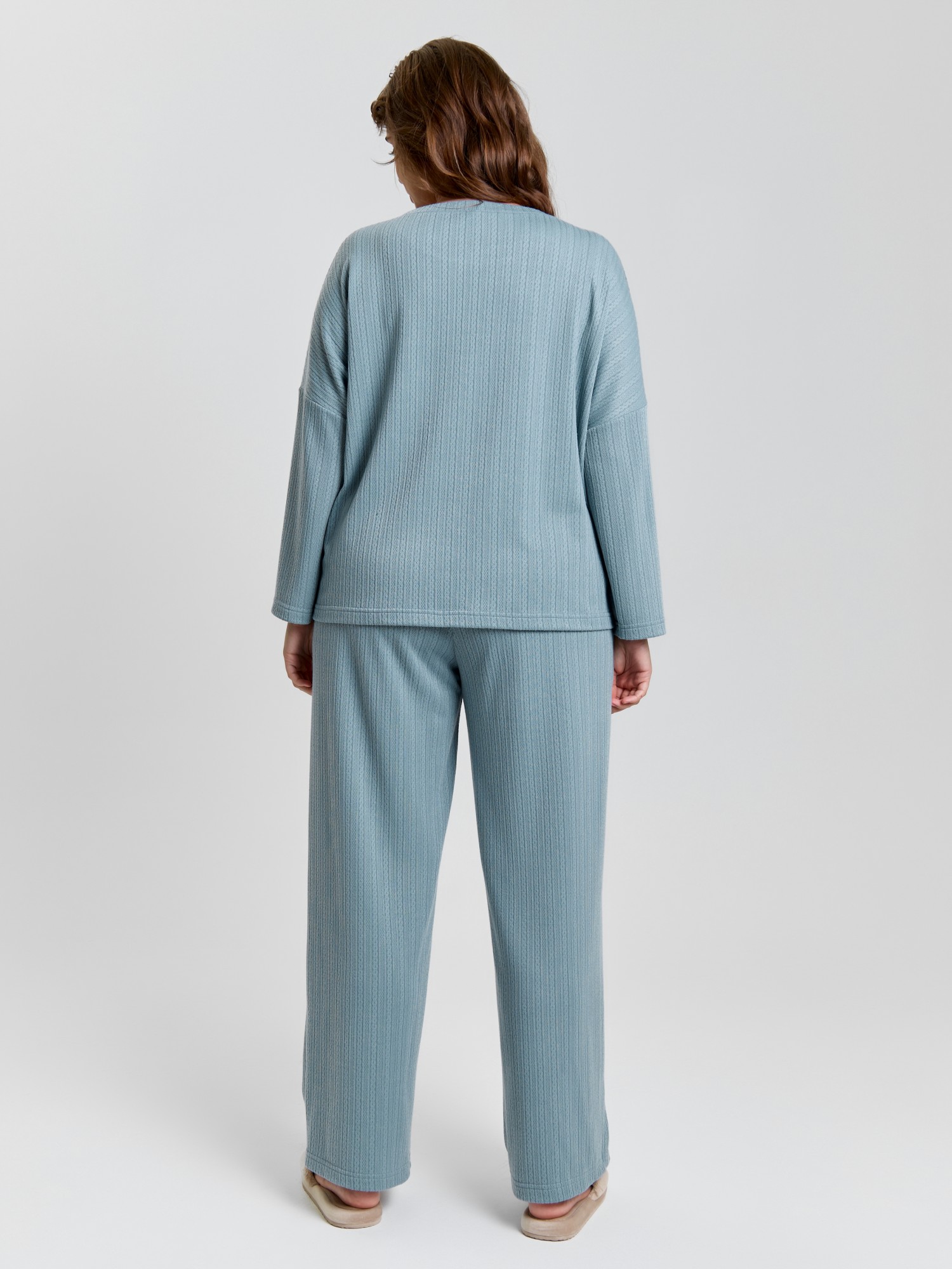 Костюм молодежный из гладкокрашеного фактурного трикотажного полотна, состоящий из футболки и брюк. Футболка – прямого силуэта, свободная, с цельнокроеными длинными рукавами , горловиной овальной формы, обработанной втачной планкой.Брюки – свободного кроя, длинные, с эластичной тесьмой по талии и шнурком, продетым в две обметанные петли.