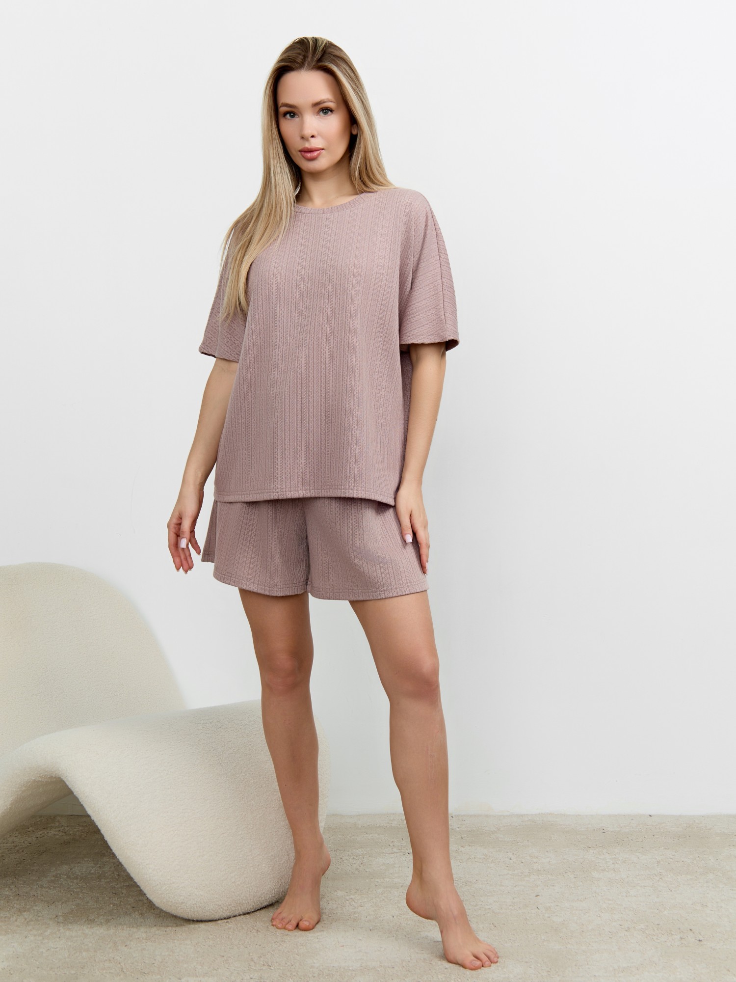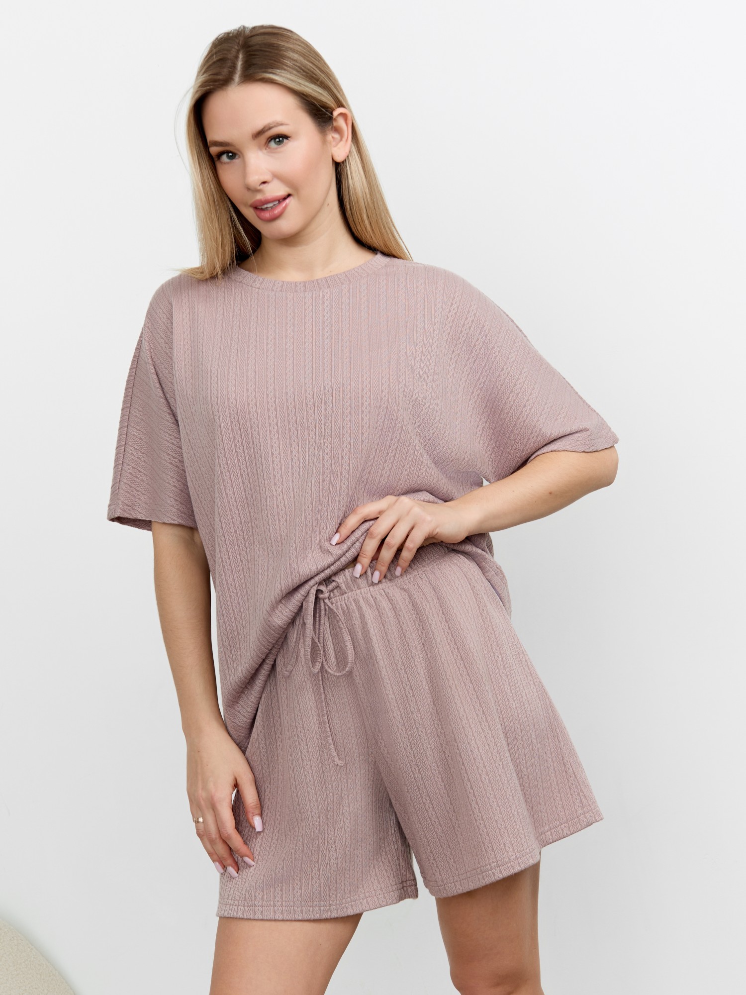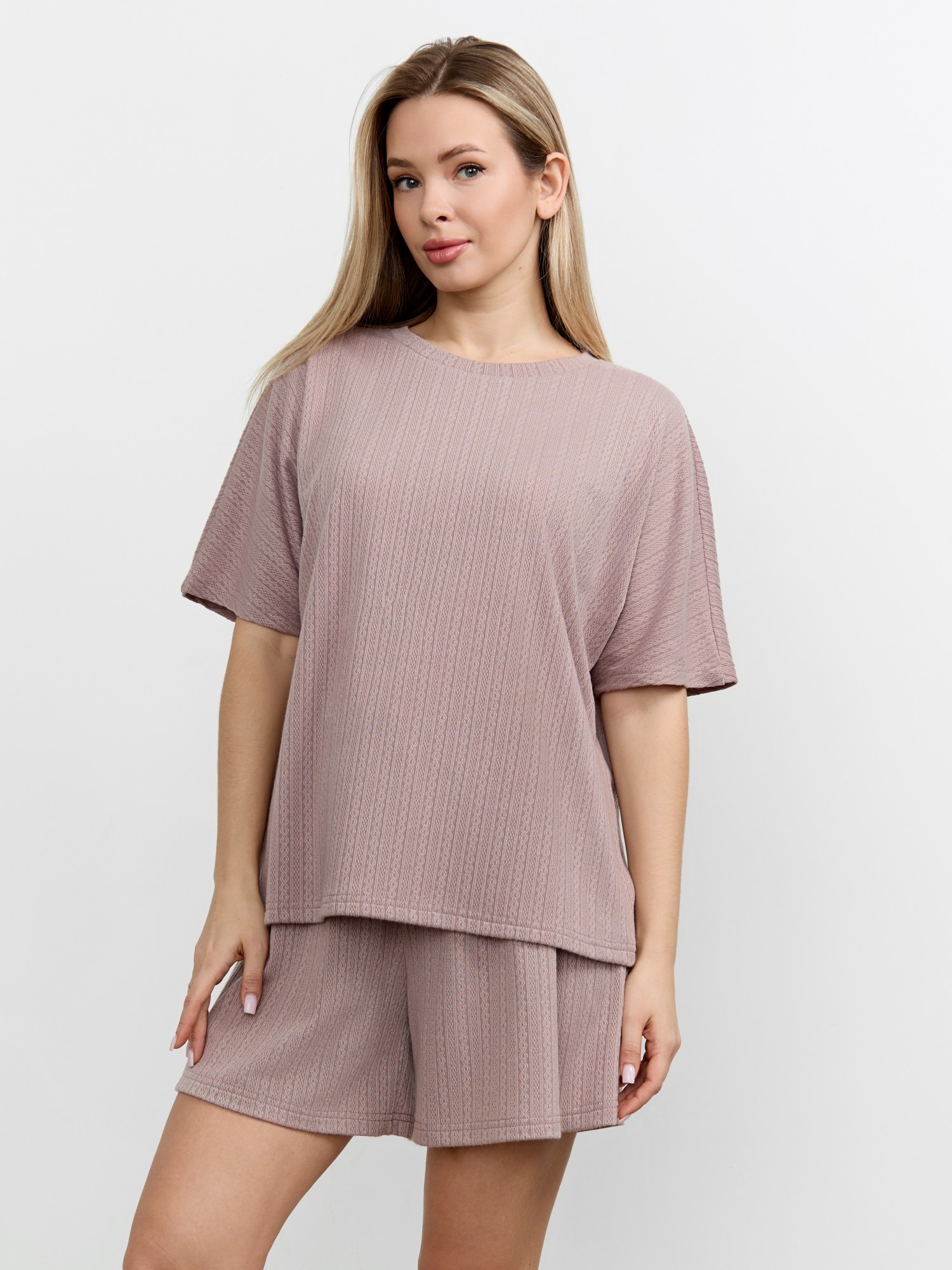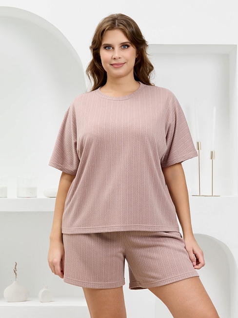 Костюм молодежный из гладкокрашеного фактурного трикотажного полотна, состоящий из футболки и шорт. Футболка – свободного кроя, с цельнокроеными рукавами, горловиной овальной формы, обработанной втачной планкой.Шорты – средней длины, свободные, с эластичной тесьмой по талии и шнурком, продетым в две обметанные петли.