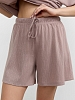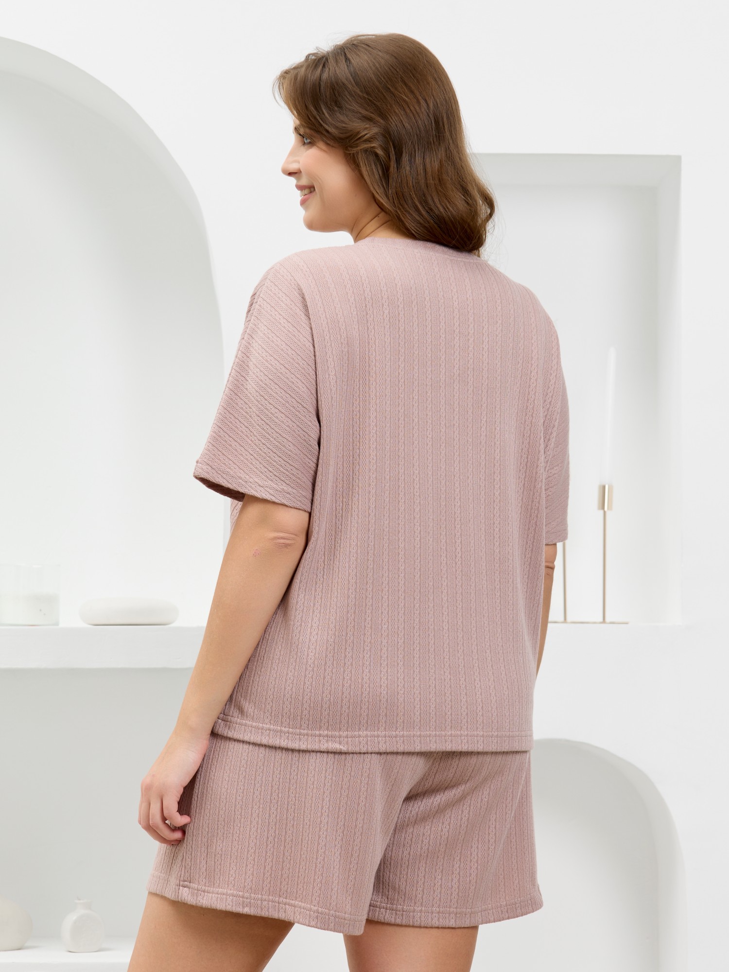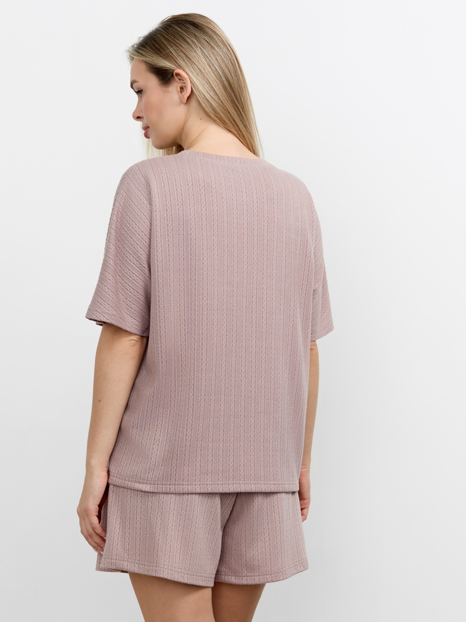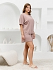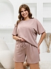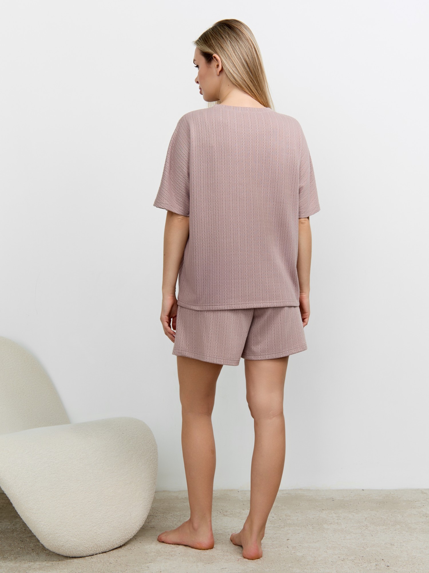 Костюм молодежный из гладкокрашеного фактурного трикотажного полотна, состоящий из футболки и шорт. Футболка – свободного кроя, с цельнокроеными рукавами, горловиной овальной формы, обработанной втачной планкой.Шорты – средней длины, свободные, с эластичной тесьмой по талии и шнурком, продетым в две обметанные петли.