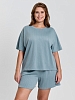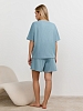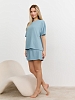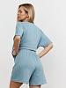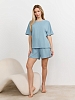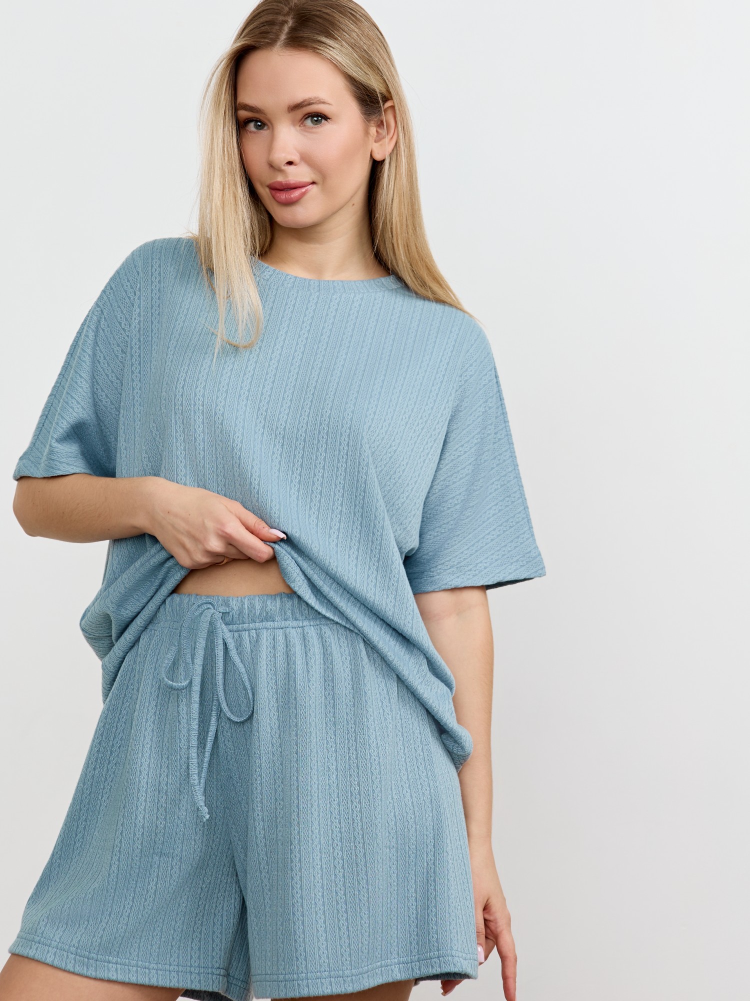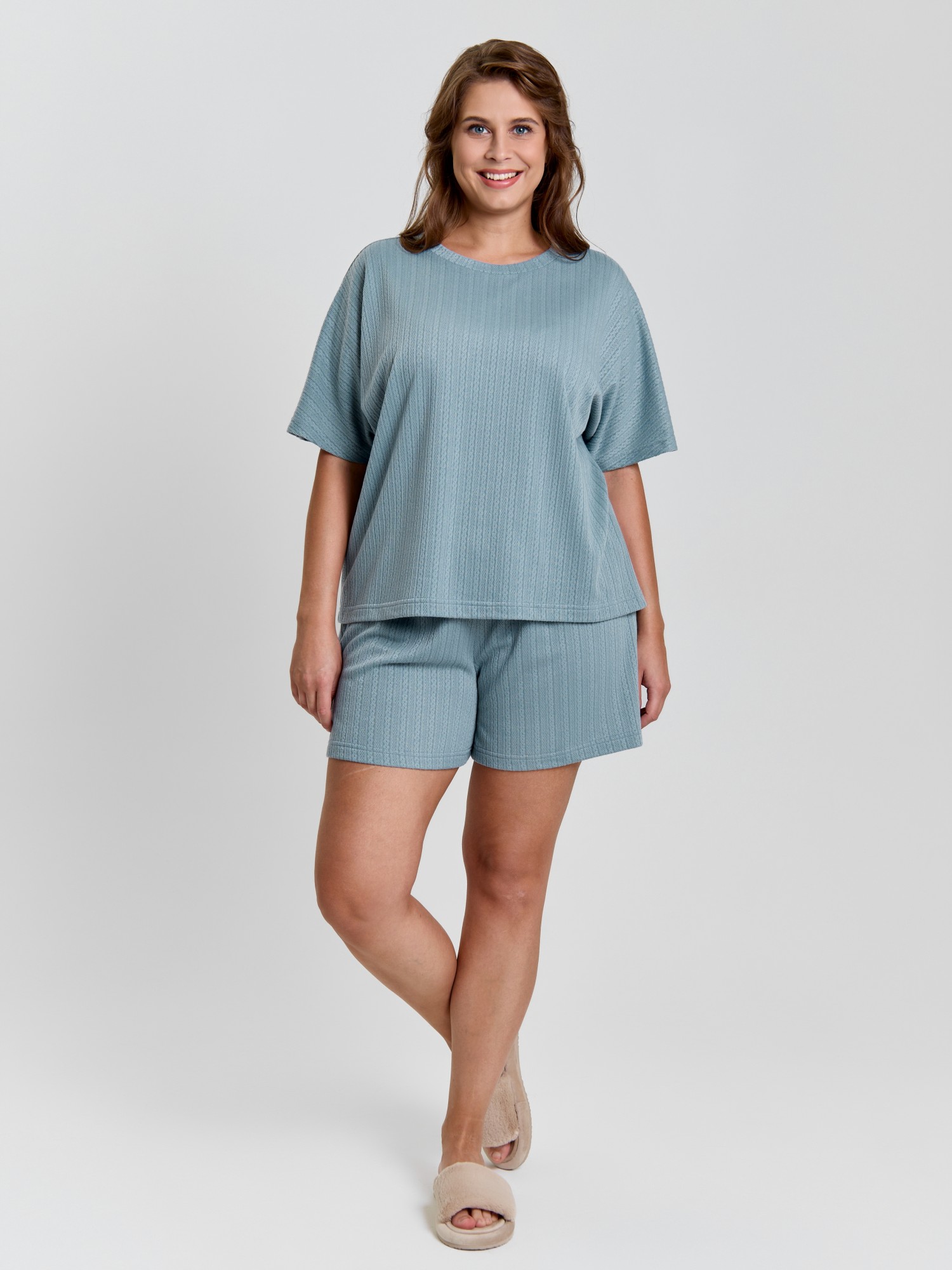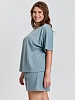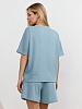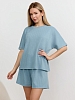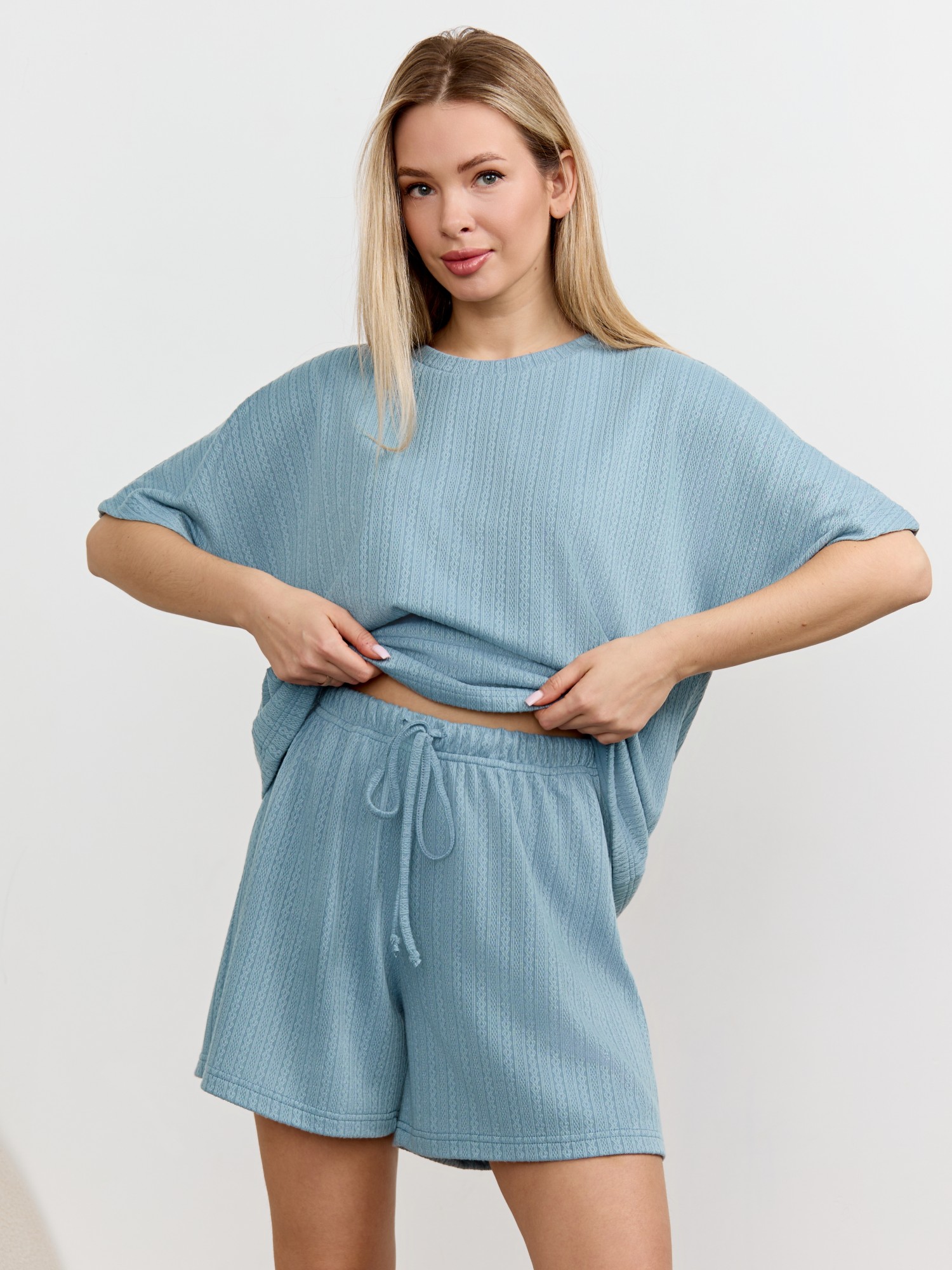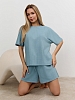 Костюм молодежный из гладкокрашеного фактурного трикотажного полотна, состоящий из футболки и шорт. Футболка – свободного кроя, с цельнокроеными рукавами, горловиной овальной формы, обработанной втачной планкой.Шорты – средней длины, свободные, с эластичной тесьмой по талии и шнурком, продетым в две обметанные петли.