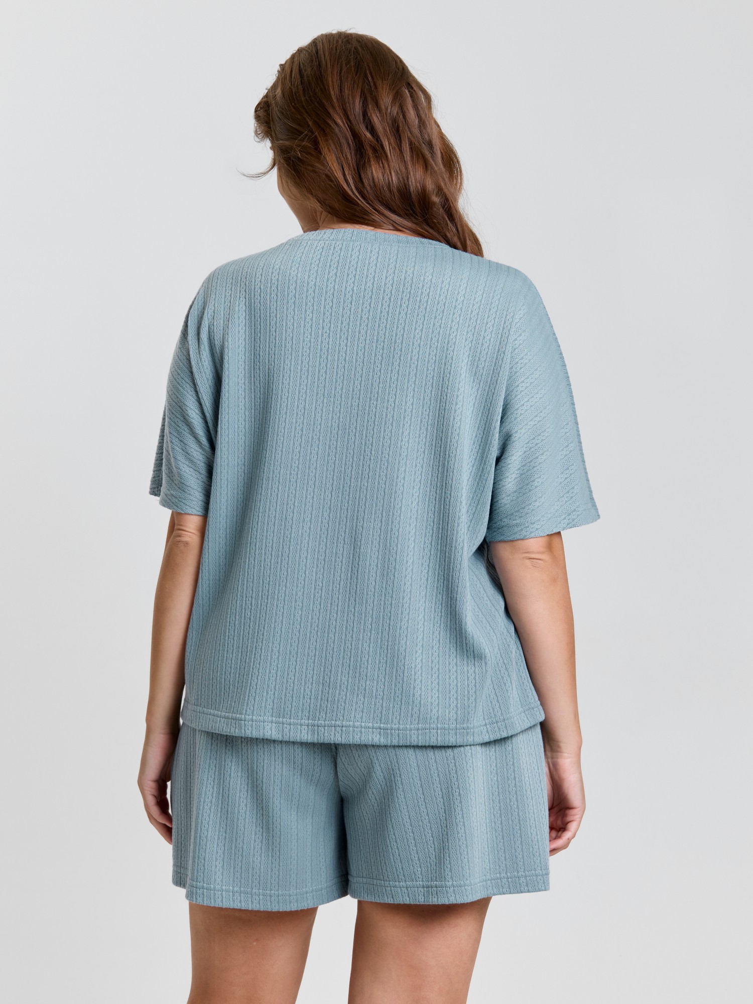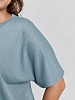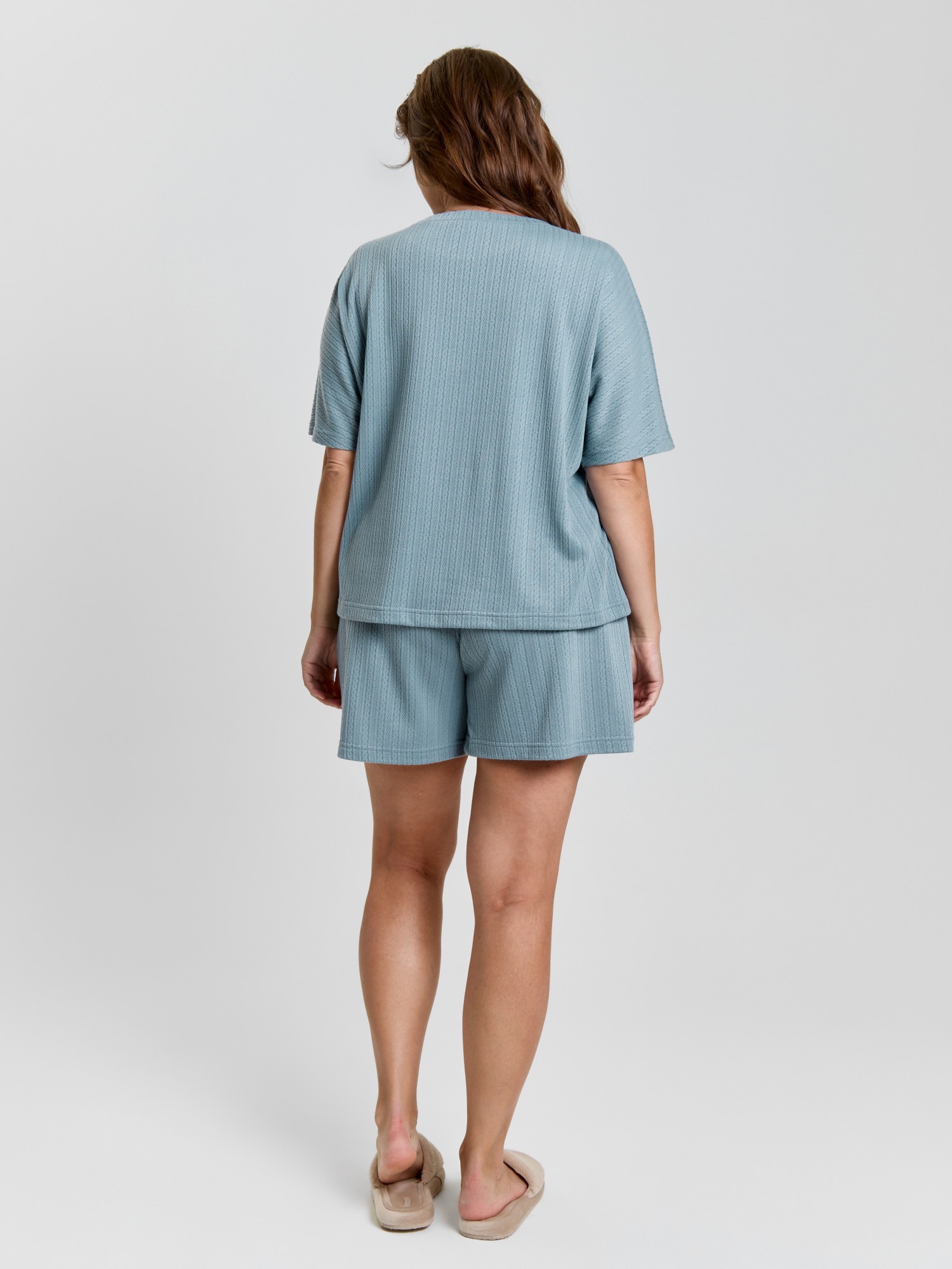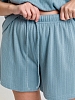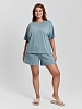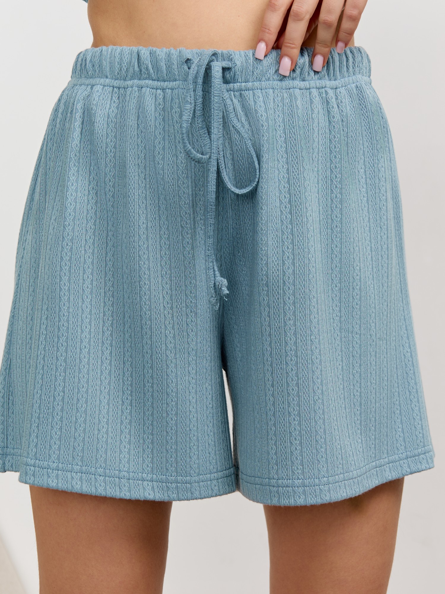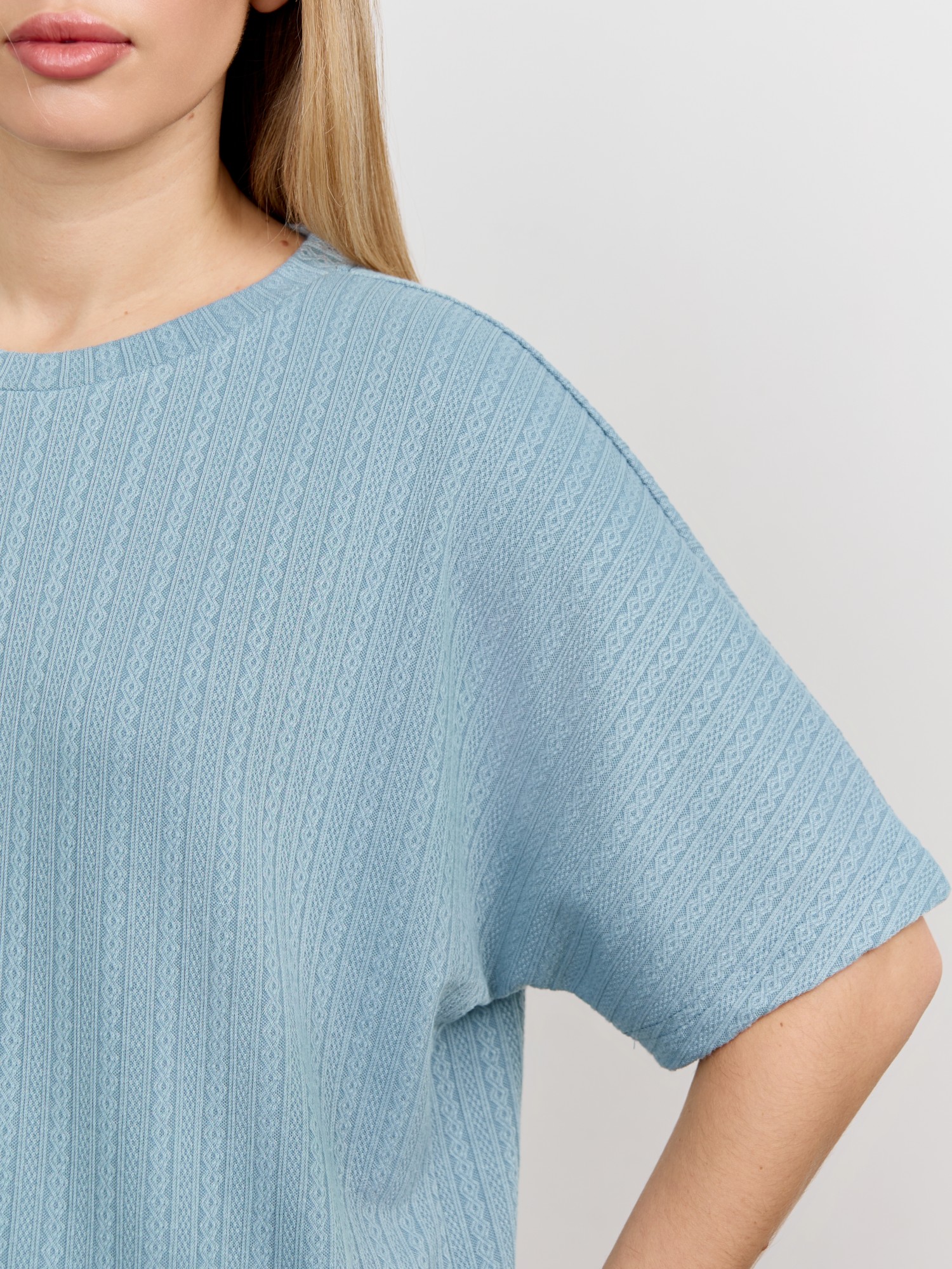 Костюм молодежный из гладкокрашеного фактурного трикотажного полотна, состоящий из футболки и шорт. Футболка – свободного кроя, с цельнокроеными рукавами, горловиной овальной формы, обработанной втачной планкой.Шорты – средней длины, свободные, с эластичной тесьмой по талии и шнурком, продетым в две обметанные петли.