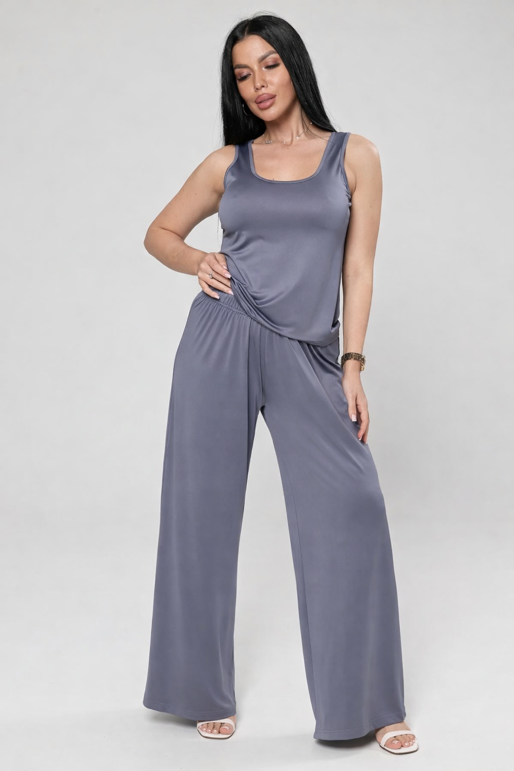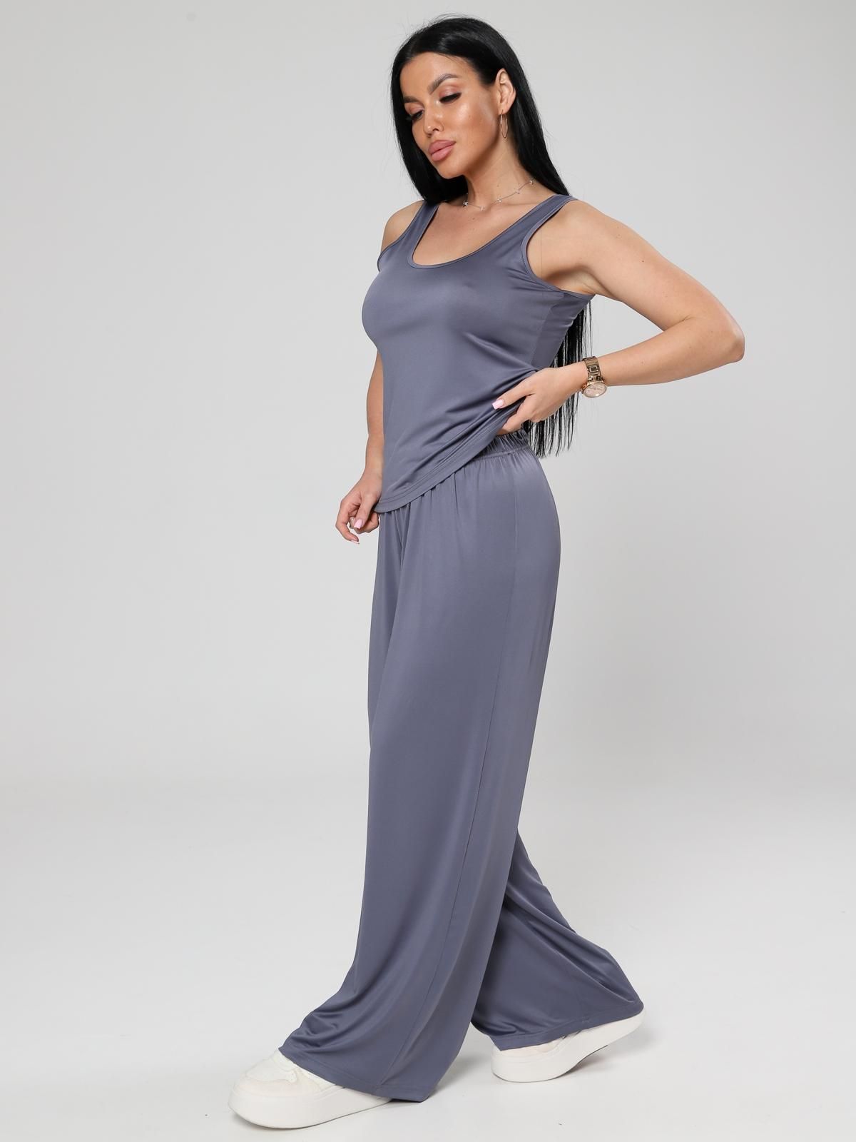 Женский костюм с брюками из ткани «масло» — это комплект, состоящий из блузы или футболки и брюк, изготовленный из эластичного трикотажа с характерной «маслянистой» текстурой. Такая ткань сочетает мягкость, пластичность и хорошую посадку по фигуре, что делает её популярной для повседневной, домашней и летней одежды.