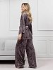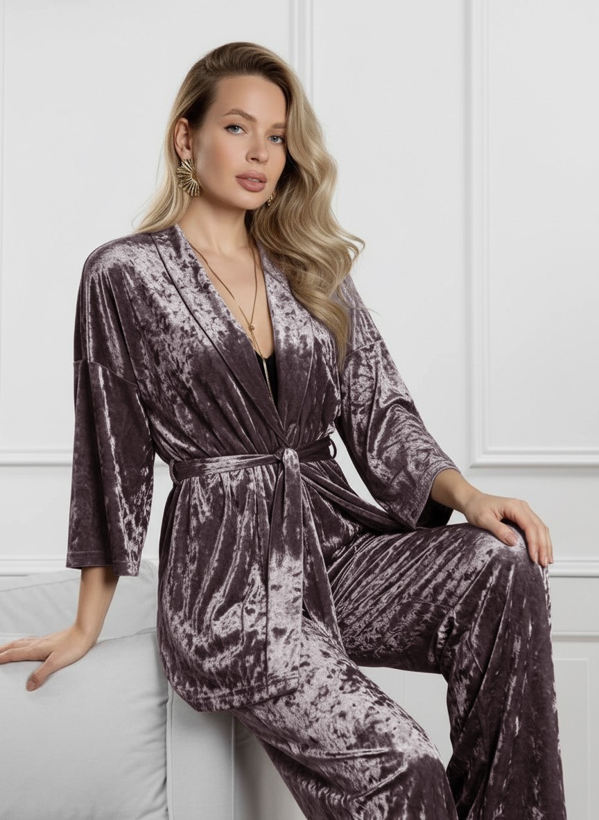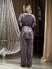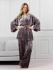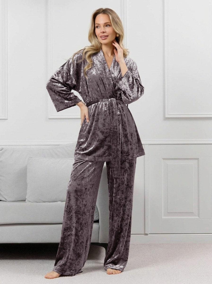 Костюм молодежный из гладкокрашенного полотна «велюр стрейч» с мраморным эффектом, состоящий из кимоно и брюк. Кимоно прямого кроя, свободное, на запахе, с втачными рукавами ¾ длины и съемным поясом, фиксирующимся на талии двумя шлевками в боковых швах.Брюки свободные, на притачном поясе с эластичной тесьмой внутри и карманами в боковых швах.