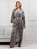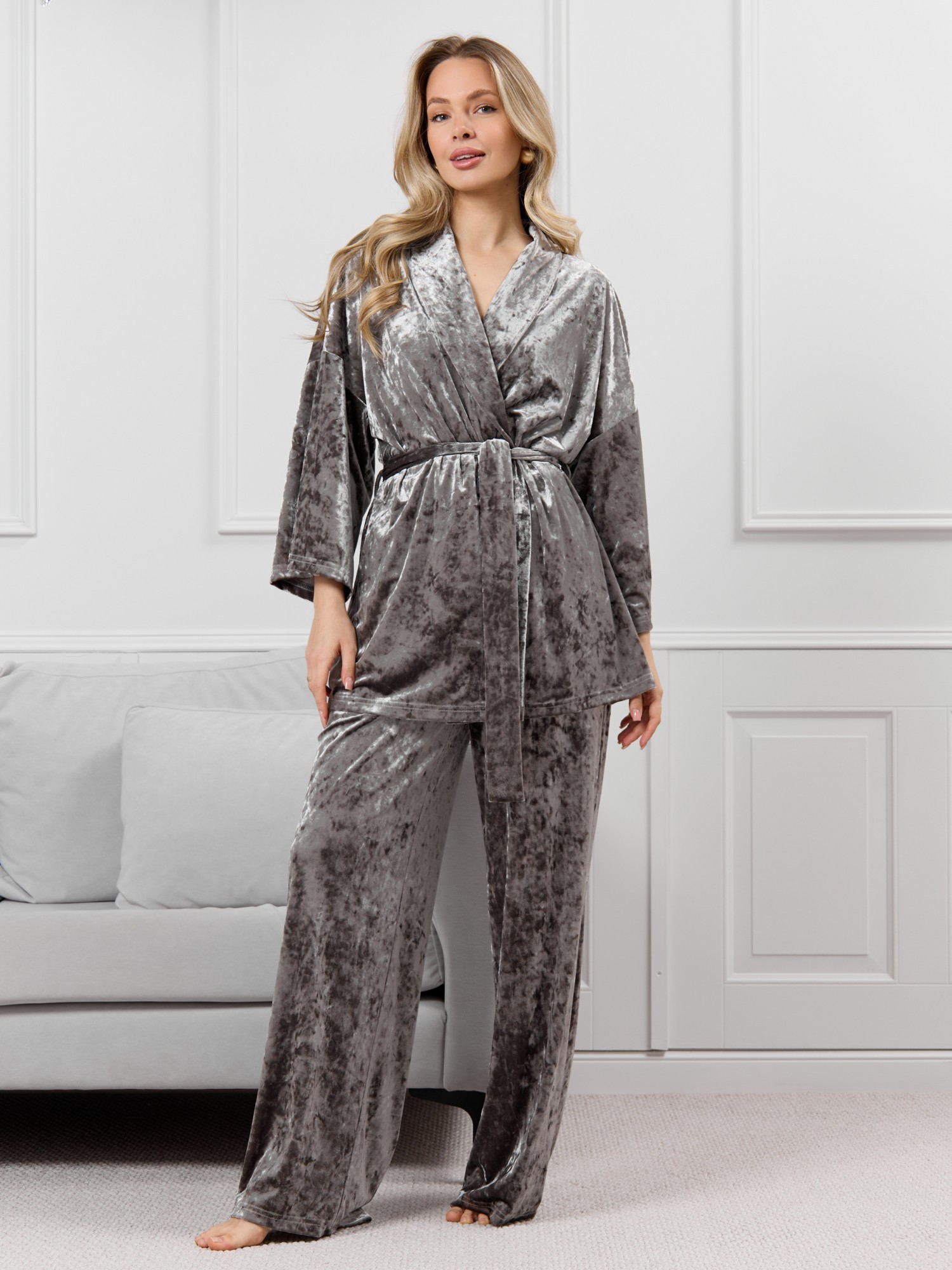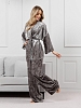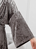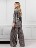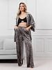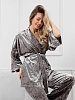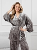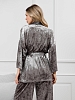 Костюм молодежный из гладкокрашенного полотна «велюр стрейч» с мраморным эффектом, состоящий из кимоно и брюк. Кимоно прямого кроя, свободное, на запахе, с втачными рукавами ¾ длины и съемным поясом, фиксирующимся на талии двумя шлевками в боковых швах.Брюки свободные, на притачном поясе с эластичной тесьмой внутри и карманами в боковых швах.