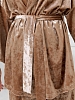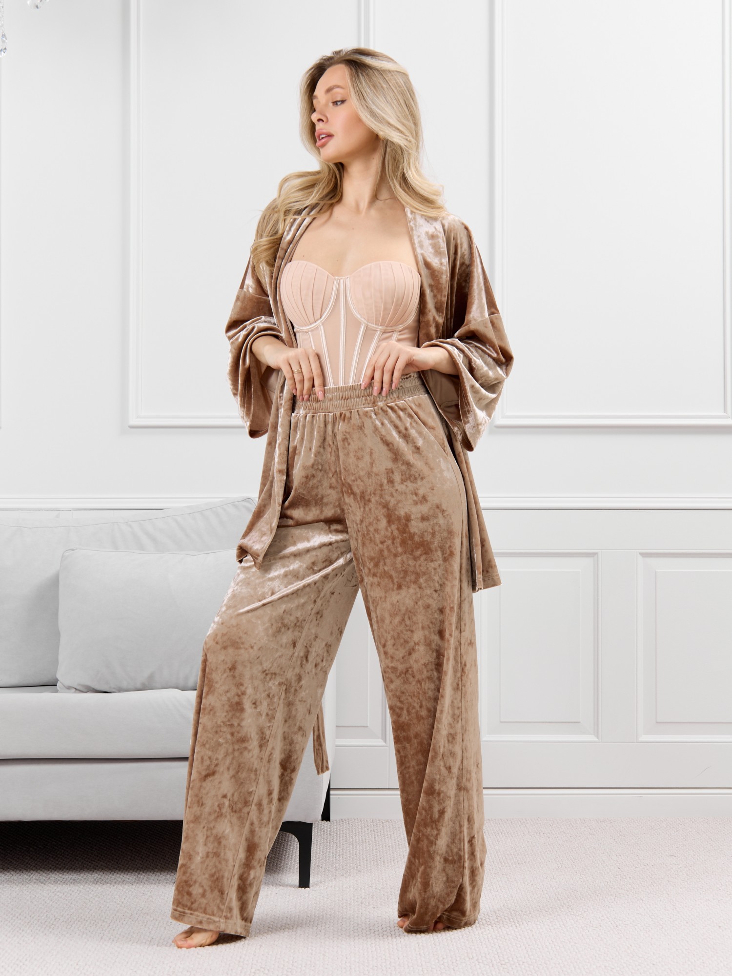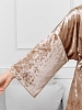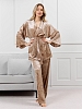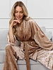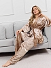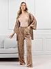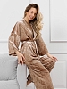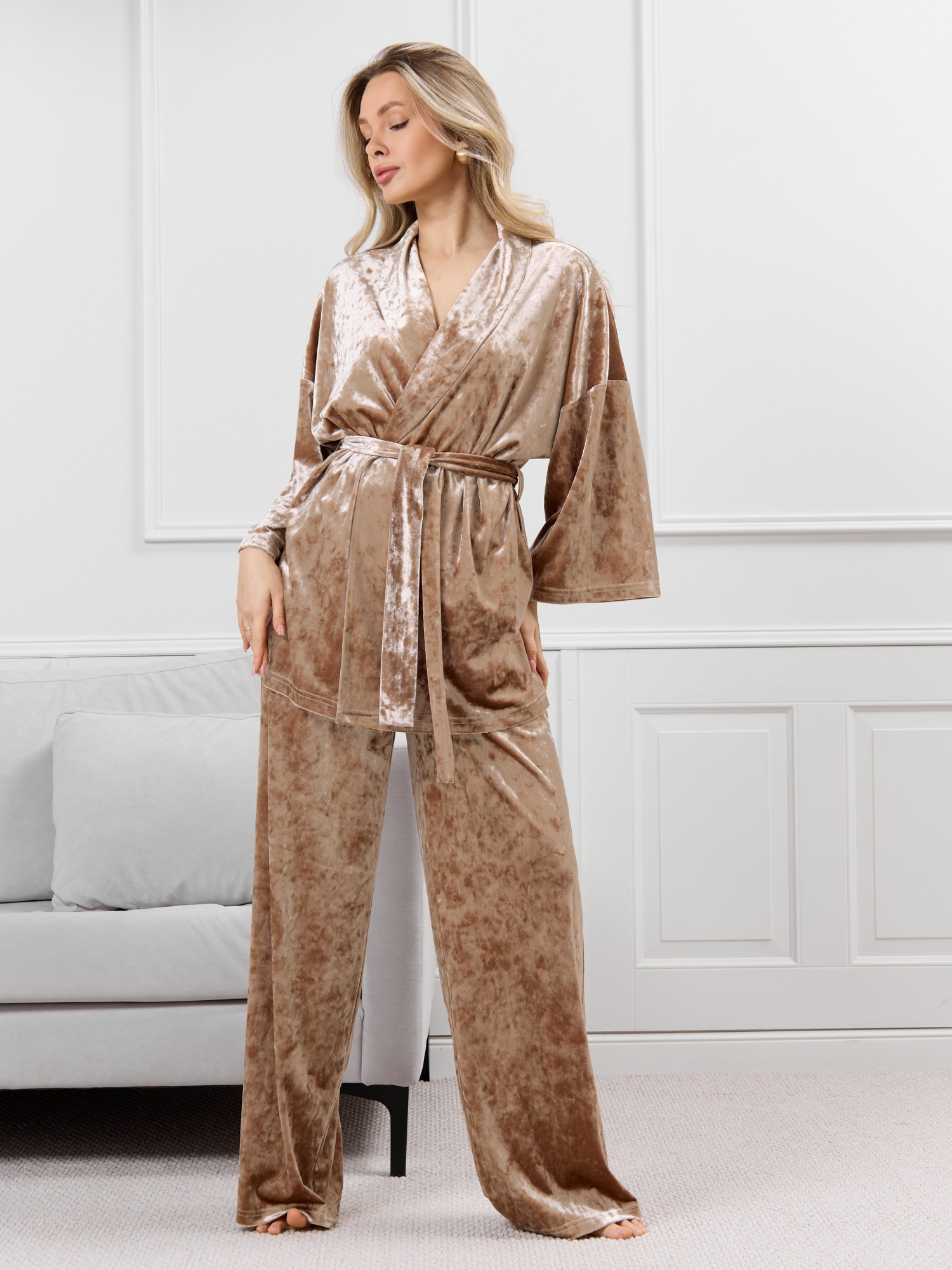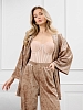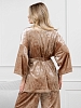 Костюм молодежный из гладкокрашенного полотна «велюр стрейч» с мраморным эффектом, состоящий из кимоно и брюк. Кимоно прямого кроя, свободное, на запахе, с втачными рукавами ¾ длины и съемным поясом, фиксирующимся на талии двумя шлевками в боковых швах.Брюки свободные, на притачном поясе с эластичной тесьмой внутри и карманами в боковых швах.