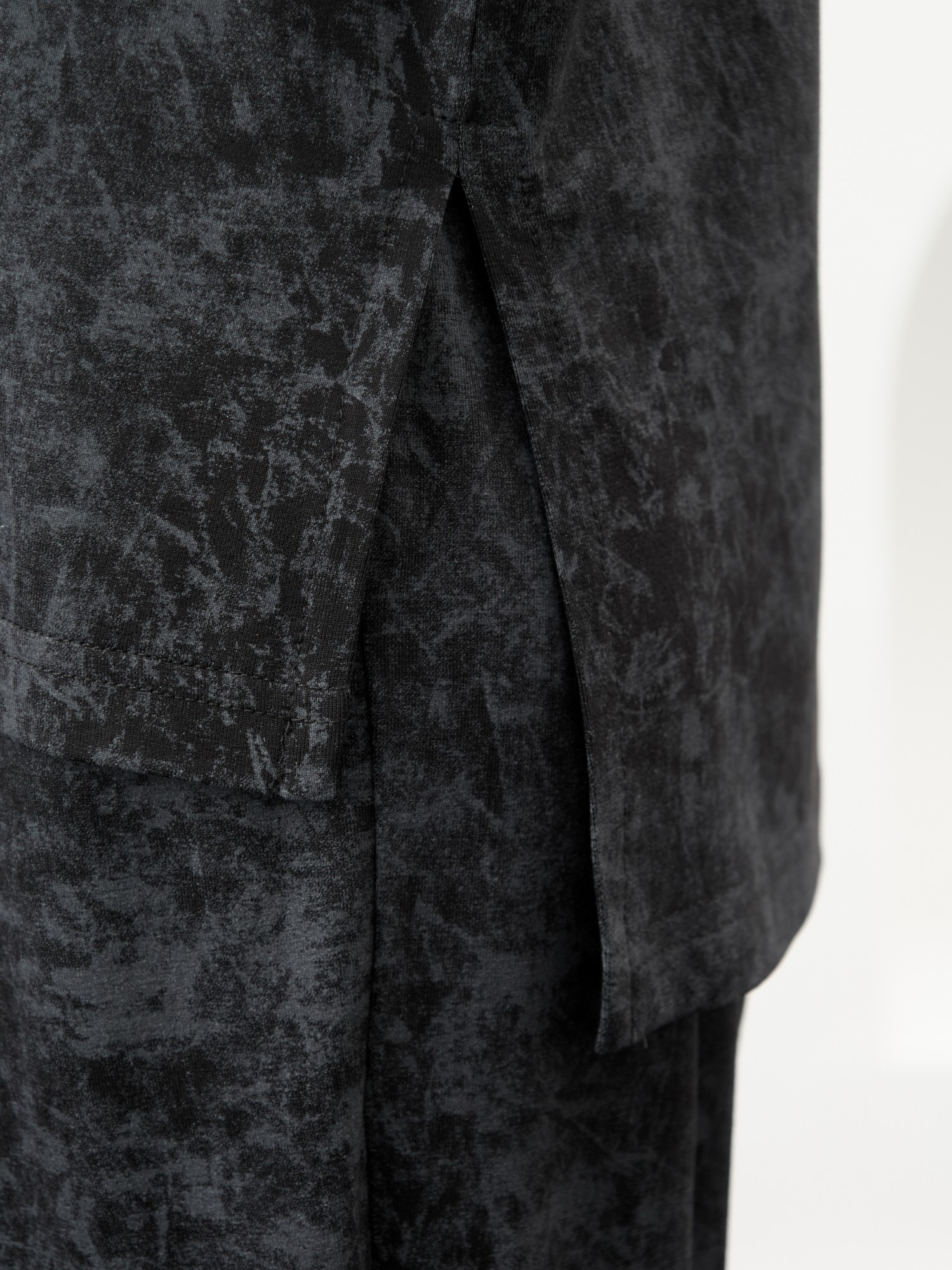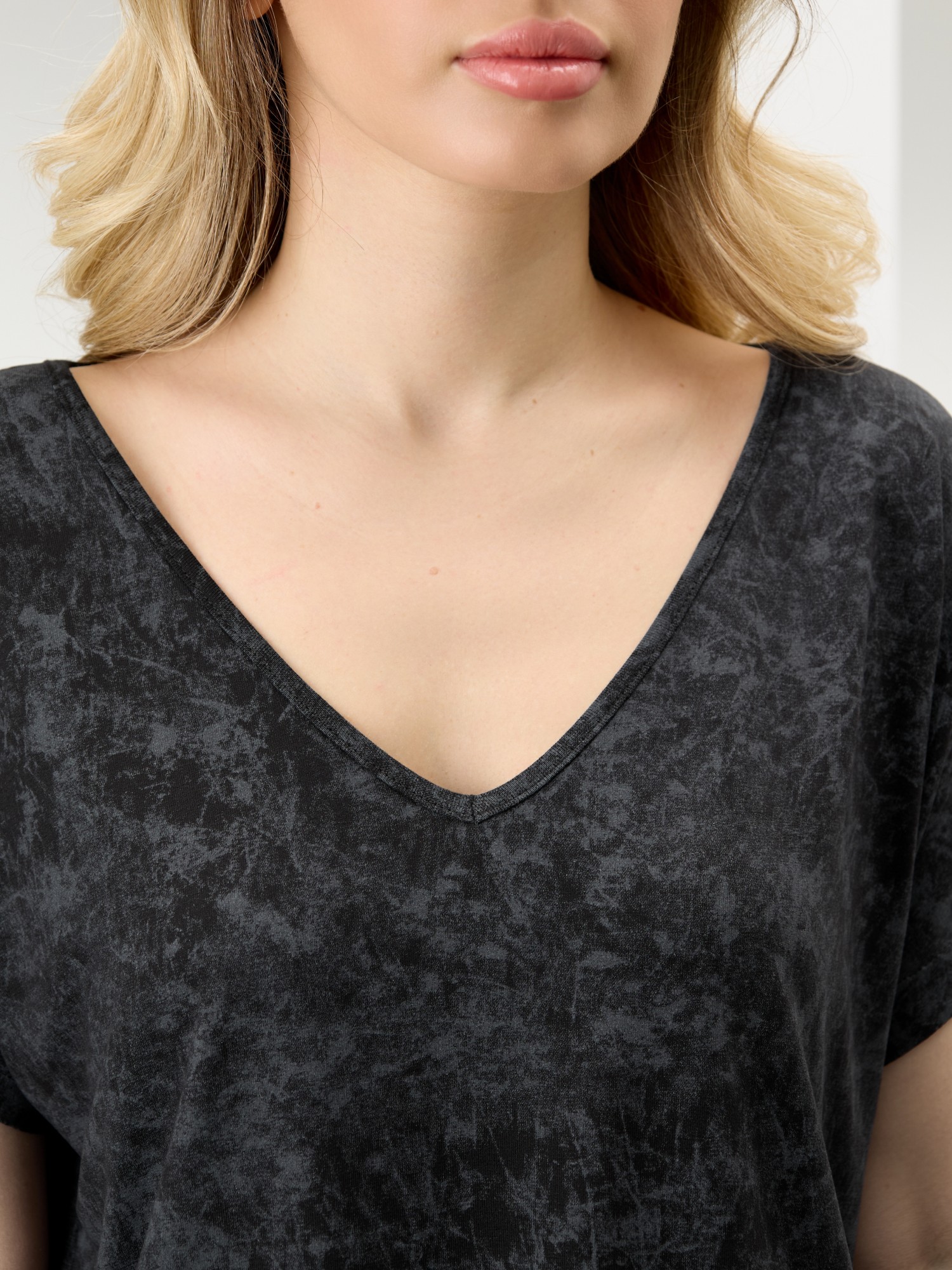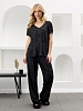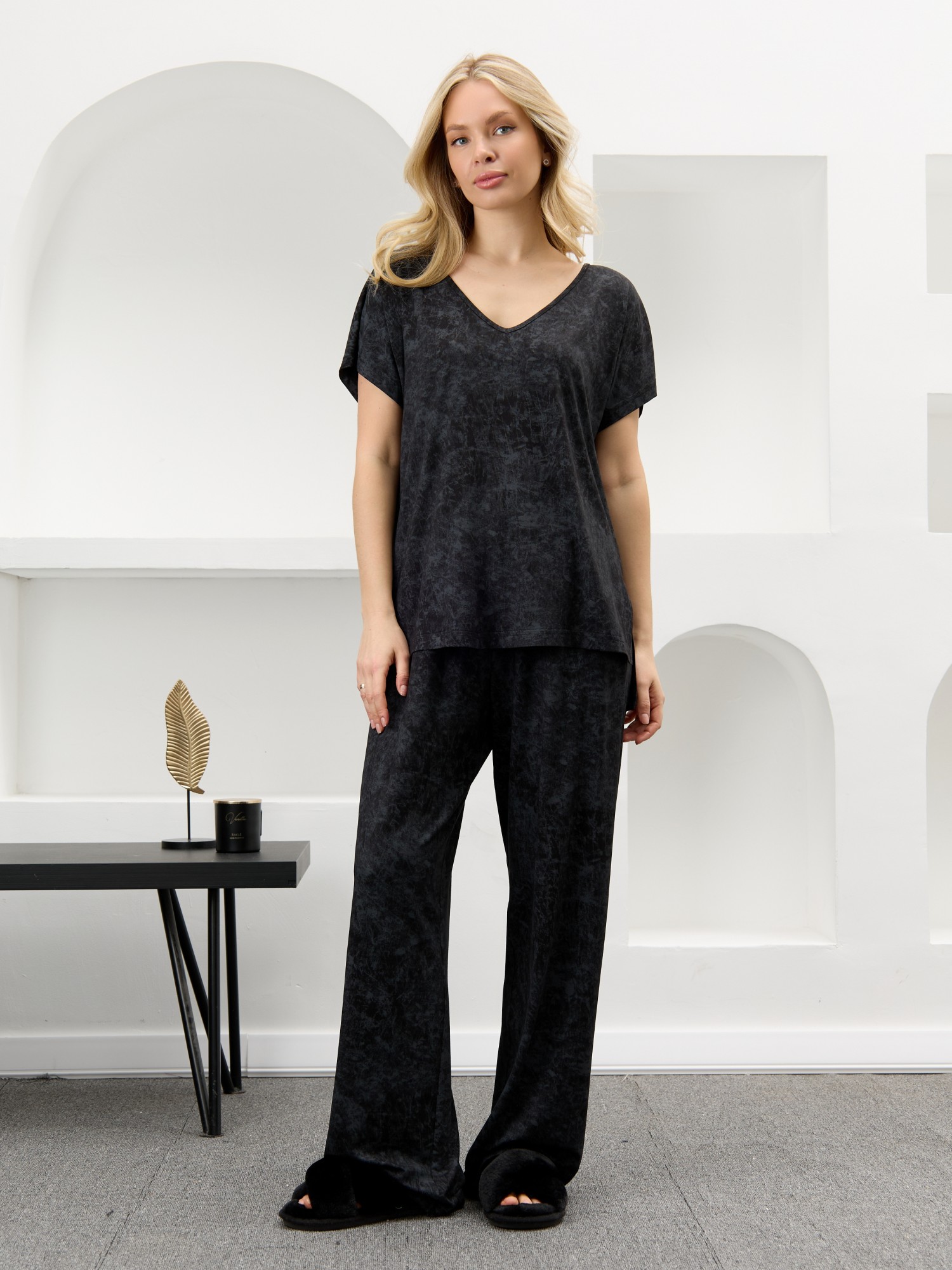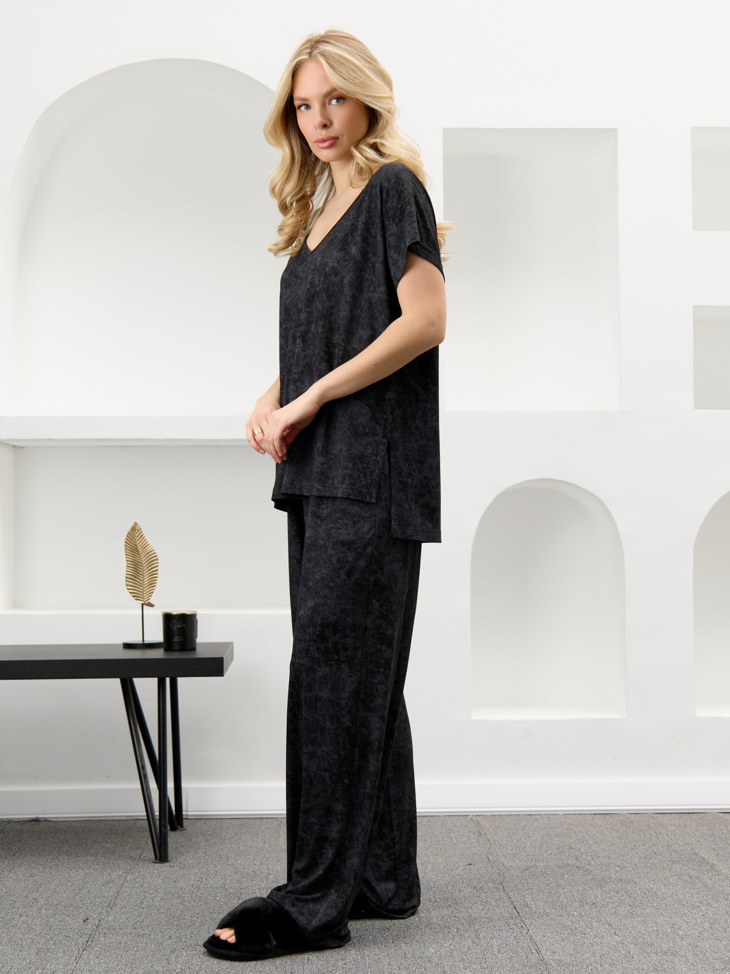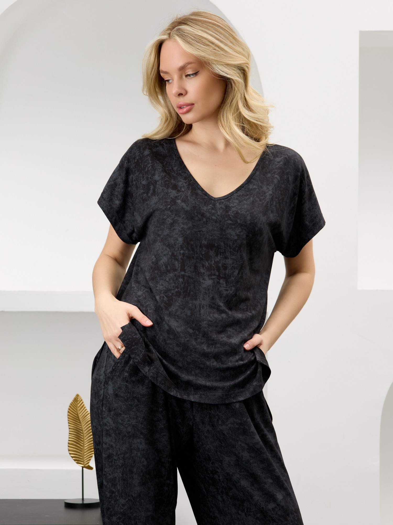 Костюм женский в комбинации двух видов полотен: из гладкокрашенного трикотажного вискозного полотна с эффектом «варенка», состоящий из футболки и брюк. Футболка - свободного покроя, с короткими цельнокроеными рукавами, горловиной V-образной формы, окантованной основным материалом и разрезами в боковых швах. Модной деталью является разница длин между полочкой и спинкой.Брюки – длинные, свободные, на притачном поясе с эластичной тесьмой внутри.