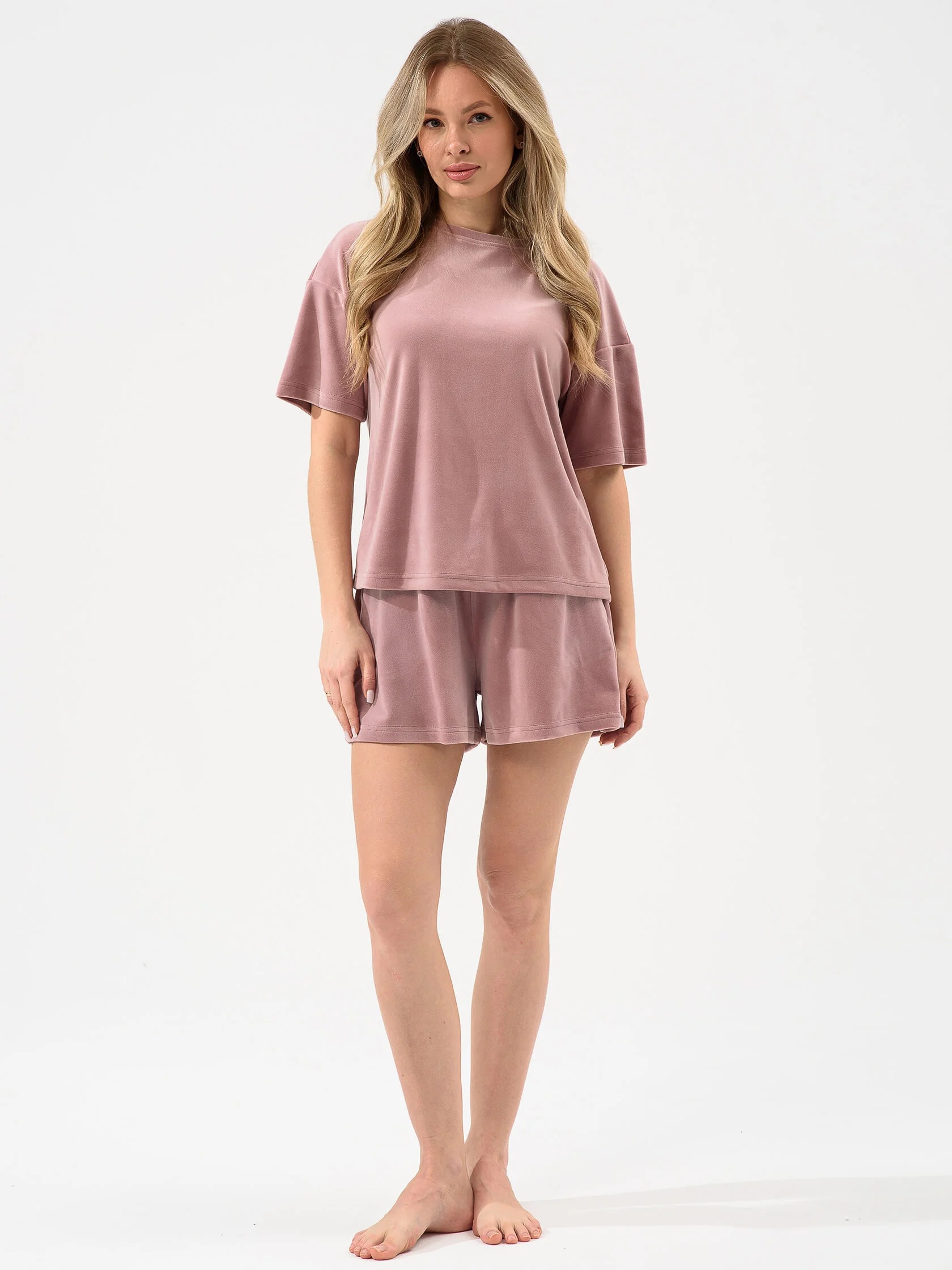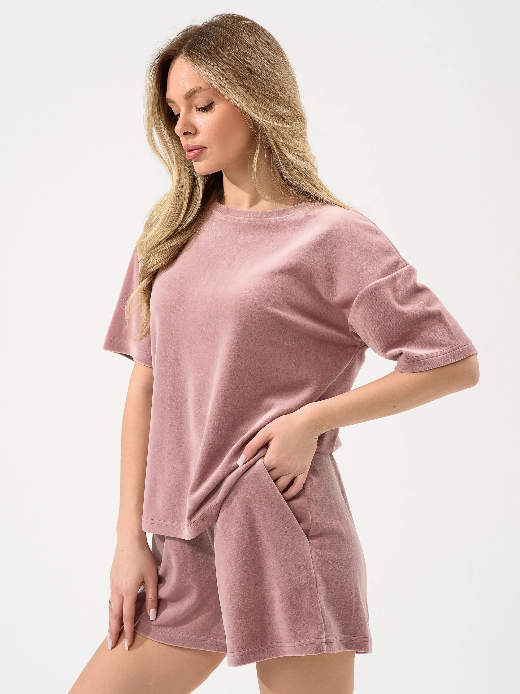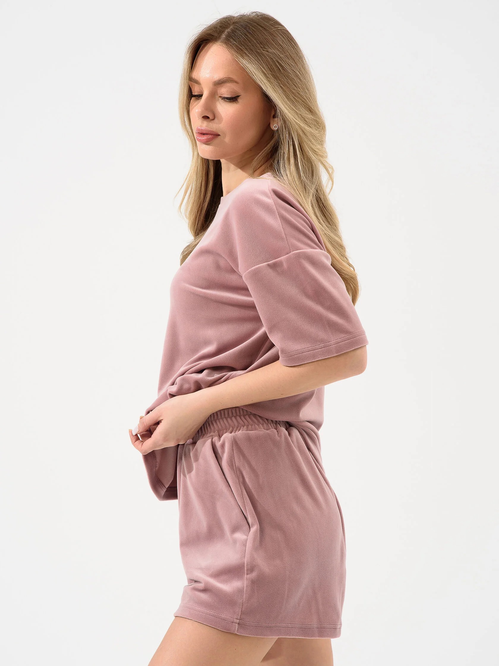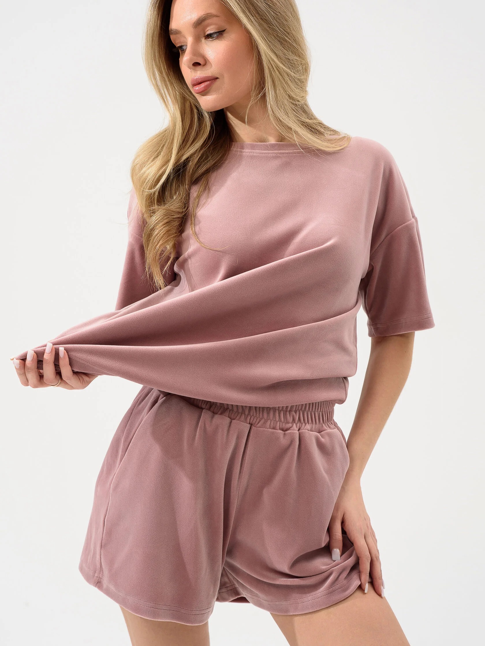 Женский костюм из велюра с шортами — это сочетание комфорта и стиля, подходящее для дома, отдыха или повседневных образов. Такие костюмы обычно состоят из футболки или толстовки и шорт на резинке, выполнены из мягкого материала, который приятен на ощупь.