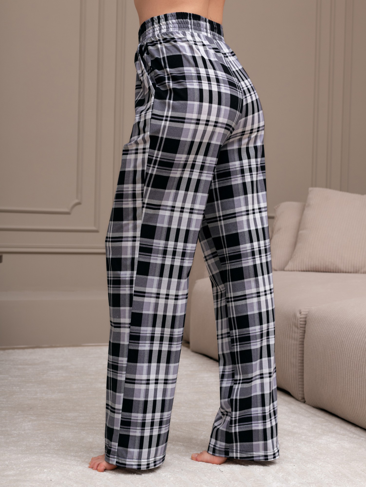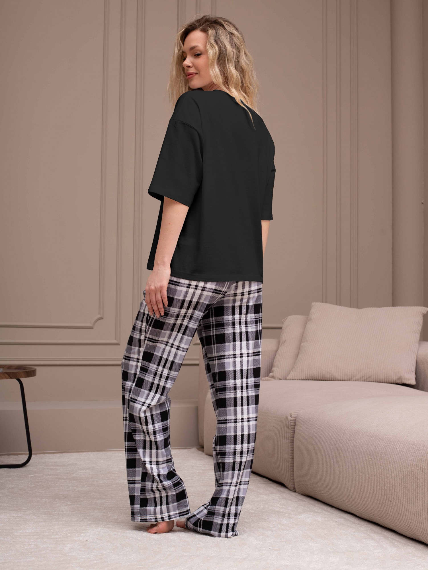 Костюм женский из трикотажного полотна "кулирка" в комбинации двух видов: гладкокрашеного и набивного с тематическим рисунком, состоящий из футболки и брюк. Футболка из гладкокрашеного полотна, свободного силуэта, со спущенной линией плеч и втачными короткими рукавами, горловиной овальной формы, обработанной втачной планкой и отделочной строчкой. В центре переда - принт, выполненный в технике шелкографии. Брюки из полотна с набивным рисунком длинные, прямые, на притачном поясе с эластичной тесьмой внутри и карманами в боковых швах.