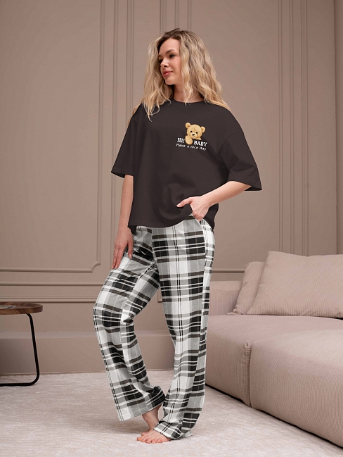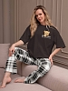 Костюм женский из трикотажного полотна "кулирка" в комбинации двух видов: гладкокрашеного и набивного с тематическим рисунком, состоящий из футболки и брюк. Футболка из гладкокрашеного полотна, свободного силуэта, со спущенной линией плеч и втачными короткими рукавами, горловиной овальной формы, обработанной втачной планкой и отделочной строчкой. В центре переда - принт, выполненный в технике шелкографии. Брюки из полотна с набивным рисунком длинные, прямые, на притачном поясе с эластичной тесьмой внутри и карманами в боковых швах.