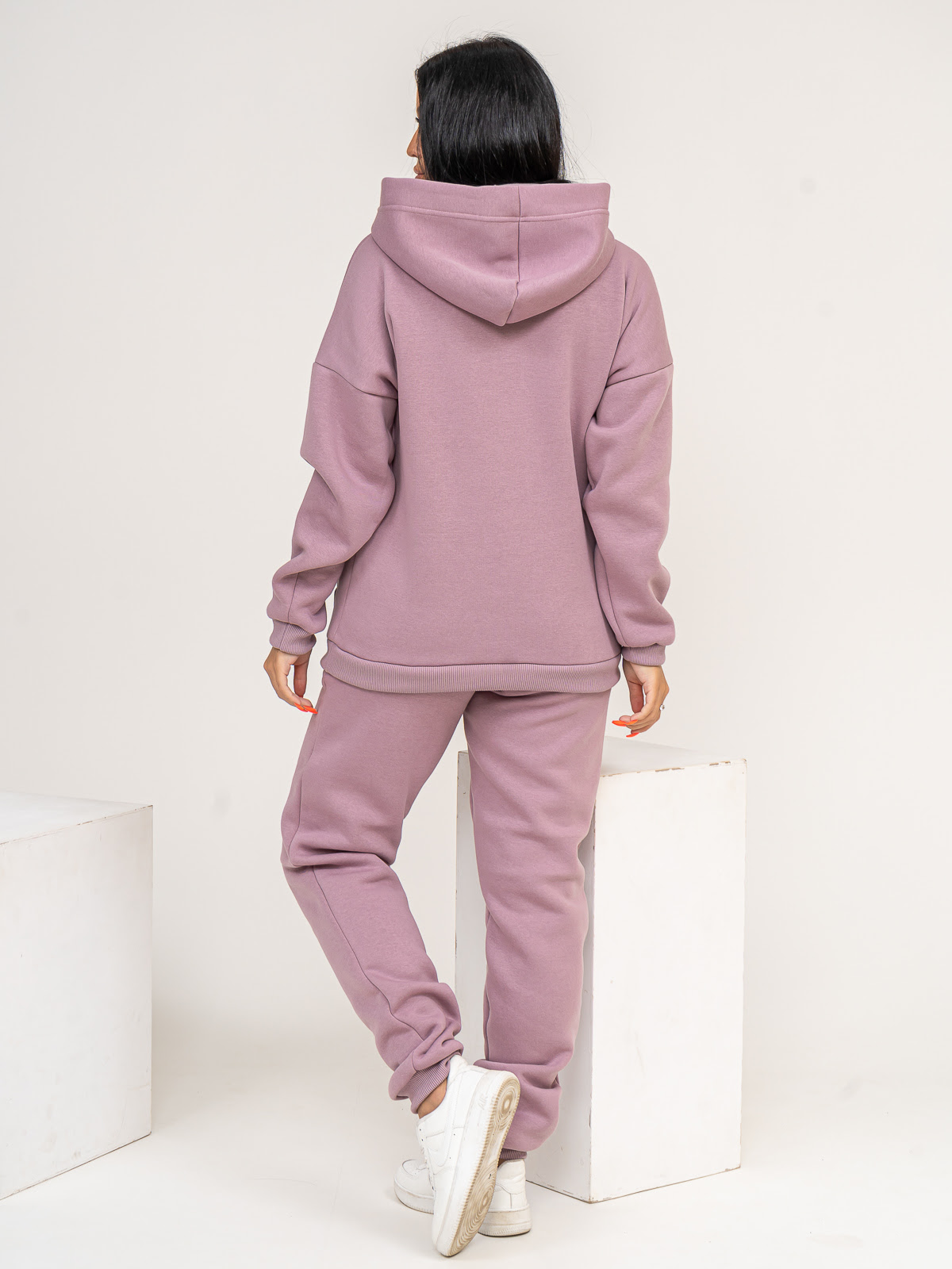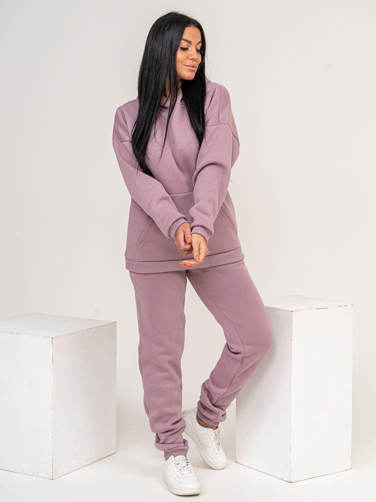 Женский трикотажный костюм из футера с начесом. Толстовка в стиле oversize со спущенной линией плеча и капюшоном. На полочке карман - кенгуру. Брюки полуприлегающего силуэта, с боковыми карманами с отрезным бочком. Отделка из ткани в рубчик, по низу толстовки, рукавам и по низу брюк. Костюм идеально подойдет для сезона осень-зима, в нем вы будете чувствовать себя комфортно в прохладную погоду.