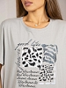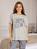 Костюм женский из трикотажного полотна, состоящий из бридж и футболки. Футболка полуприлегающего силуэта длинной чуть ниже уровня бёдер с принтом на полке. Вырез горловины О-образный. Бриджи из трикотажного полотна длинной ниже уровня колена.