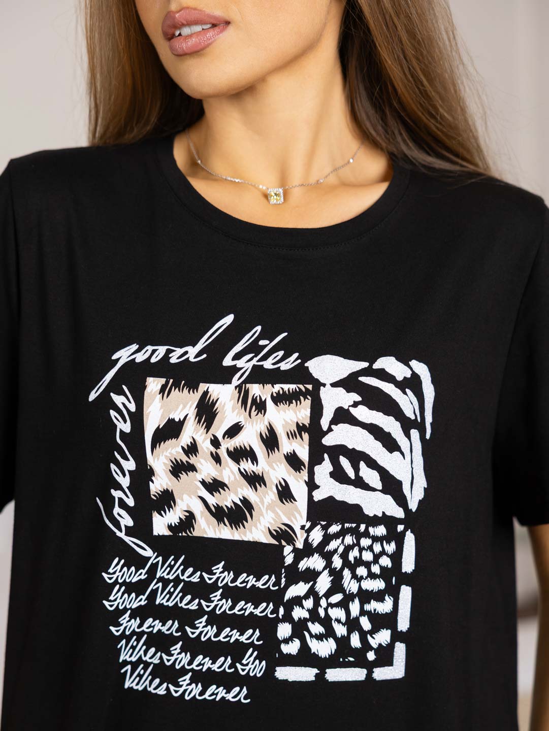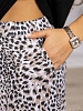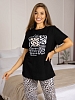 Костюм женский из трикотажного полотна, состоящий из бридж и футболки. Футболка полуприлегающего силуэта длинной чуть ниже уровня бёдер с принтом на полке. Вырез горловины О-образный. Бриджи из трикотажного полотна длинной ниже уровня колена.