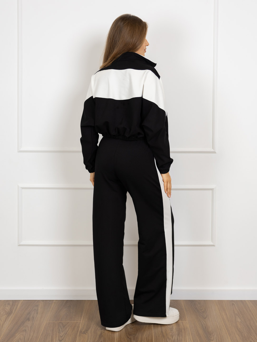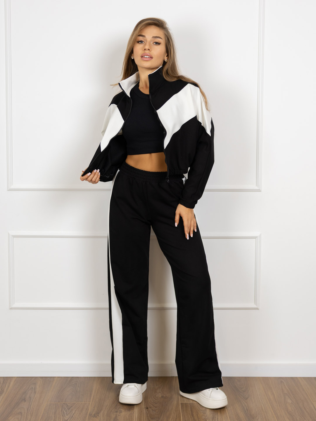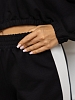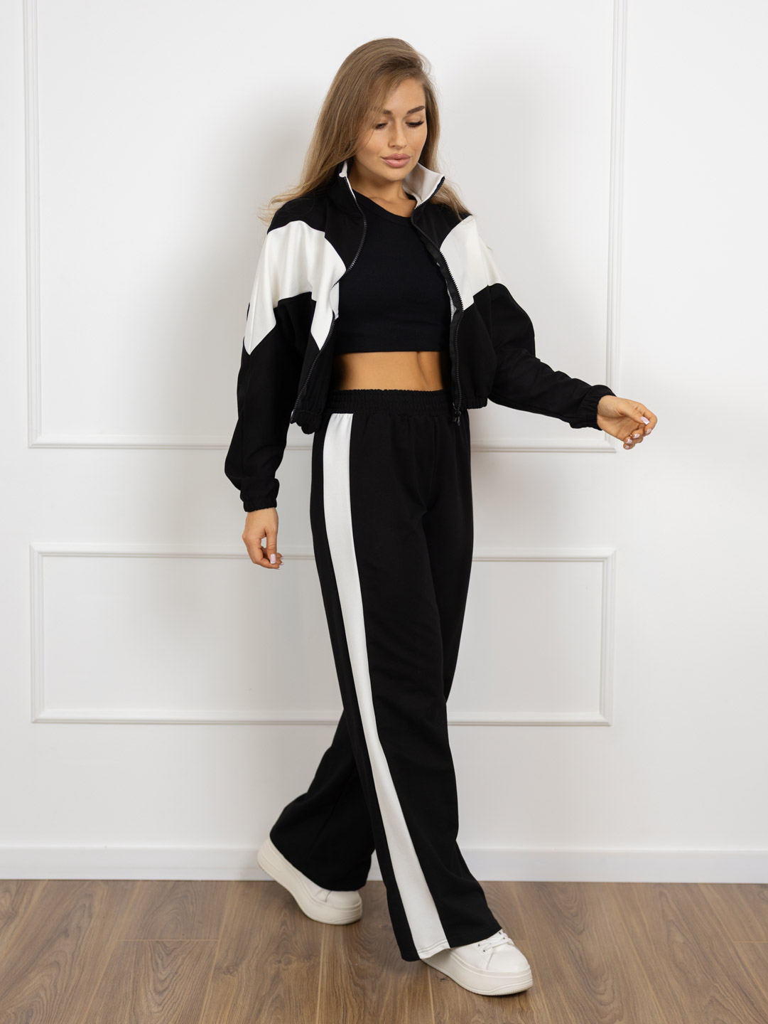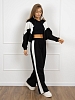 Женский спортивный костюм из футера двунитки. Укороченная олимпийка с резинкой 2см по низу и по рукаву, V-образные вставки и воротник с внутренней стороны выполнены из футера компаньона, внутри место соединения воротника и основы обработано окантовкой, использована качественная фурнитура. Брюки с широкими лампасами и поясом на резинке, выполненным на поясной машине.
