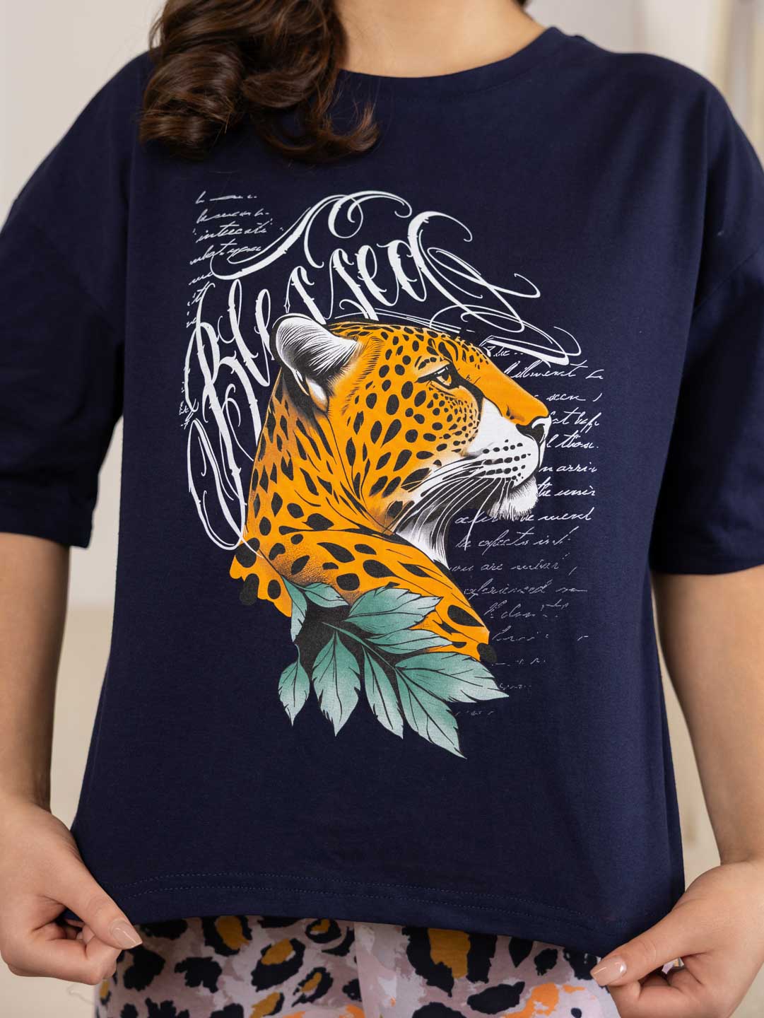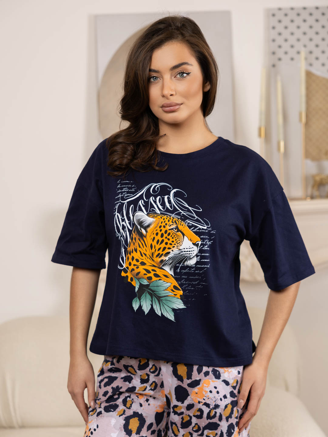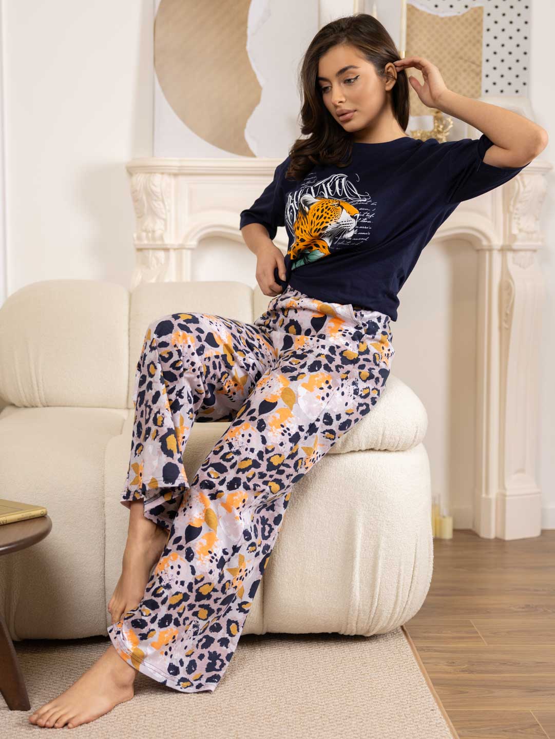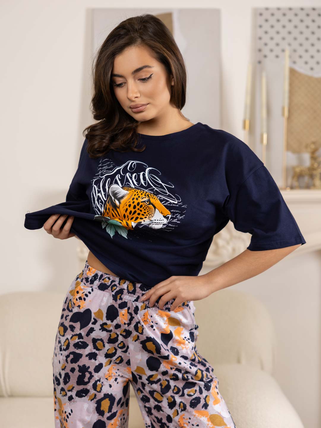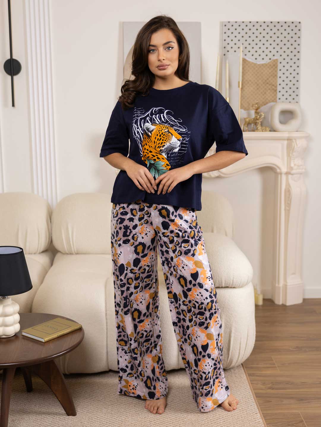 Домашний костюм из хлопка идеально подойдет для дома. Комплект состоит из брюк и футболки. Широкие брюки с карманами на эластичном поясе. Футболка со спущенной линией плеча и свободным силуэтом обеспечит комфорт во время отдыха, спереди и сзади нанесен принт. Рост модели 165см.