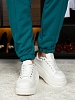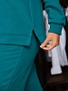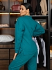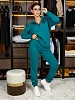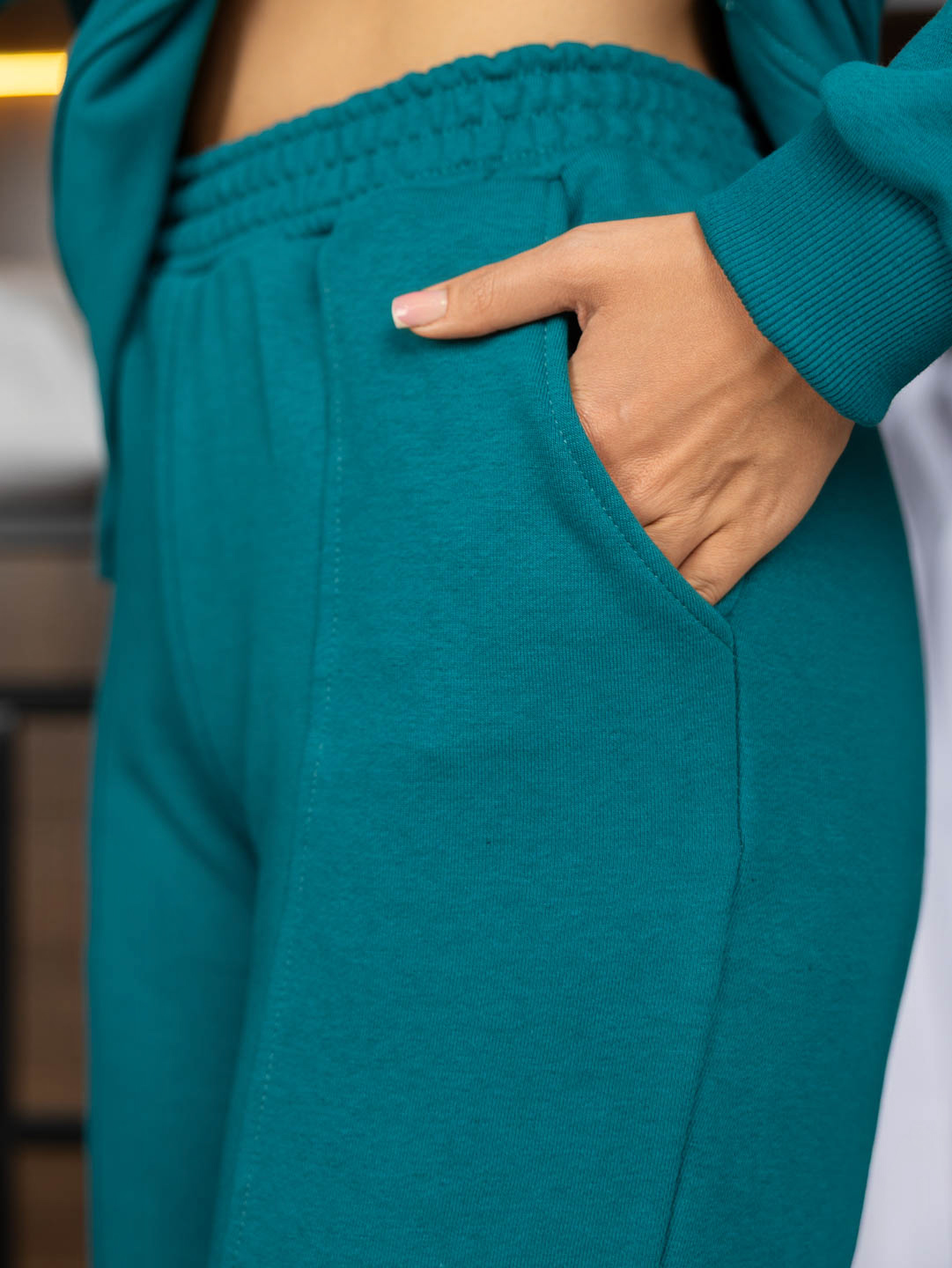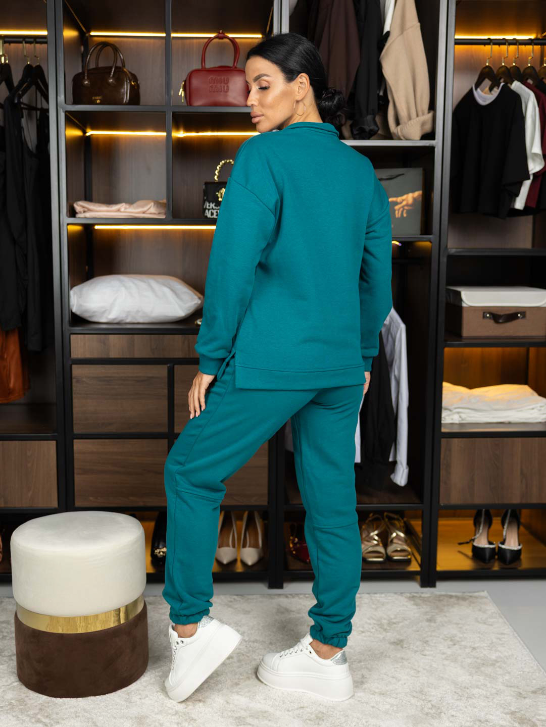 Костюм женский из футера диагонали. Толстовка с воротником стойкой на молнии, с разрезами по боковым швам и печатью эмблемой на кокетке спереди. Брюки джоггеры с имитацией стрелок спереди и декоративными швами сзади чуть ниже уровня колена, карманами в боковых швах и поясом-резинкой с несколькими декоративными строчками.