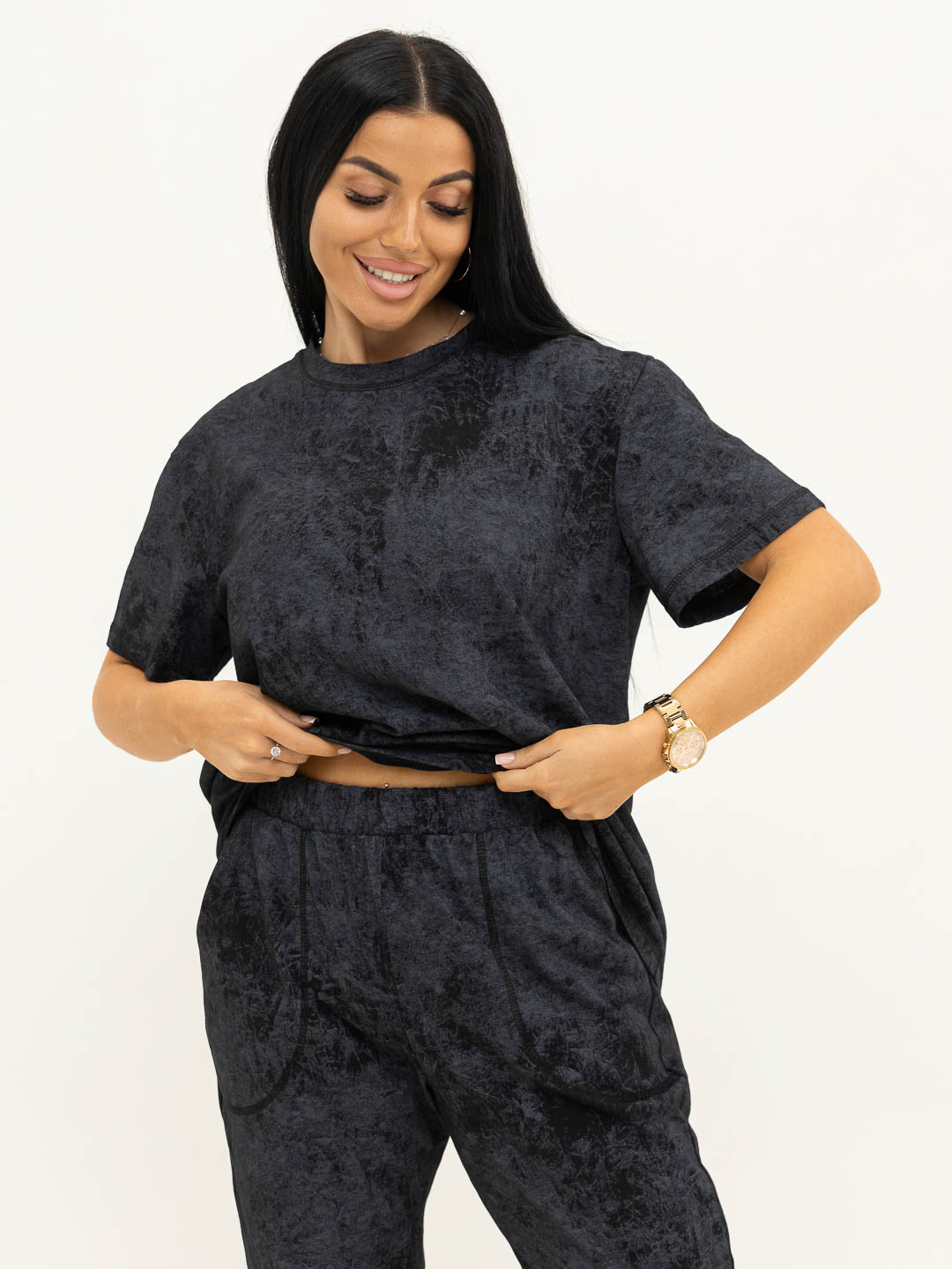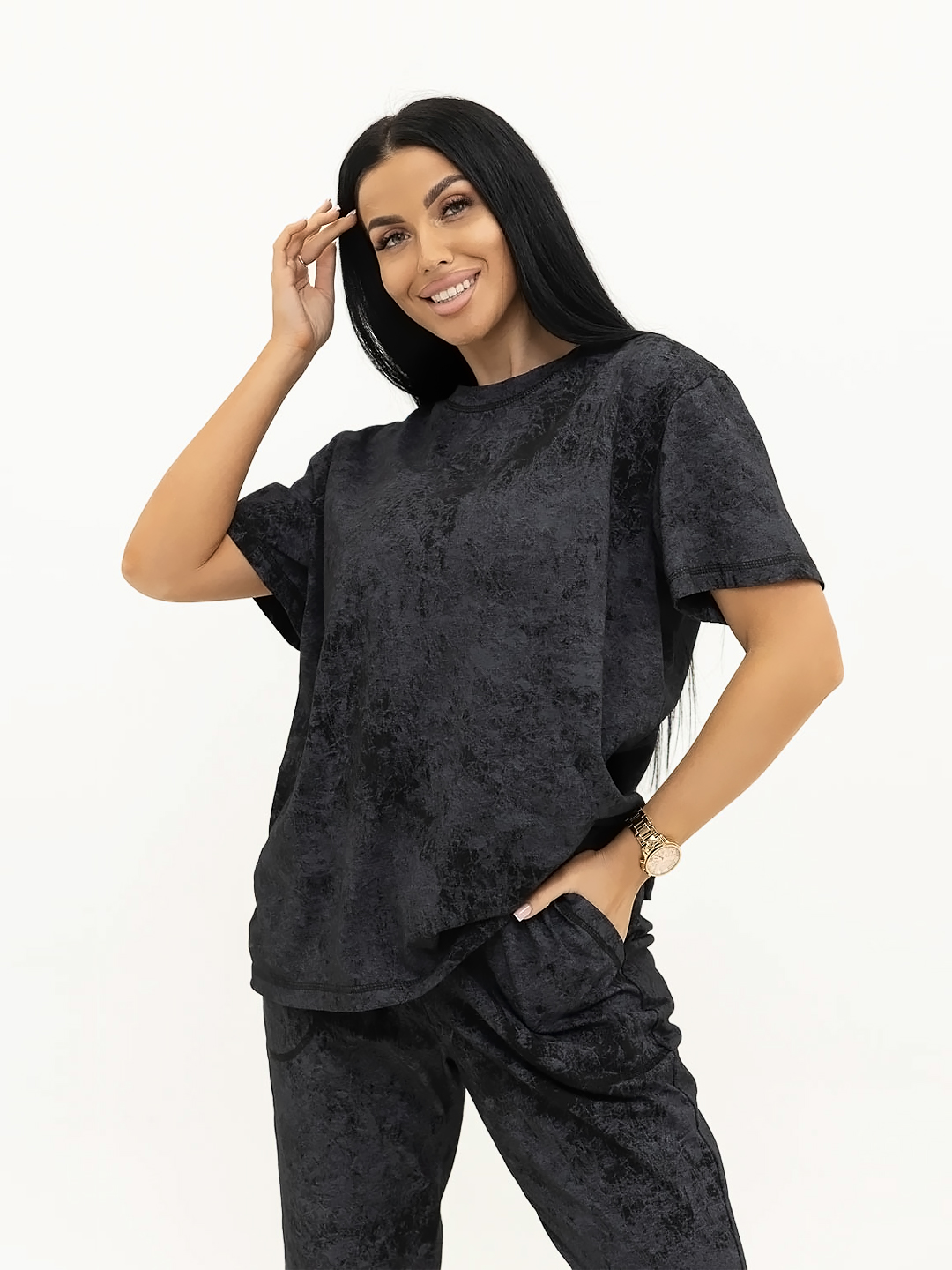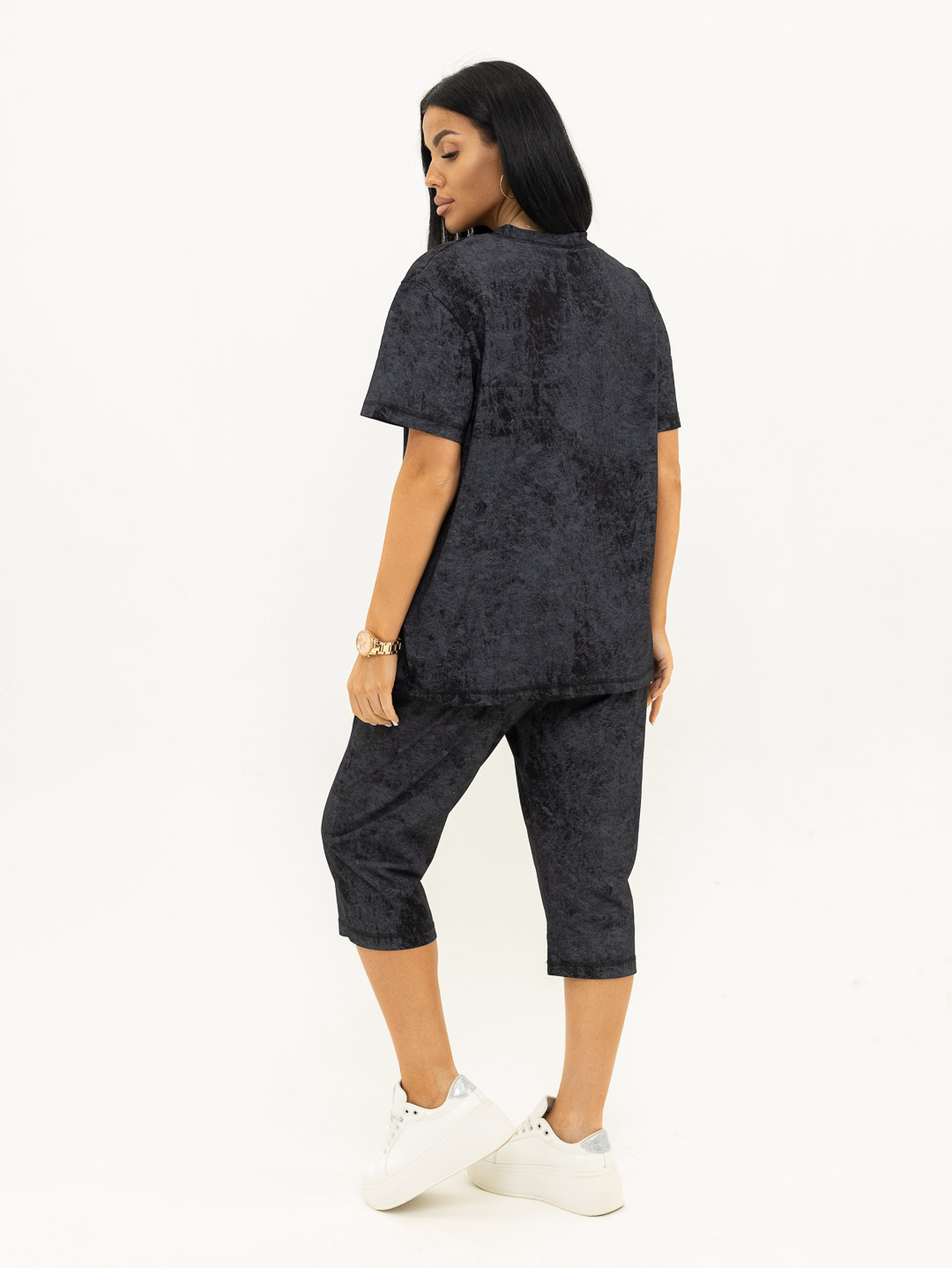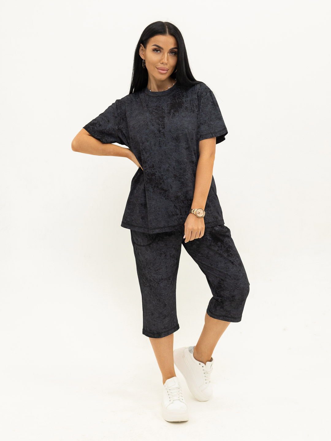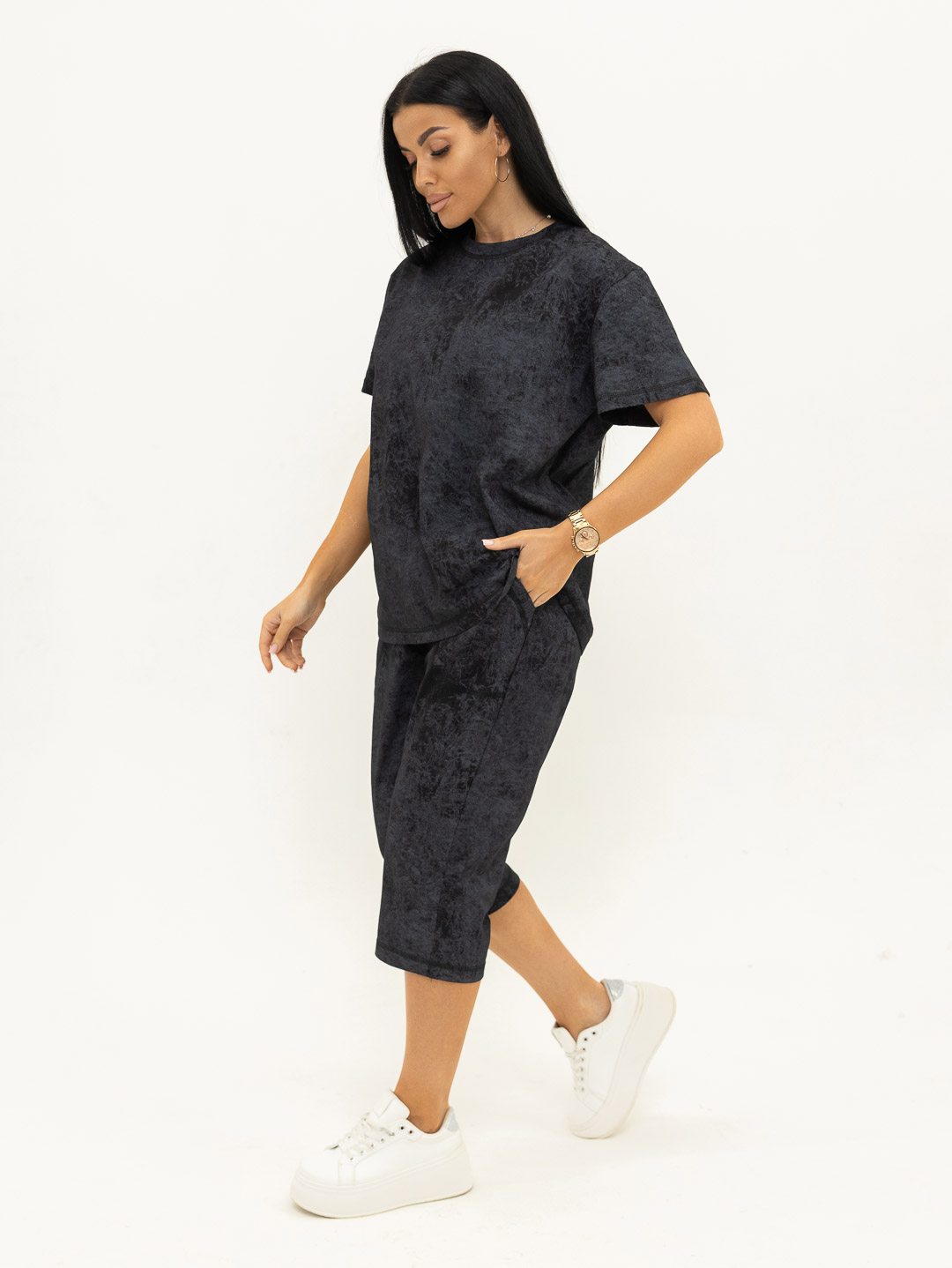 Костюм женский трикотажный - футболка и бриджи. Футболка свободного силуэта в стиле оверсайз, со спущенным рукавом и округлой горловиной. Бриджи с широким поясом на резинке, для идеальной посадки и удобными накладными карманами. Актуальный летний дизайн в стиле - варёнка, создаст яркий неповторимый образ на каждый день.