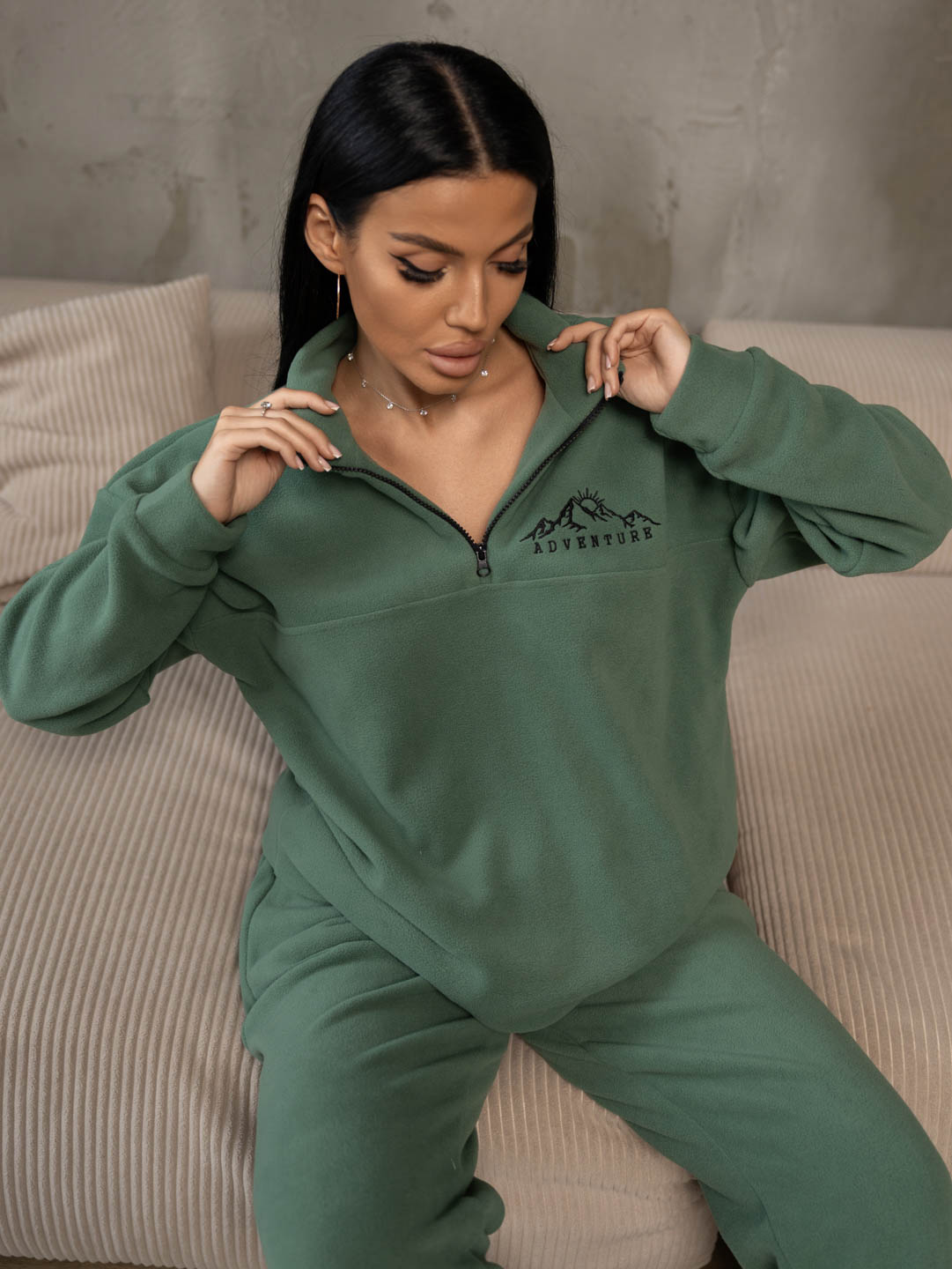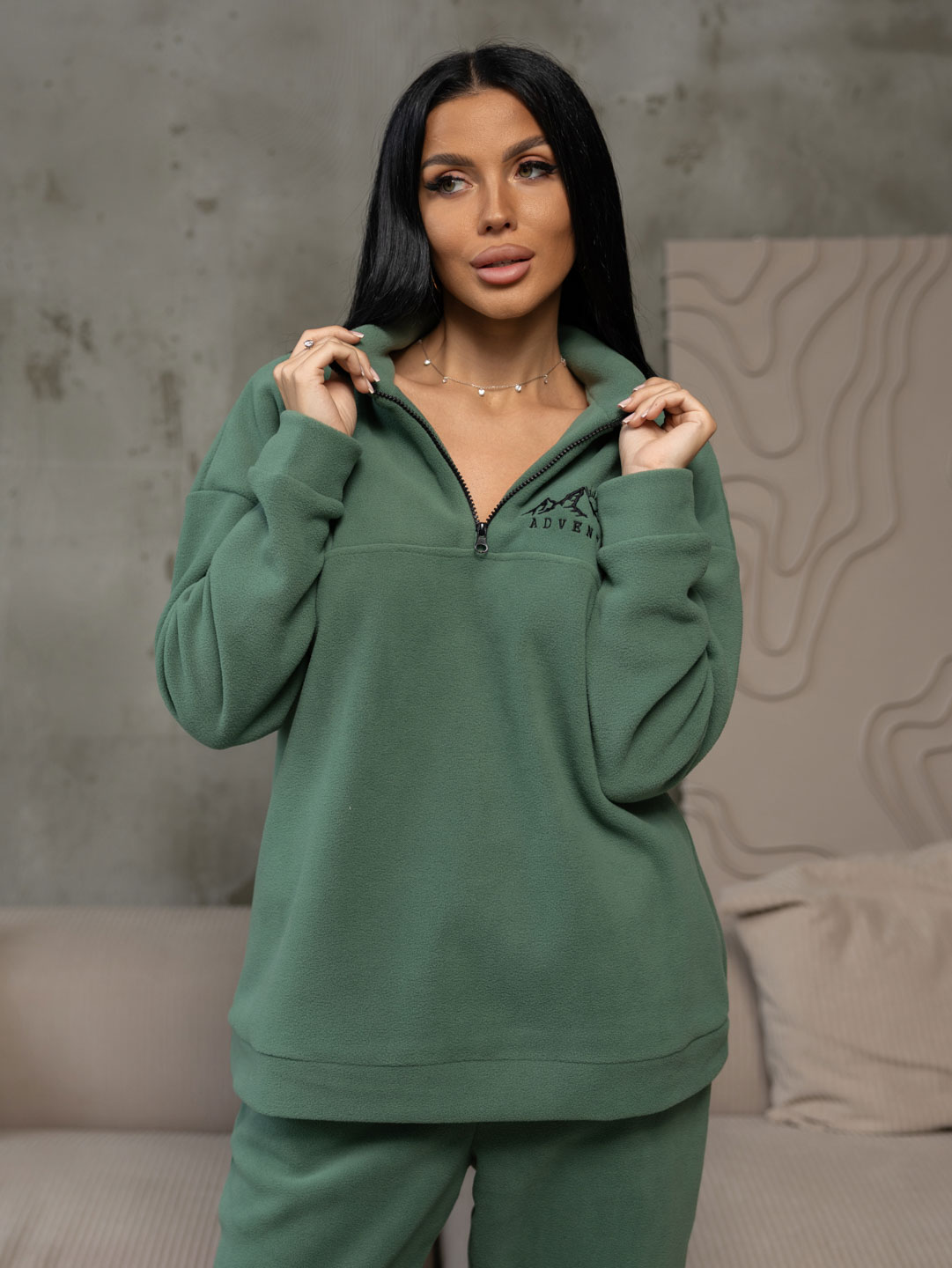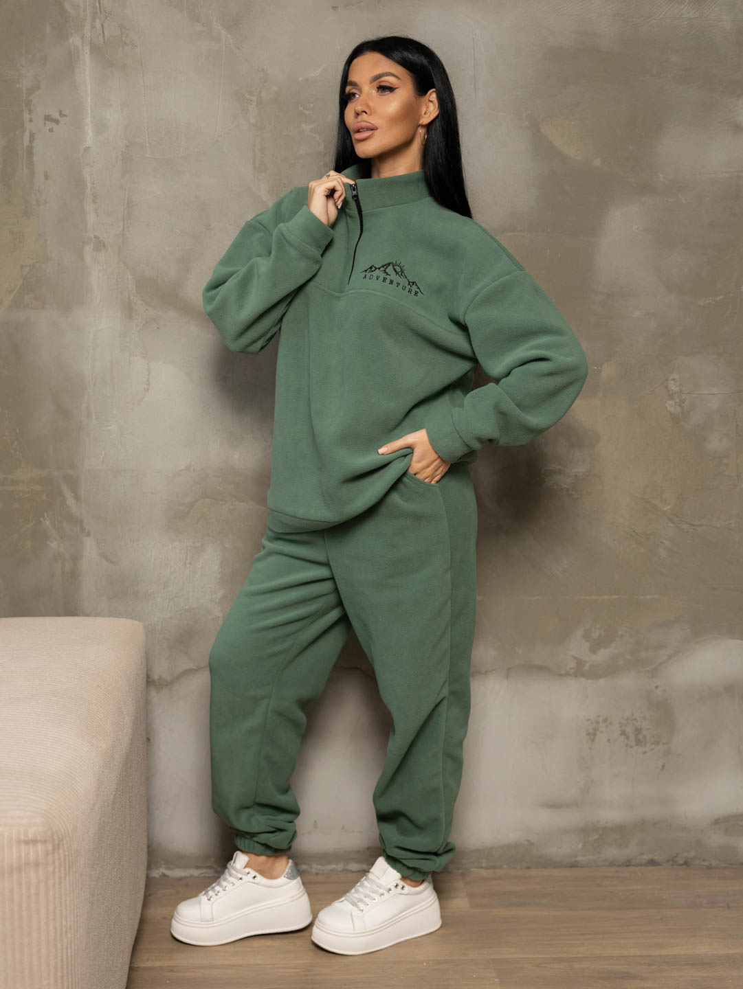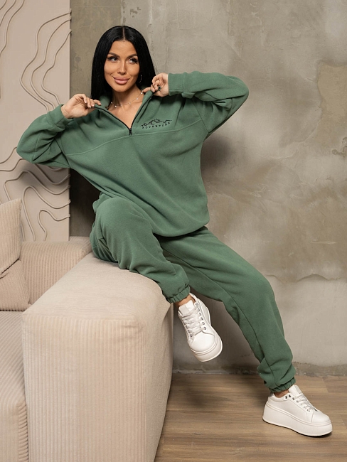Костюм женский из флиса. Худи "оверсайз", с воротником - стойка на молнии, спущенным рукавом с манжетой и вышивкой на груди. Брюки - джогеры, с удобным поясом с несколькими отстрочками и глубокими карманами. Костюм отлично подойдет для прогулок в прохладную погоду.