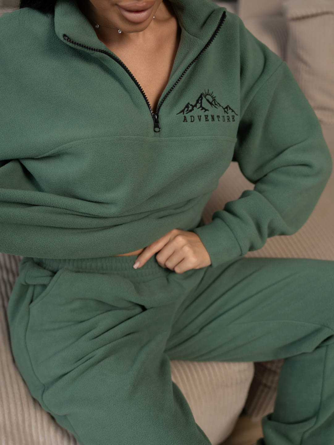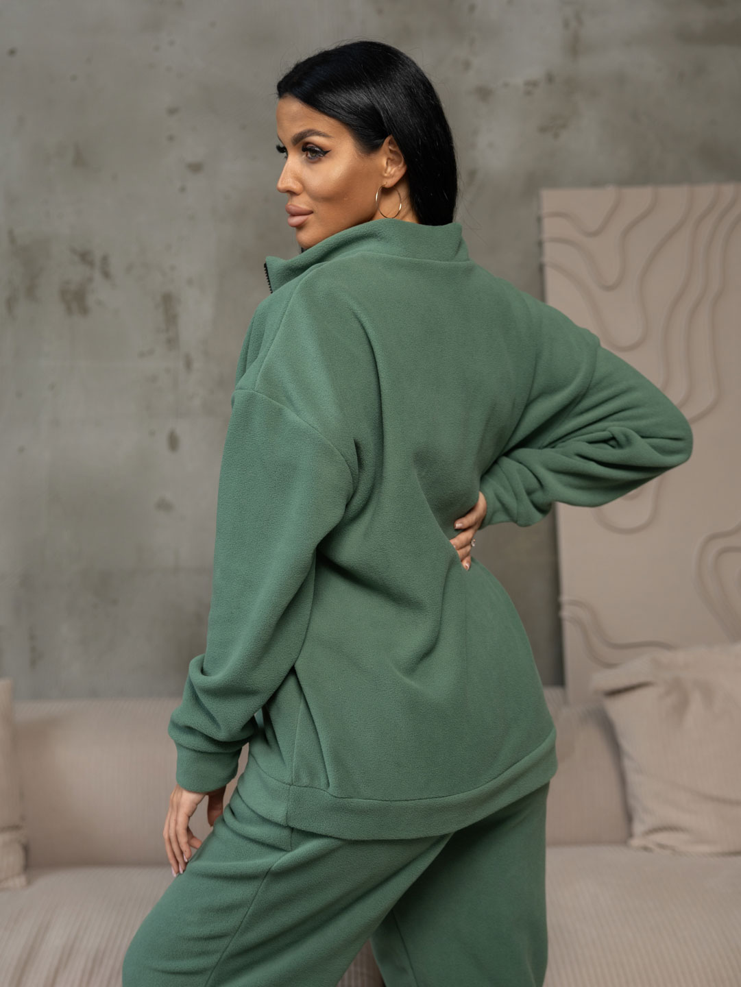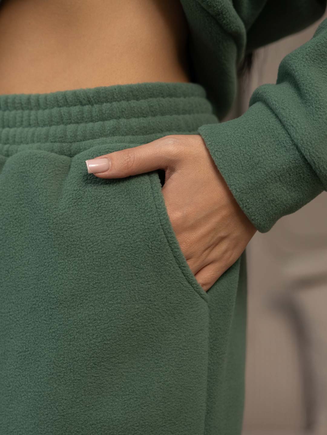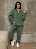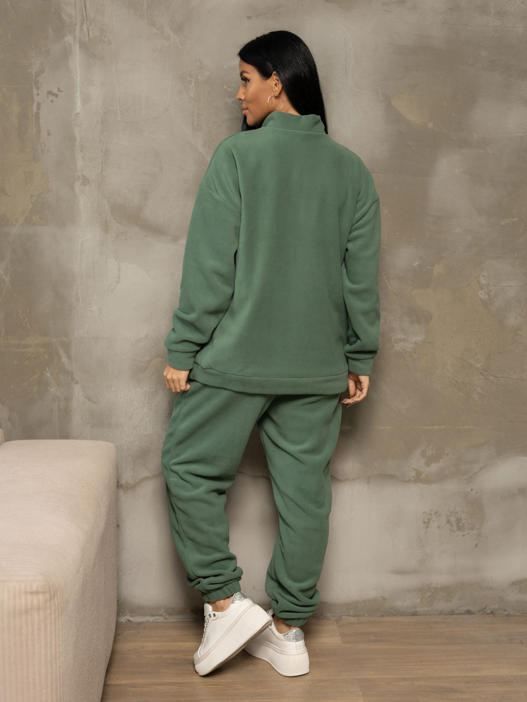 Костюм женский из флиса. Худи "оверсайз", с воротником - стойка на молнии, спущенным рукавом с манжетой и вышивкой на груди. Брюки - джогеры, с удобным поясом с несколькими отстрочками и глубокими карманами. Костюм отлично подойдет для прогулок в прохладную погоду.