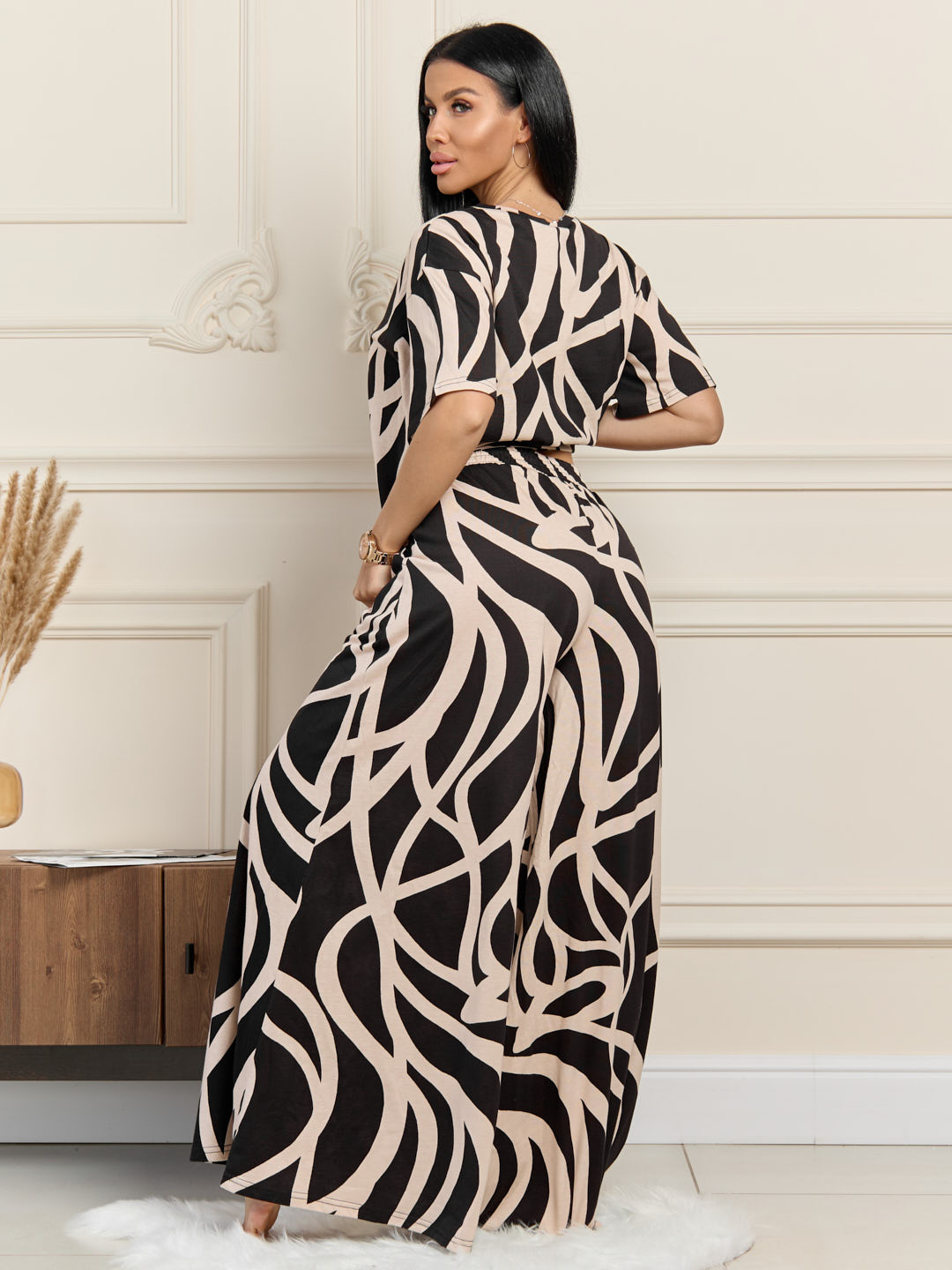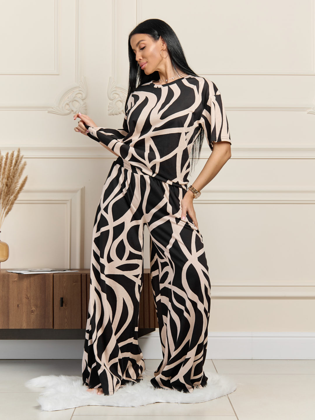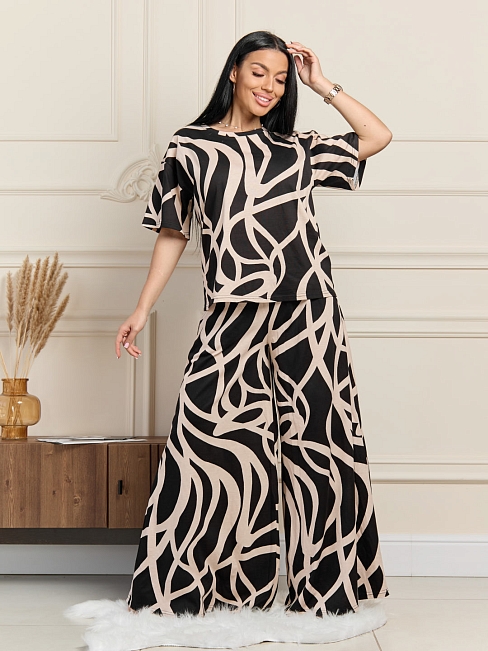 Элегантный домашний костюм из хлопка. Футболка с О-образной горловиной, спущенной линией плеча и коротким рукавом. Брюки-солнце с карманами и поясом на резинке.