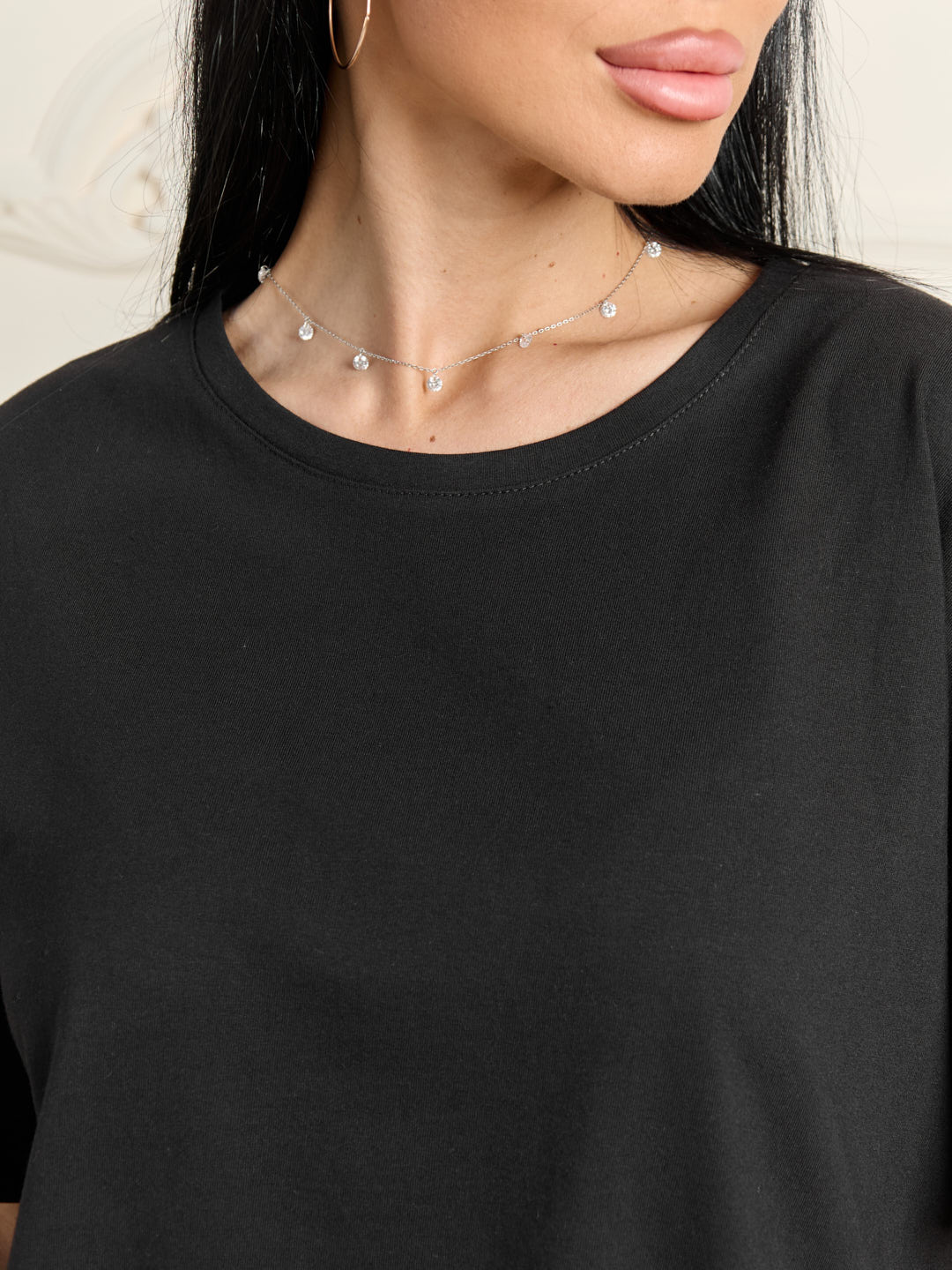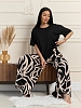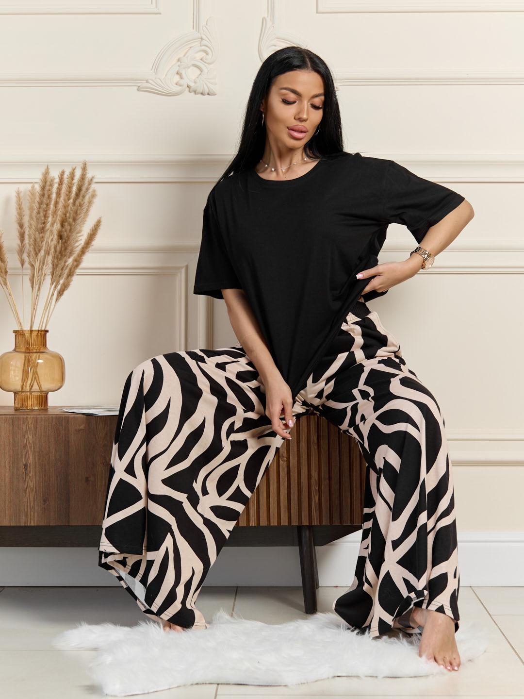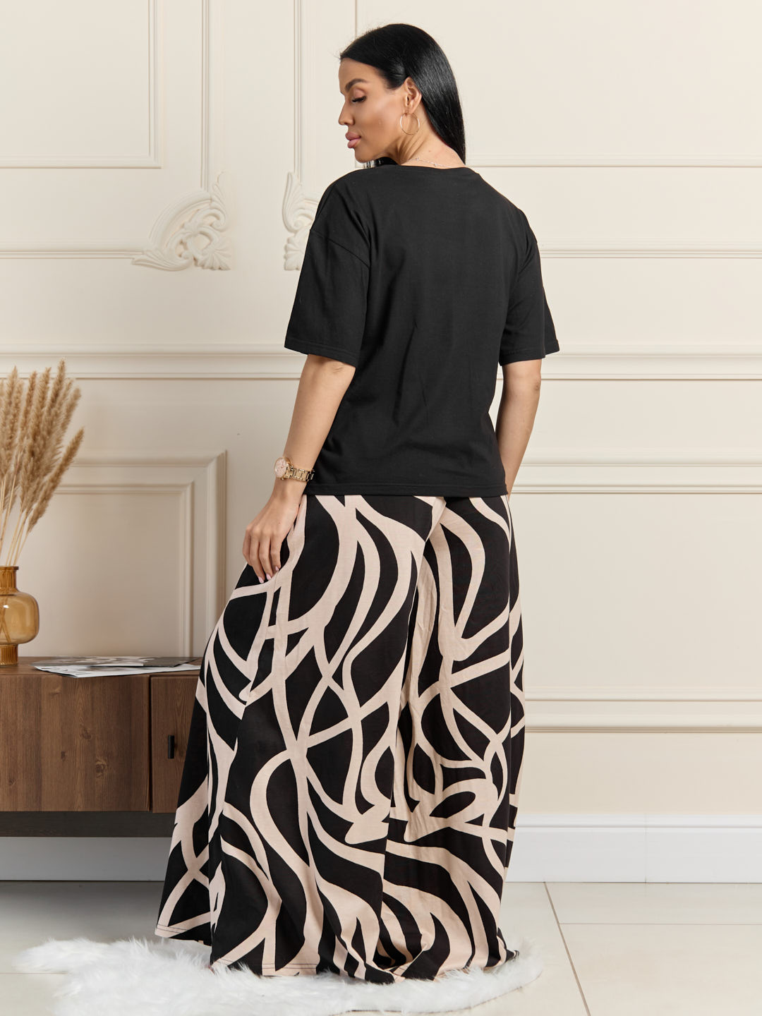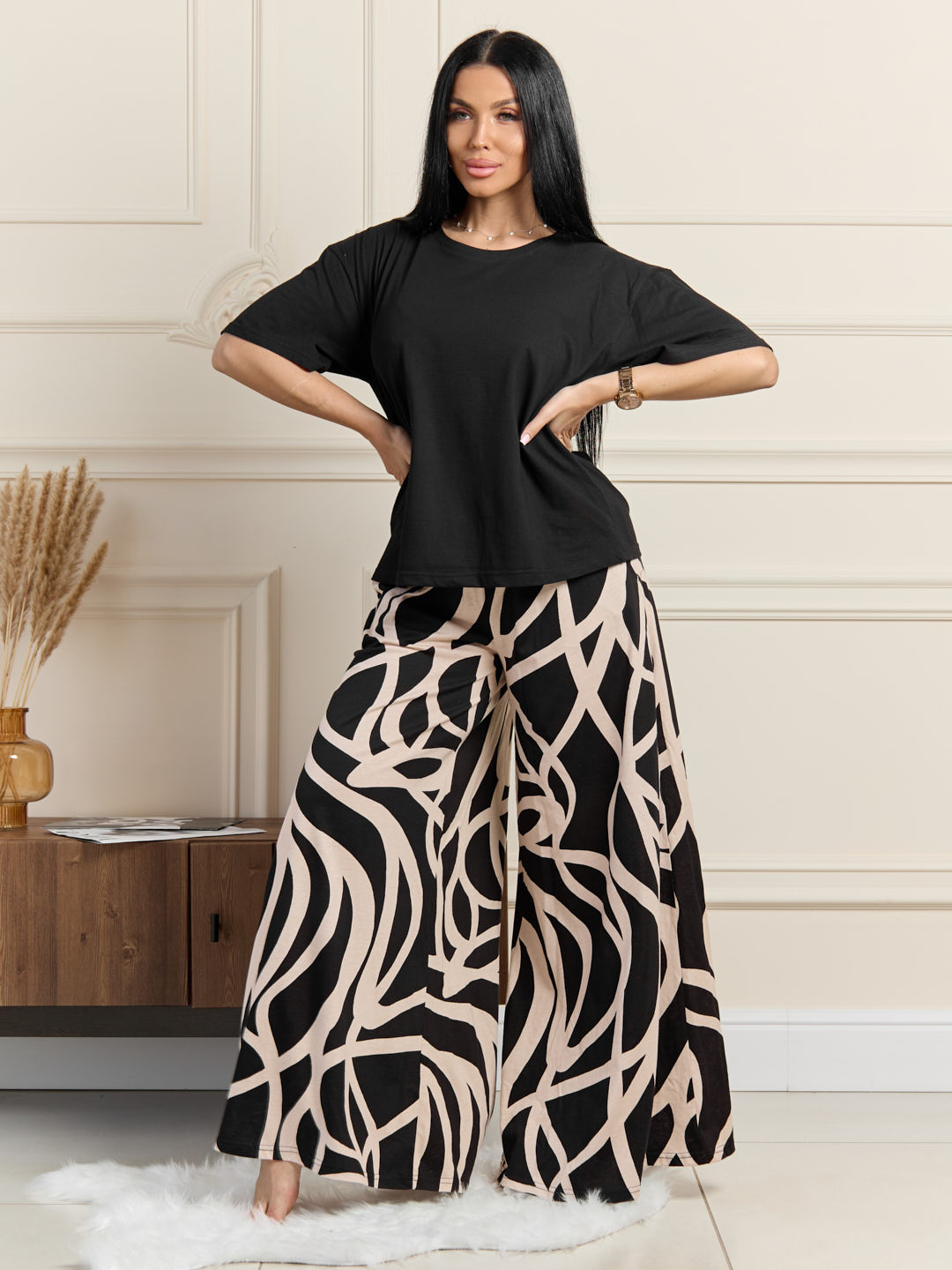 Элегантный домашний костюм из хлопка. Футболка с О-образной горловиной, спущенной линией плеча и коротким рукавом. Брюки-солнце с карманами и поясом на резинке.