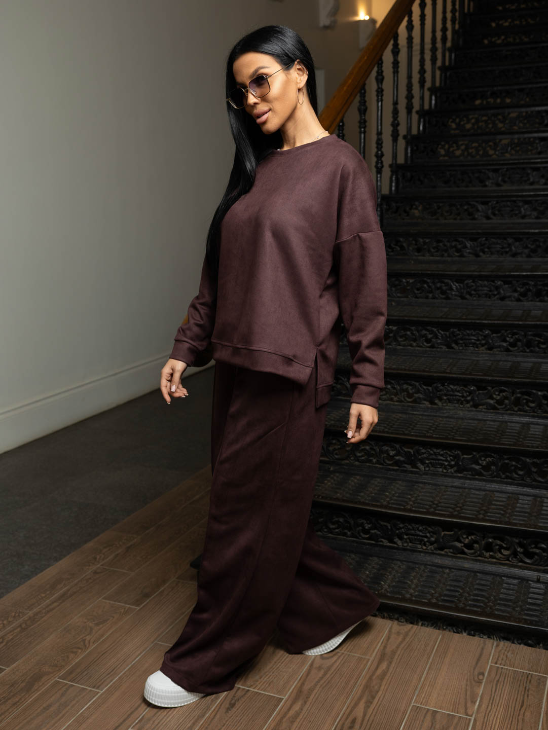 Почувствуйте себя королевой комфорта и стиля с нашим новым брючным костюмом! Двойка выполнена из мягкой и приятной на ощупь замши – прекрасный выбор на весну и осень. Оверсайз крой свитшота скрывает недостатки фигуры, разрезы по бокам и удлиненная спинка придают изюминку образу. А свободные штаны палаццо со стрелками – настоящая находка для современной девушки. Качественная одежда в стиле спорт-шик дарит уверенность себе и отличное настроение!