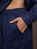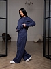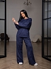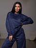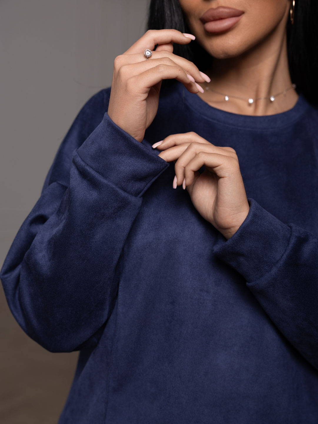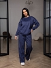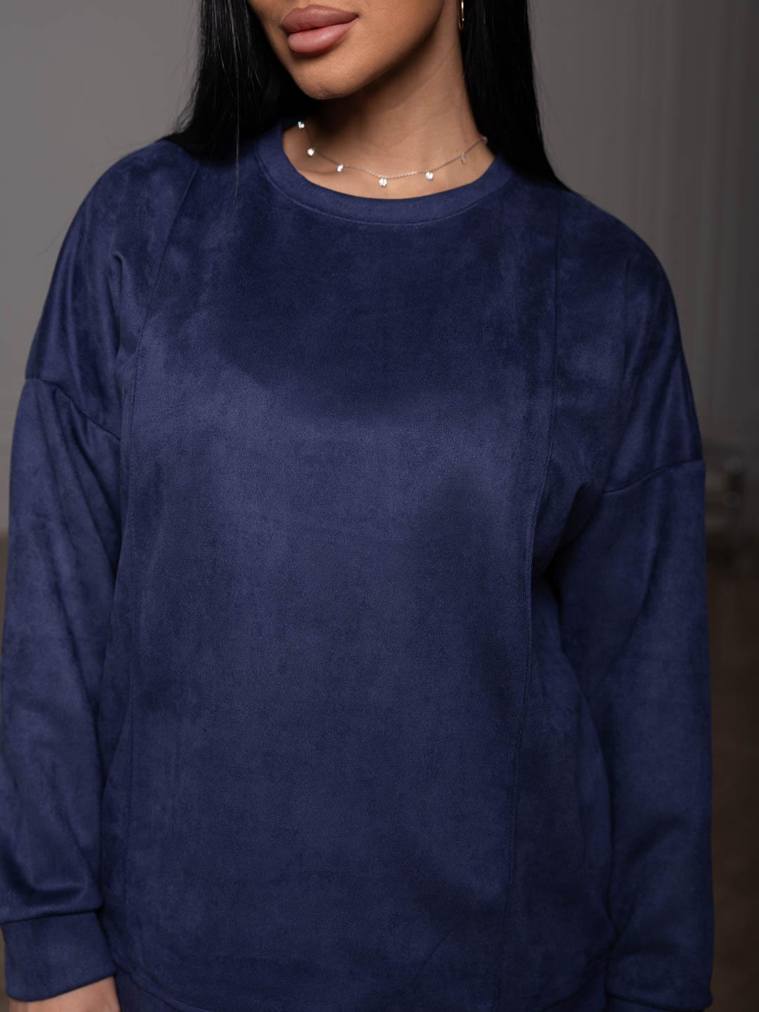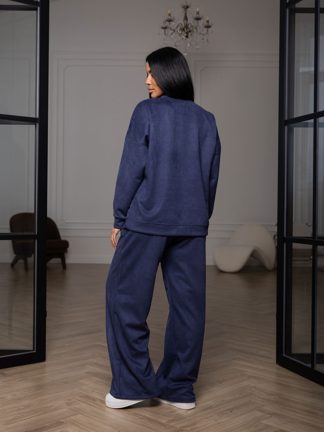 Брючный замшевый костюм из качественного приятного на ощупь полотна. Толстовка выполнена в стиле спорт шик со спущенным плечом, О-образной горловиной, стрелками на полочке и манжетой по низу изделия и рукаву. Брюки прямого кроя, со стрелками и карманами в боковых швах, полной длины.