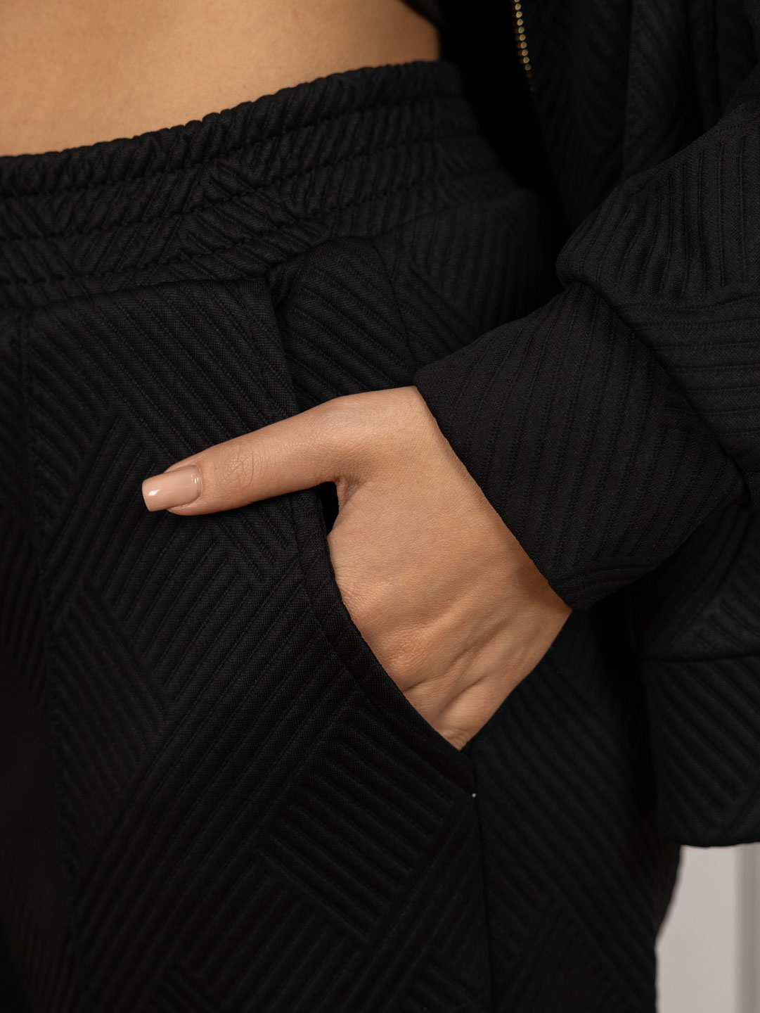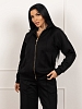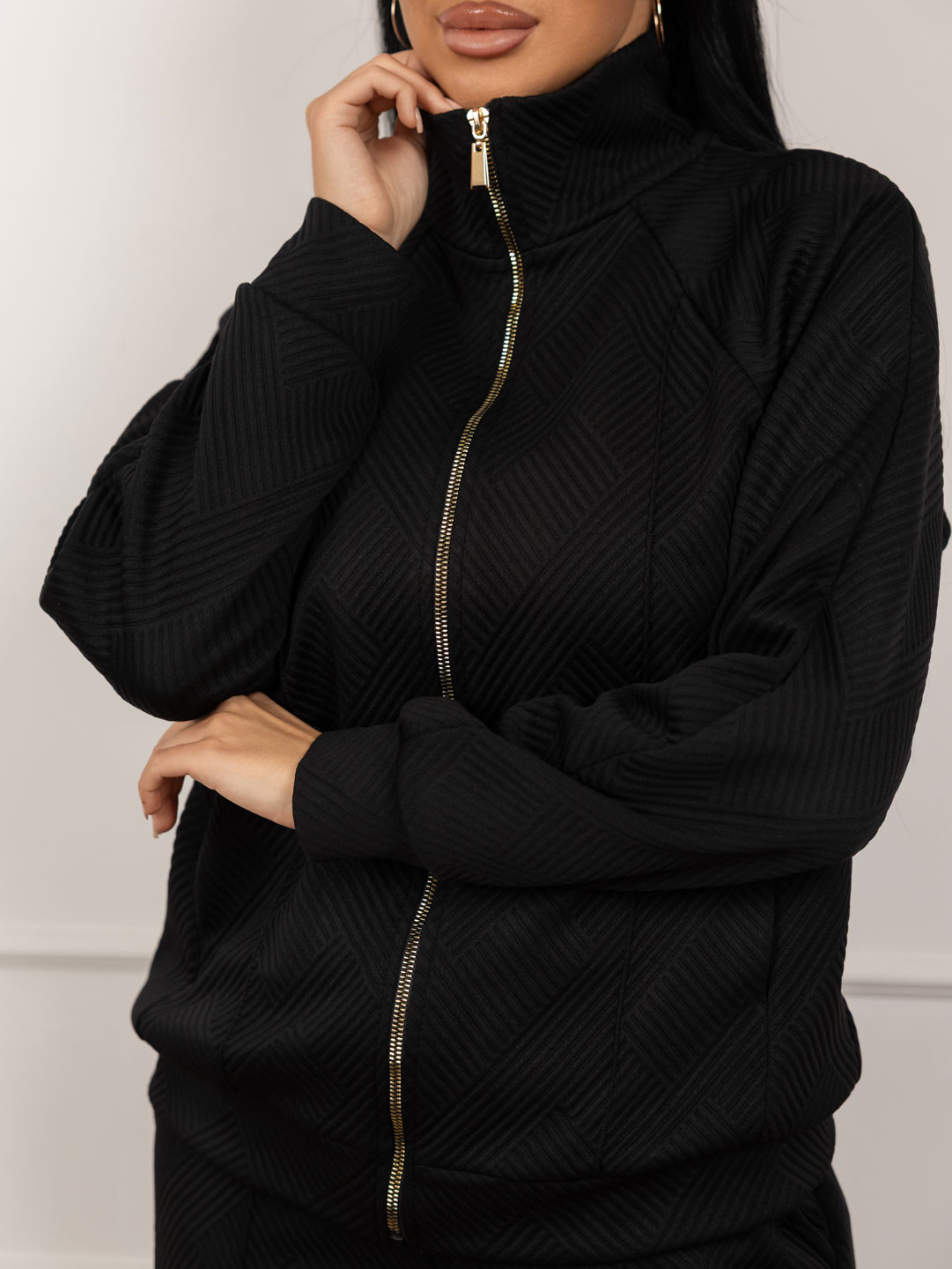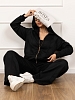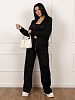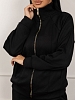 Женский костюм с брюками палаццо из фактурной ткани. Толстовка на молнии с рельефами, декоративной отстрочкой, карманами в рельефах и рукавом реглан. Брюки со стрелками, на поясе с несколькими отстрочками и карманами в боковых швах.