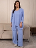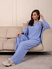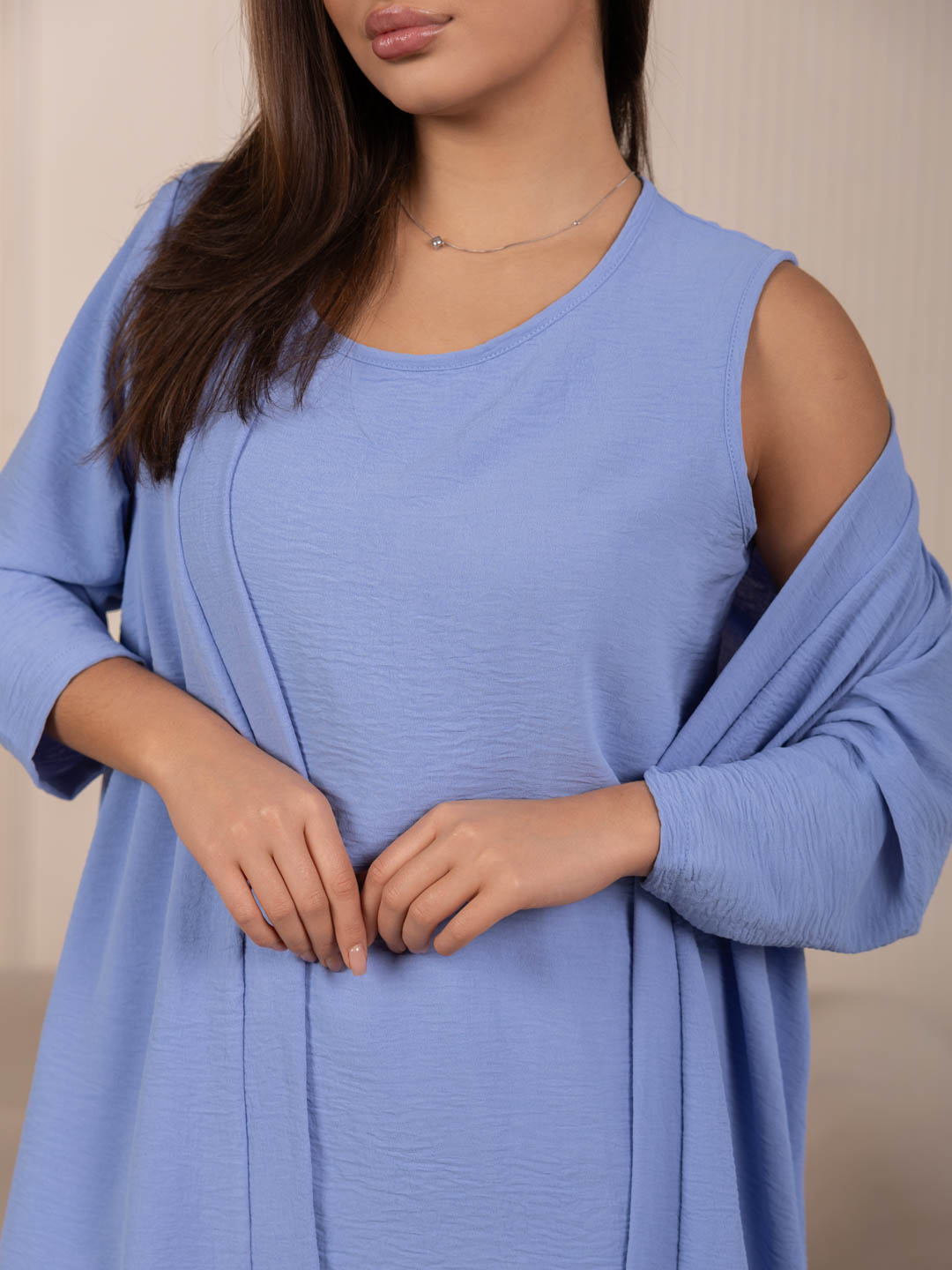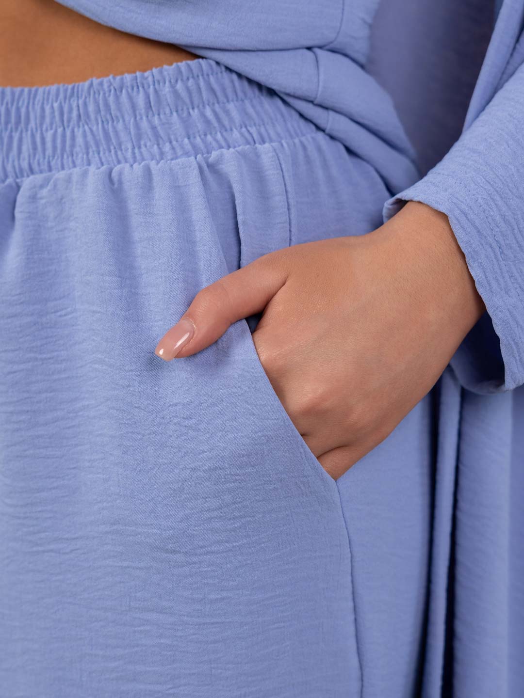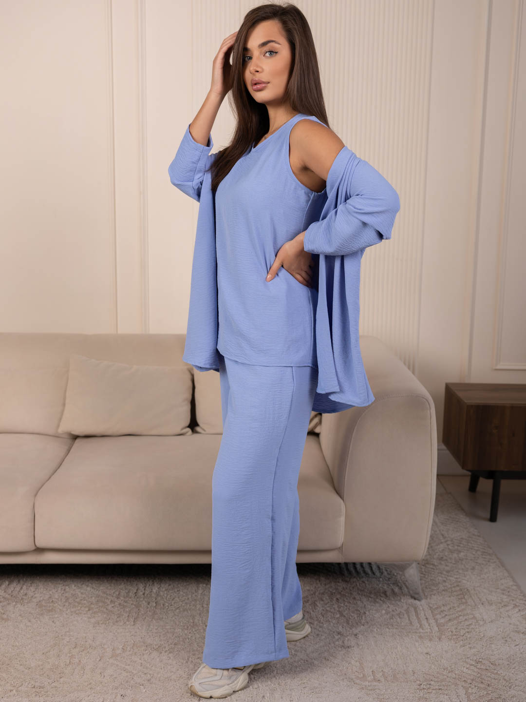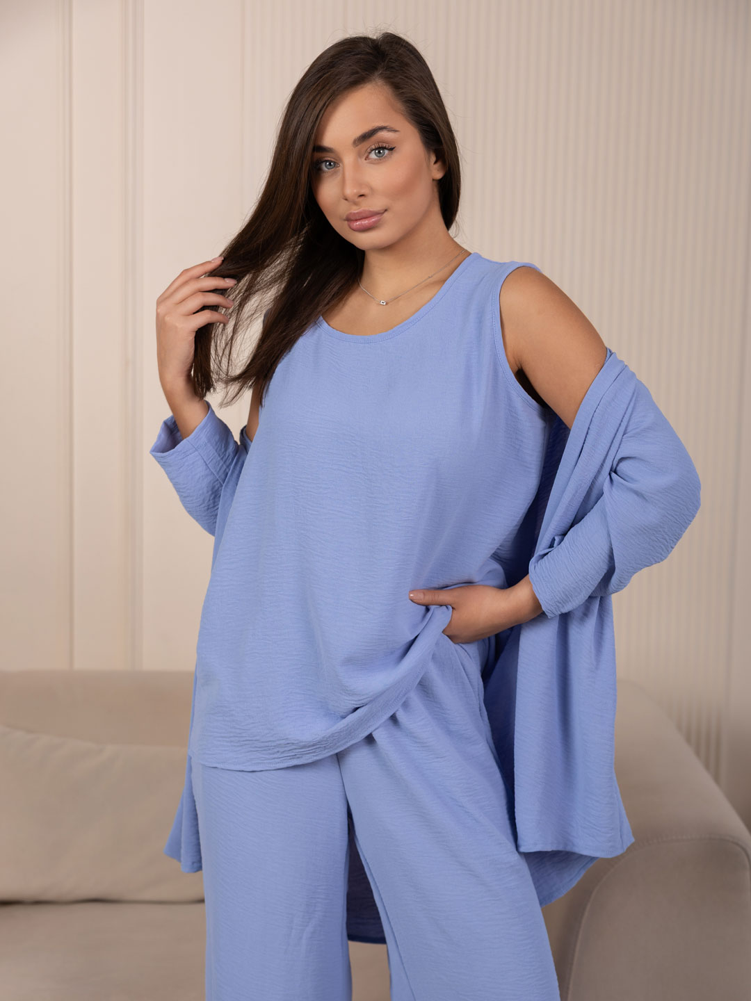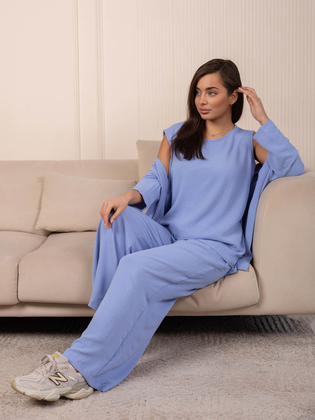 Летний женский костюм-тройка: стильное кимоно, майка и свободные брюки. Майка без рукавов, с О-образной горловиной, длиной до середины бедра. Накидка-кимоно с втачным рукавом длиной 3/4. Брюки палаццо с карманами в боковых швах и поясом с эластичной резинкой и отстрочкой на поясной машине.