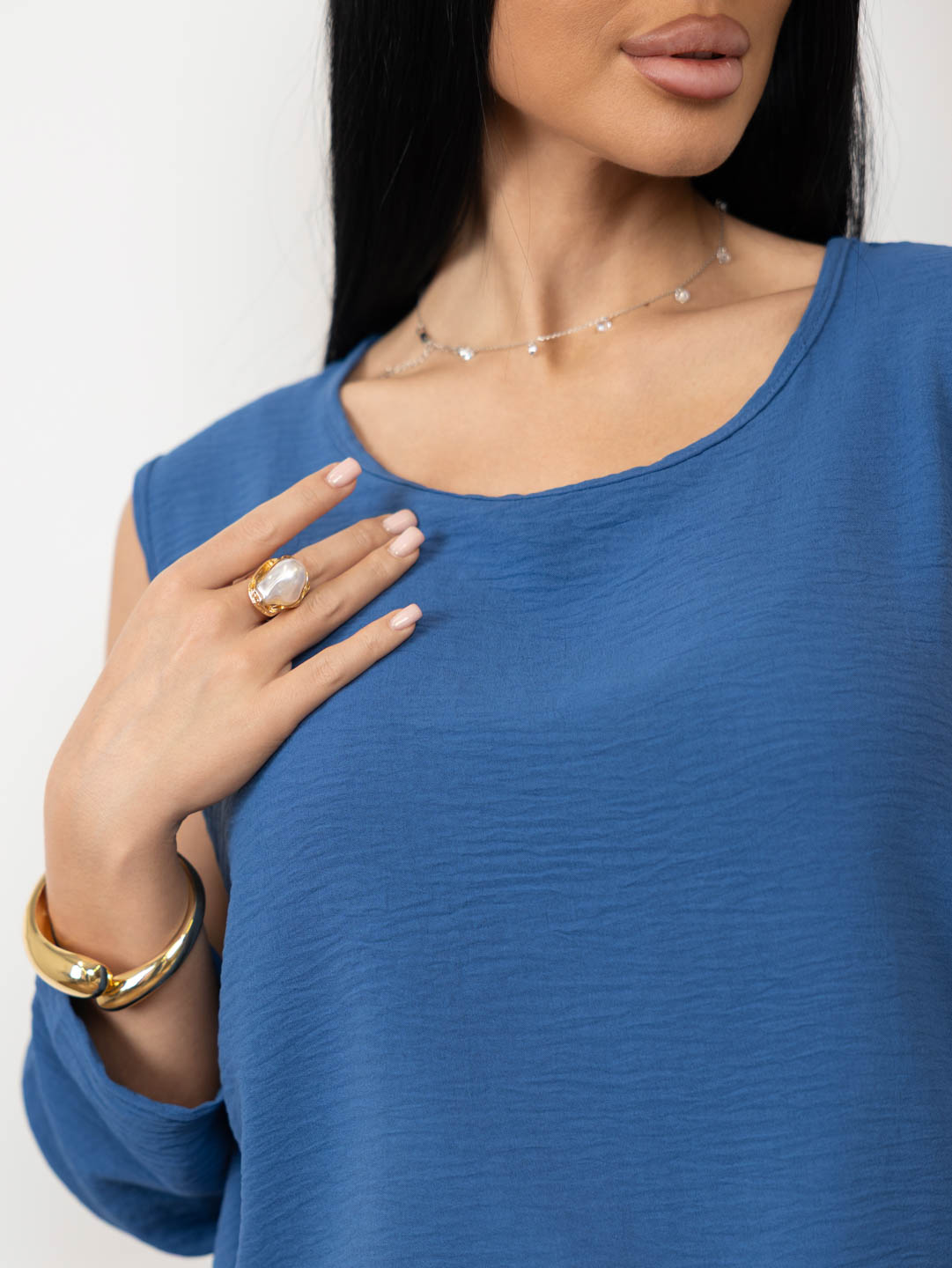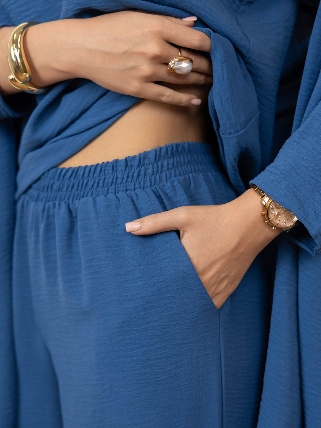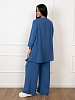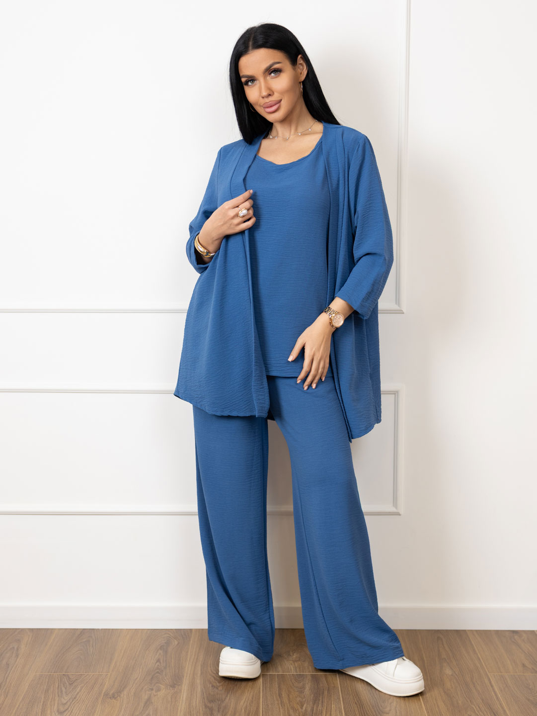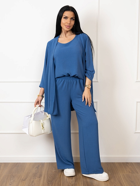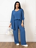 Летний женский костюм-тройка: стильное кимоно, майка и свободные брюки. Майка без рукавов, с О-образной горловиной, длиной до середины бедра. Накидка-кимоно с втачным рукавом длиной 3/4. Брюки палаццо с карманами в боковых швах и поясом с эластичной резинкой и отстрочкой на поясной машине.