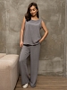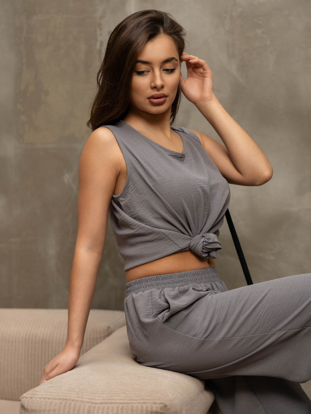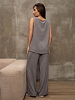 Брючный костюм из легкого, воздушного материала с легким жатым эффектом. Майка с О-образной горловиной, до середины бедра. Брюки палаццо с карманами, поясом на резинке и несколькими декоративными строчками. Рост модели 167см.