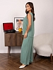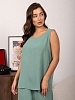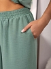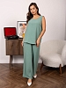 Брючный костюм из легкого, воздушного материала с легким жатым эффектом. Майка с О-образной горловиной, до середины бедра. Брюки палаццо с карманами, поясом на резинке и несколькими декоративными строчками. Рост модели 167см.