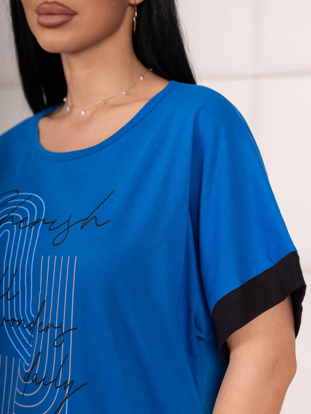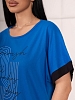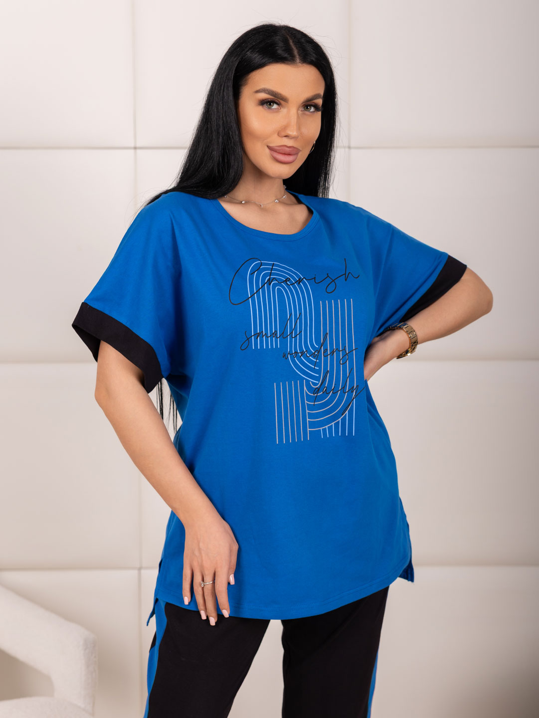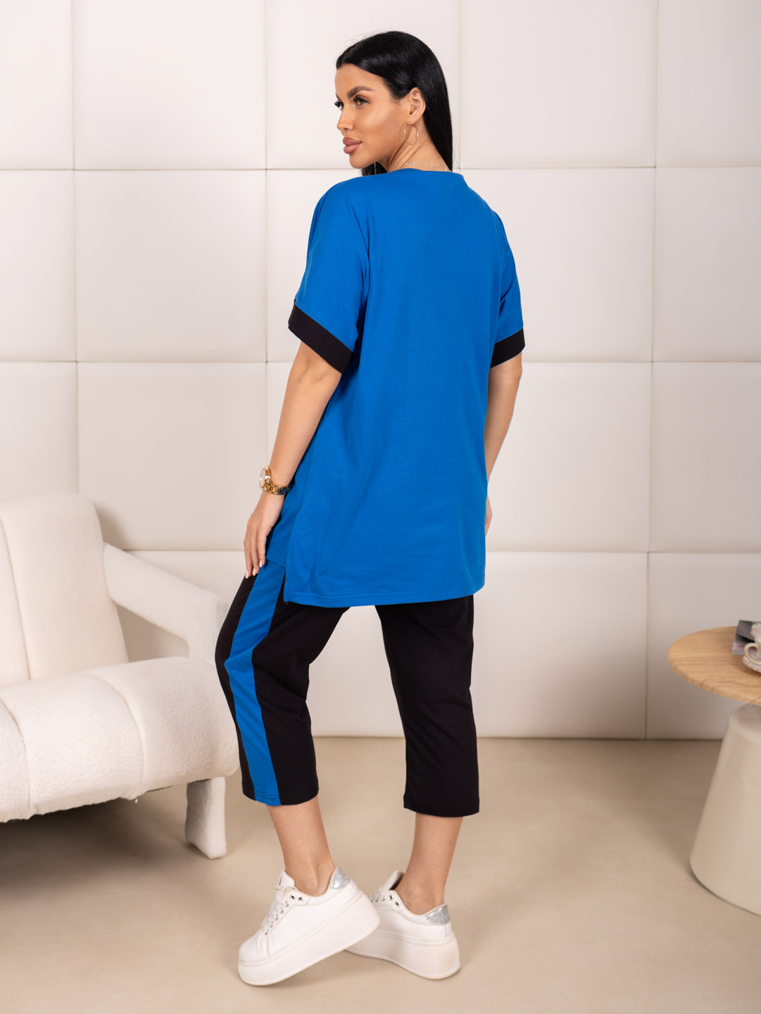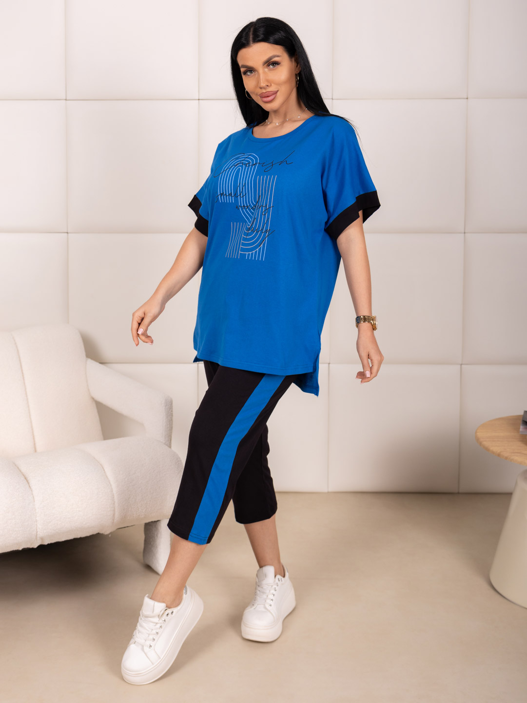 Дачный костюм женский из хлопка. Футболка с цельнокроеным рукавом, О-образной горловиной, контрастной манжетой и печатью на полочке. Бриджи с лампасами в цвет верха c карманами в боковых швах.