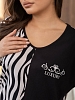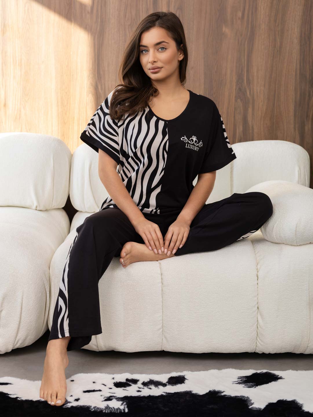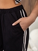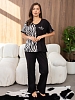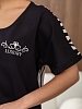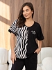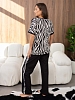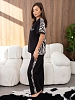 Женский костюм из хлопка. Футболка с цельнокроеным рукавом, манжетой, спереди печать на полочке с одной стороны и V-образным вырезом. Брюки с лампасами и карманами в боковых швах.