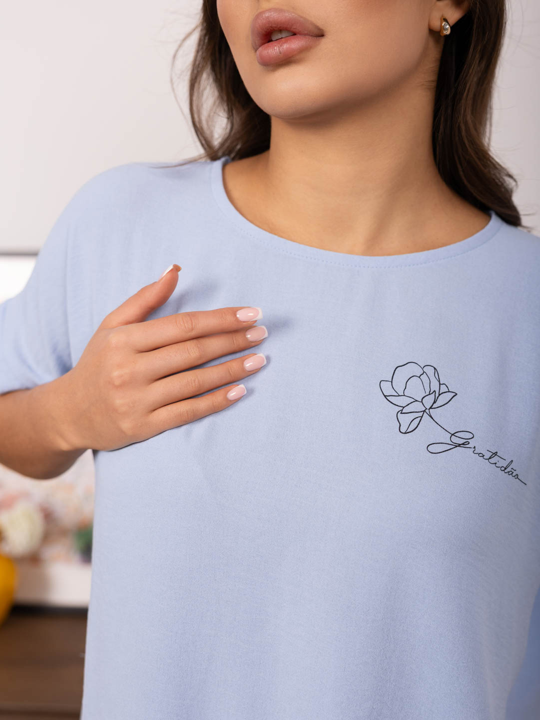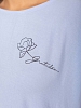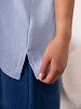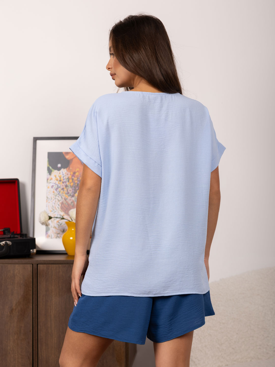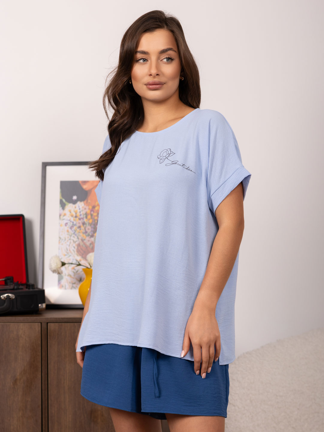 Костюм из жатки с шортами, комбинированный. Верх футболка со спущенным плечом, О-образной горловиной, разрезами в боковых швах и лаконичной печатью спереди. Шорты свободной формы, со шнурком и карманами в боковых швах.