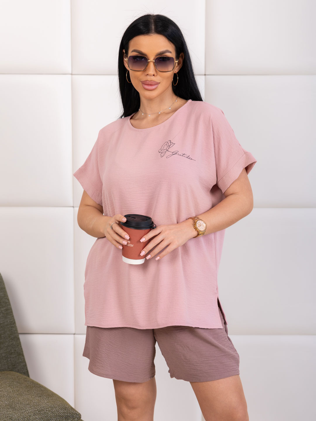 Костюм из жатки с шортами, комбинированный. Верх футболка со спущенным плечом, О-образной горловиной, разрезами в боковых швах и лаконичной печатью спереди. Шорты свободной формы, со шнурком и карманами в боковых швах.