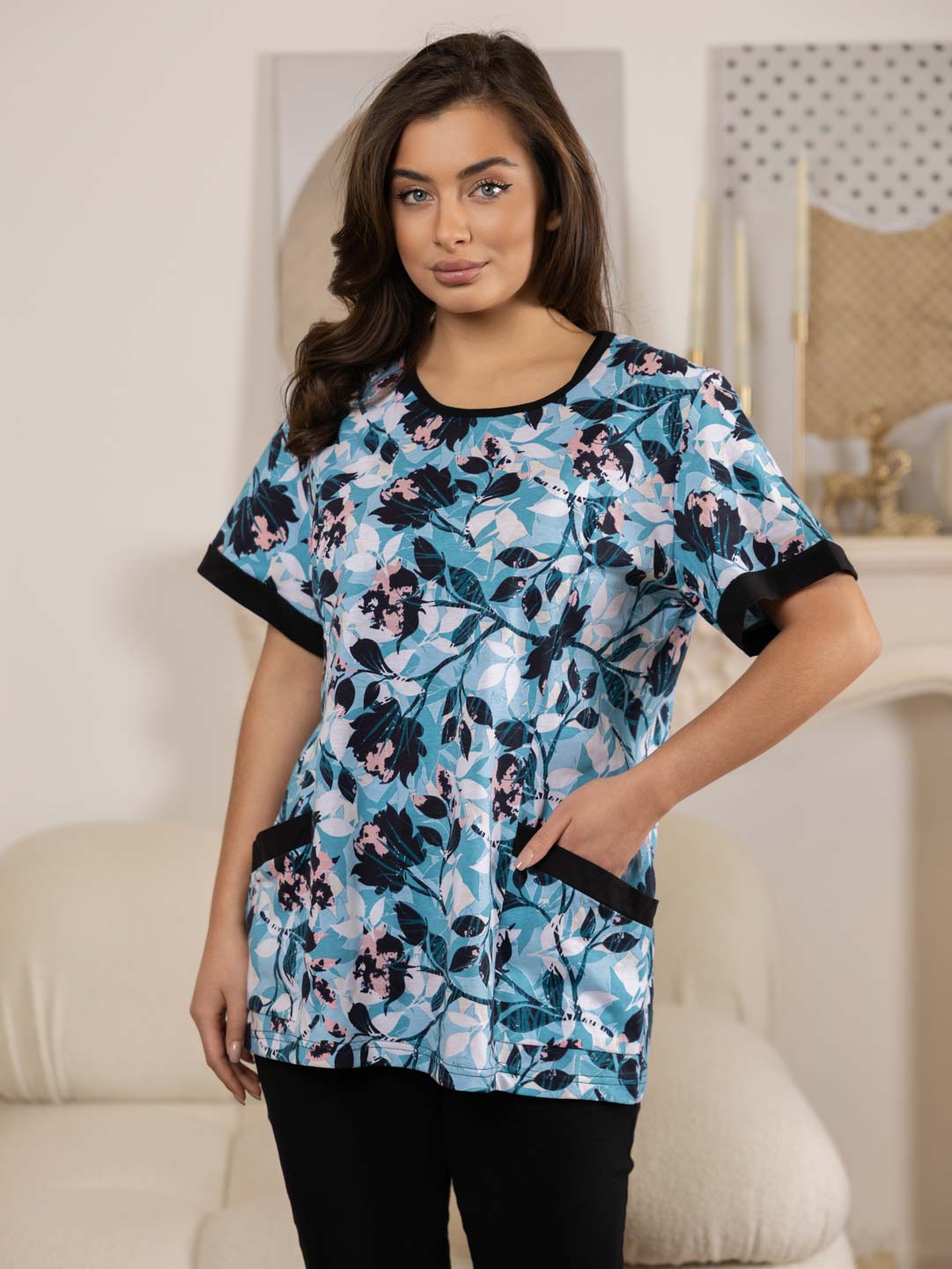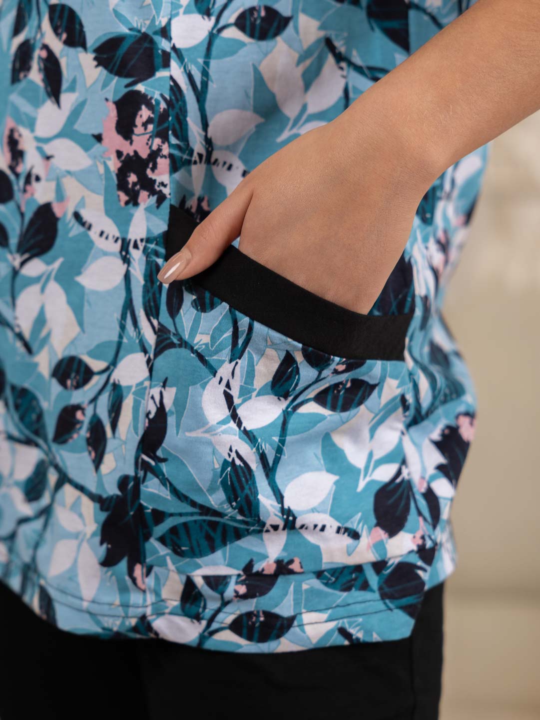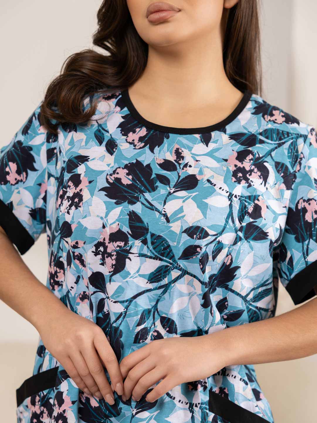 Костюм женский из комбинированного трикотажного полотна, состоящий из бридж и кофты. Кофта полуприлегающего силуэта длинной чуть ниже уровня бёдер из набивного трикотажного полотна с отделкой в цвет бридж. Полочка с рельефами и двумя накладными карманами, на которых имеются планки из отделочного материала. Рукав втачной короткий. Вырез горловины О-образный. Бриджи из однотонного трикотажного полотна длинной ниже уровня колена.