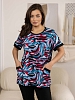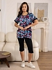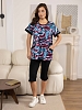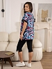 Костюм женский из комбинированного трикотажного полотна, состоящий из бридж и кофты. Кофта полуприлегающего силуэта длинной чуть ниже уровня бёдер из набивного трикотажного полотна с отделкой в цвет бридж. Полочка с рельефами и двумя накладными карманами, на которых имеются планки из отделочного материала. Рукав втачной короткий. Вырез горловины О-образный. Бриджи из однотонного трикотажного полотна длинной ниже уровня колена.